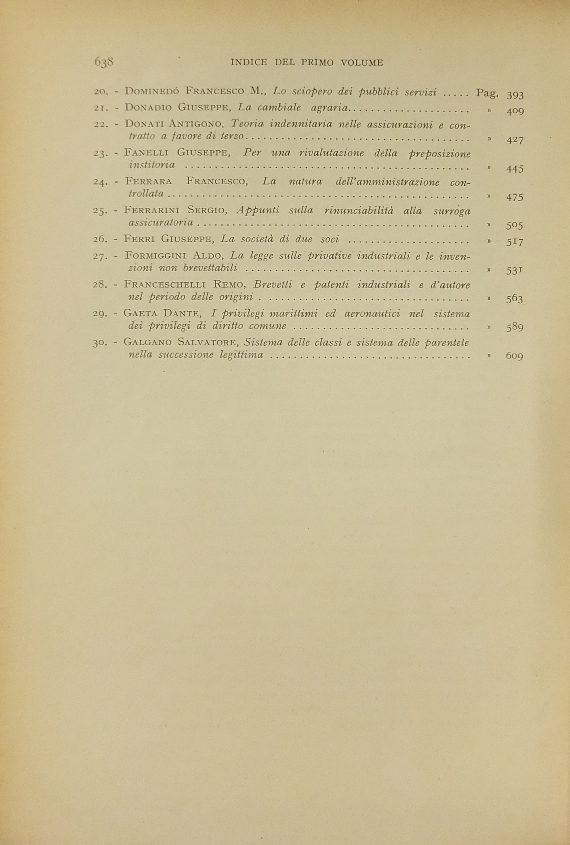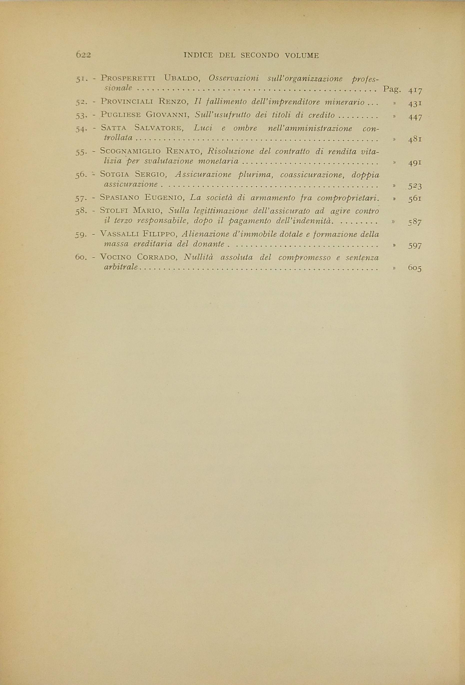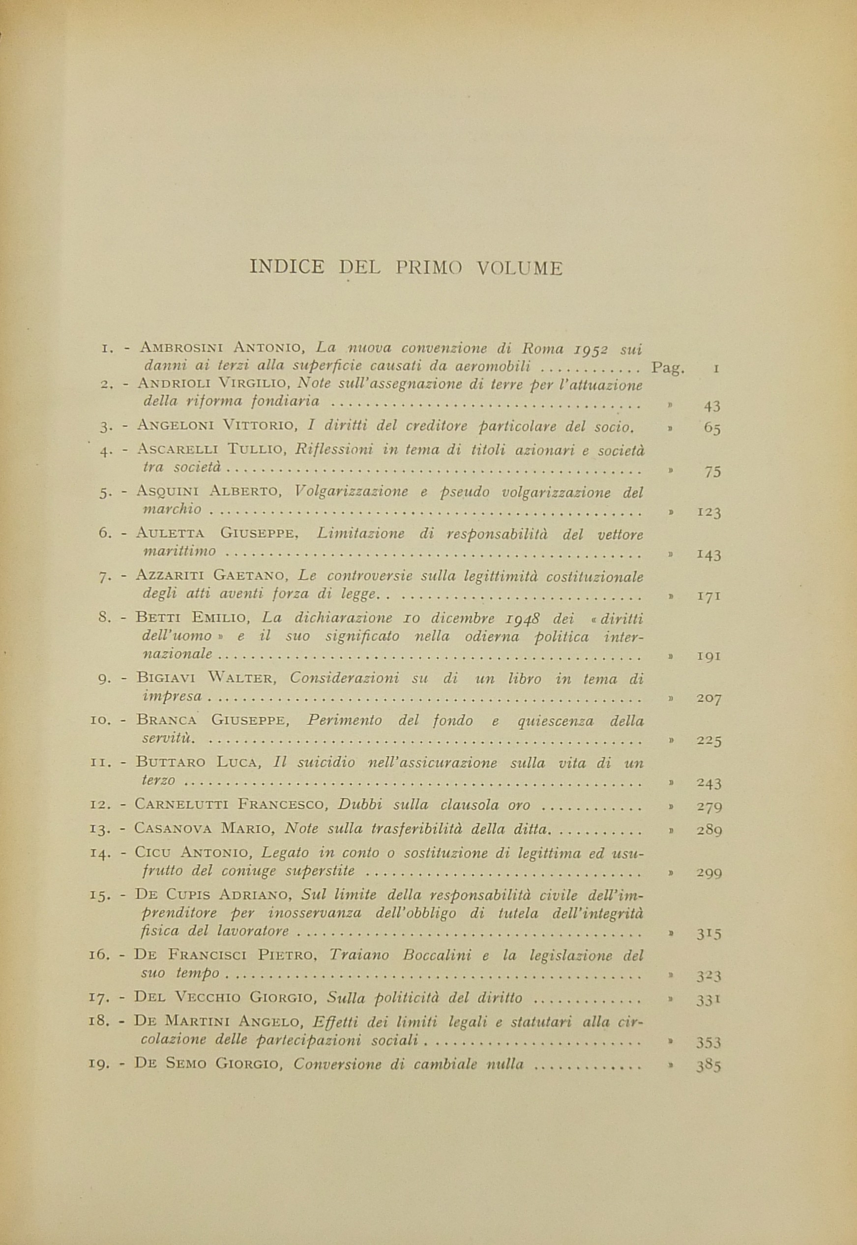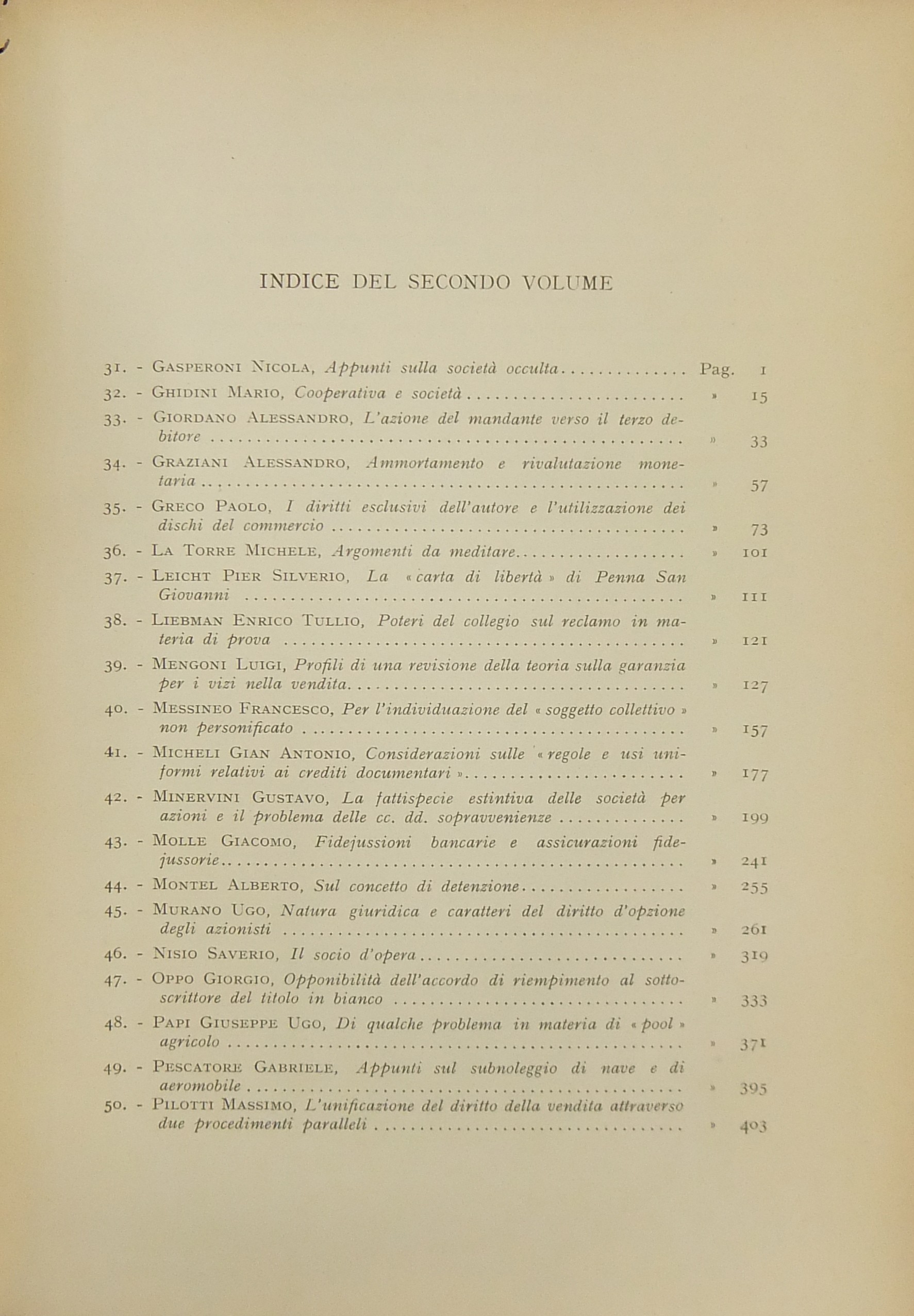 Scritti di: G.Ambrosini, Andrioli, Angeloni, Ascarelli, Asquini, G.Auletta, Azzariti, Betti, Bigiavi, Branca, Buttaro, Carnelutti, Casanova, Cicu, De Cupis, De Francisci, Giorgio Del Vecchio, De Martini, De Semo, Dominedò, Donadio, A. Donati, Fanelli, F. Ferrara, Ferrarini, G. Ferri, Formiggini, R. Franceschelli, Gaeta, Galgano, Gasperoni, Ghidini, Giordano, Graziani, P. Greco, La Torre, Leicht, E. T. Liebman, Mengoni, Messineo, Micheli, Minervini, Molle, Montel, Murano, Nisio, Oppo, Papi, G. Pescatore, Pilotti, U. Prosperetti, Provinciali, G. Pugliese, S. Satta, Scognamiglio, Sotgia, Spasiano, M. Stolfi, F. Vassalli, Vocino.