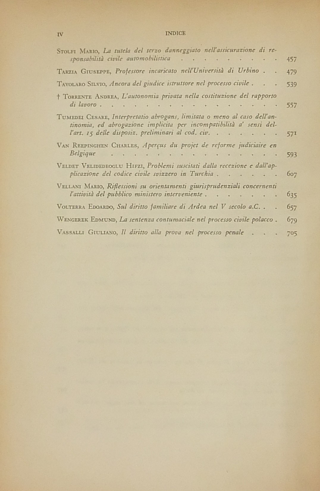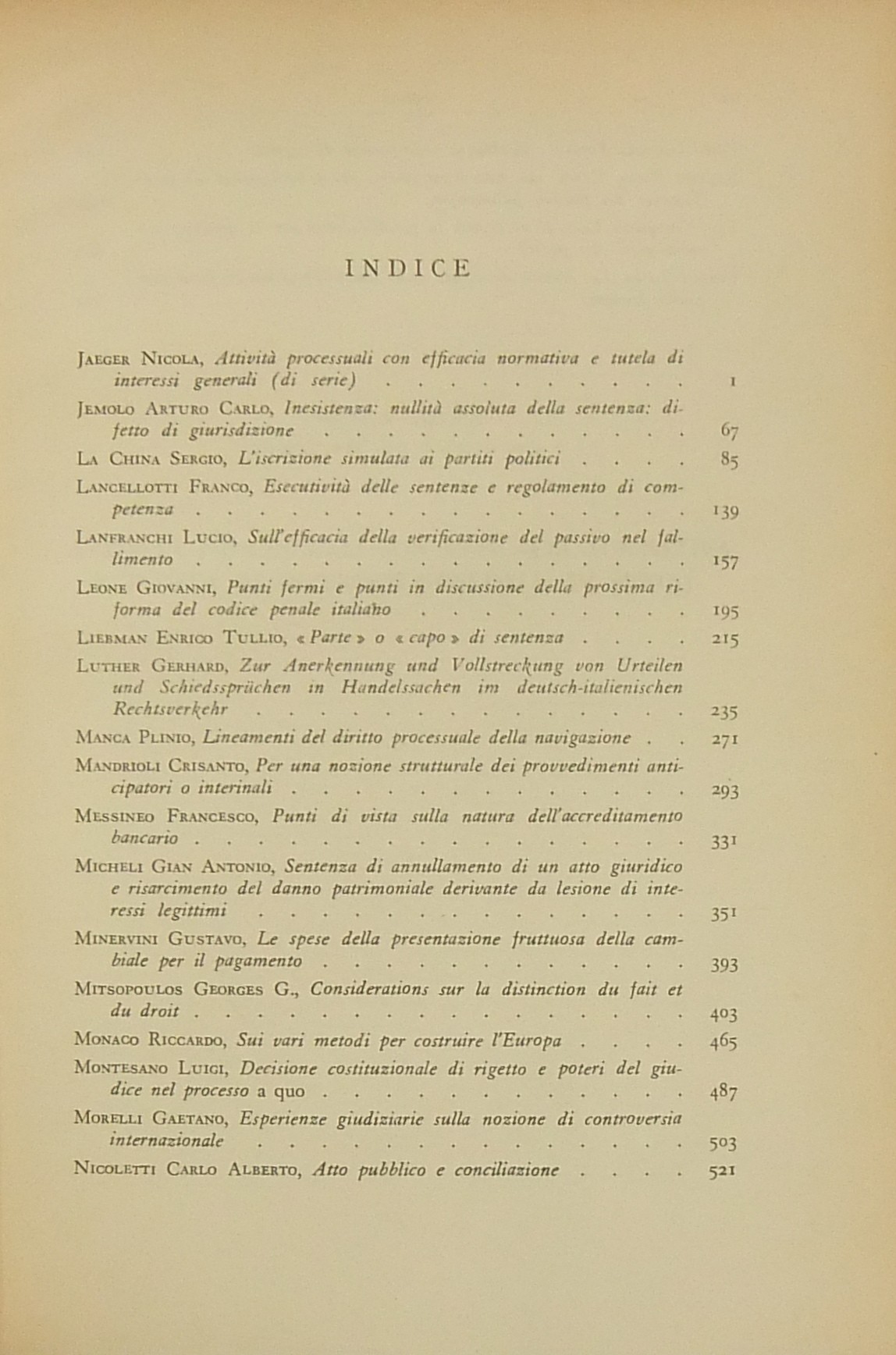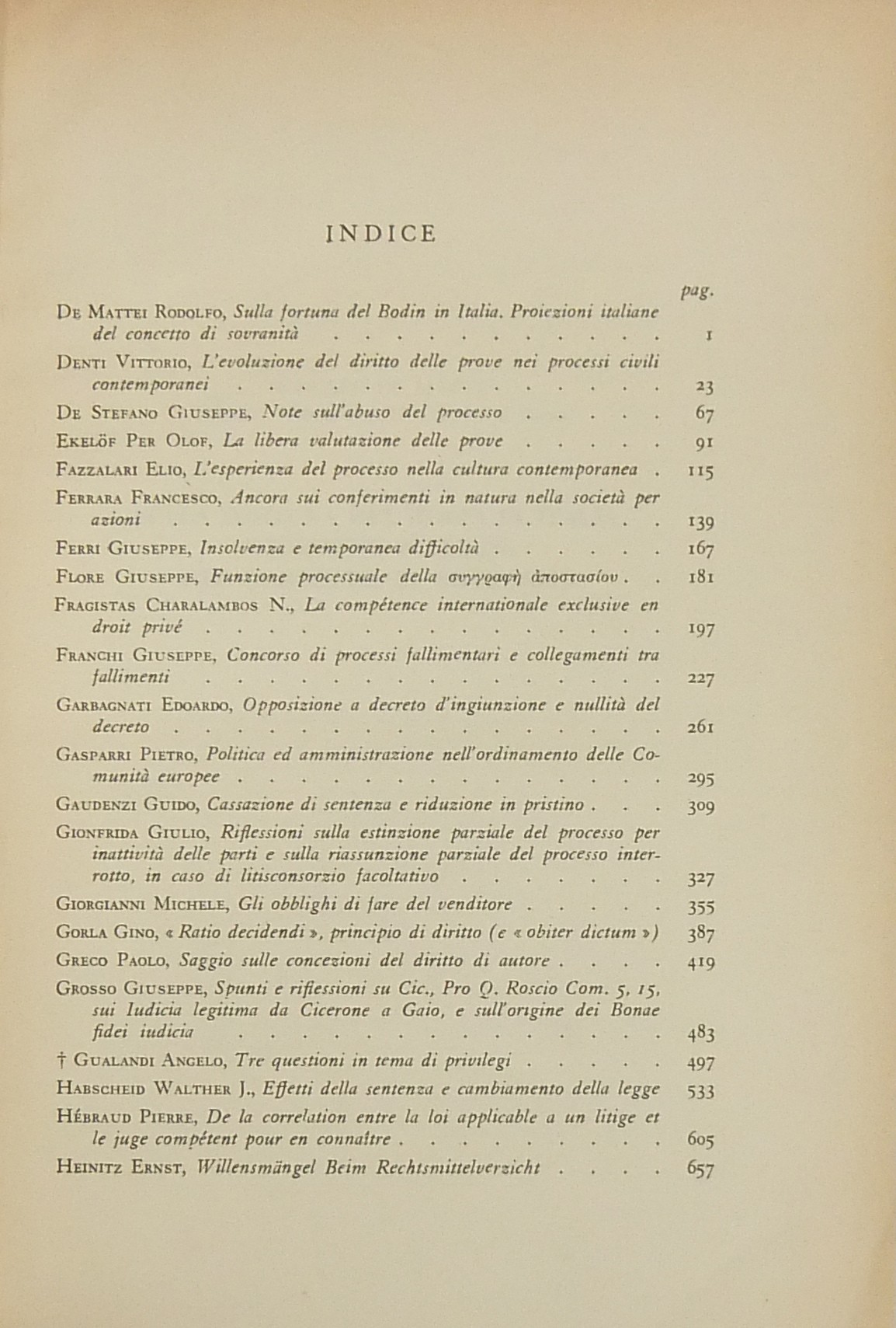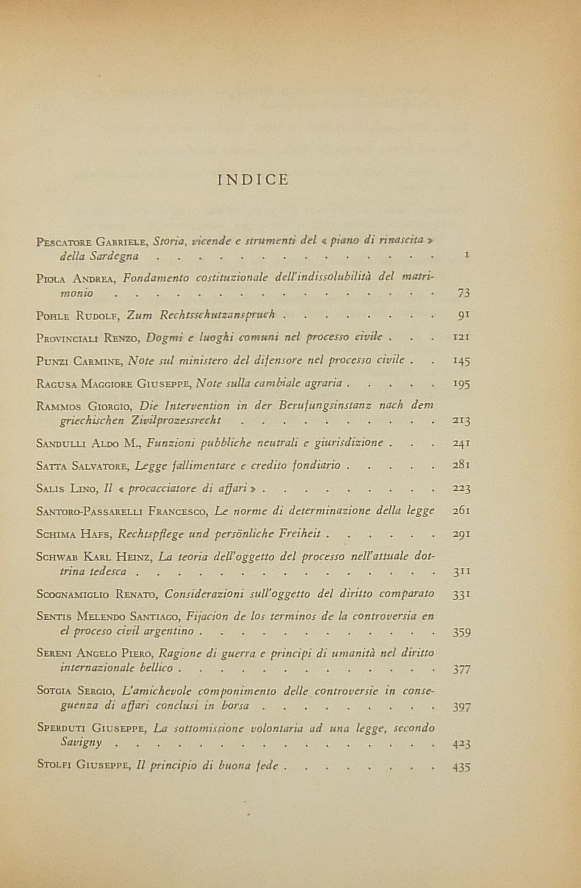 Ritratto fotografico di Antonio Segni all’inizio del primo volume. Scritti di: Ambrosetti, Ambrosini, Andrioli, Angeloni, Asquini, Attardi, Bassano, Berri, Betti, Bettiol, Bigiavi, B.Biondi, P.Biondi, Blagojevic, Bobbio, Bonsignori, Branca, Broniewicz, Candian, Cappelletti, Cariota Ferrara, Casanova, Cesarini Sforza, Coing, Conso, Cosciani, Costa, De Dominicis, De Francisci, Del Giudice, De Mattei, Denti, De Stefano, Ekelof, Fazzalari, F.Ferrara, G.Ferri, Flore, Fragistas, Franchi, Garbagnati, Gasparri, Gaudenzi, Gionfrida, M.Giorgianni, Gorla, Greco, Grosso, Gualandi, Habscheid, Hébraud, Heinitz, Jaeger, Jemolo, La China, Lancellotti, Lanfranchi, G.Leone, Liebman, Luther, Manca, Mandrioli, Messineo, Micheli, Minervini, Mitsopoulos, R.Monaco, Montesano, Morelli, Nicoletti, Oppo, Pajardi, Papi, Perrot, Pescatore, Piola, Pohle, Provinciali, Punzi, Ragusa Maggiore, Rammos, Sandulli, Salis, Santoro Passarelli, Satta, Schima, Schwab, Scognamiglio, Sentis Melendo, Sereni, Sotgia, Sperduti, G.Stolfi, M.Stolfi, Tarzia, Tavolaro, Torrente, Tumedei, Van Reepinghen, G.Vassalli, Veldet, Velidedeoglu, Vellani, Volterra, Wengerek.