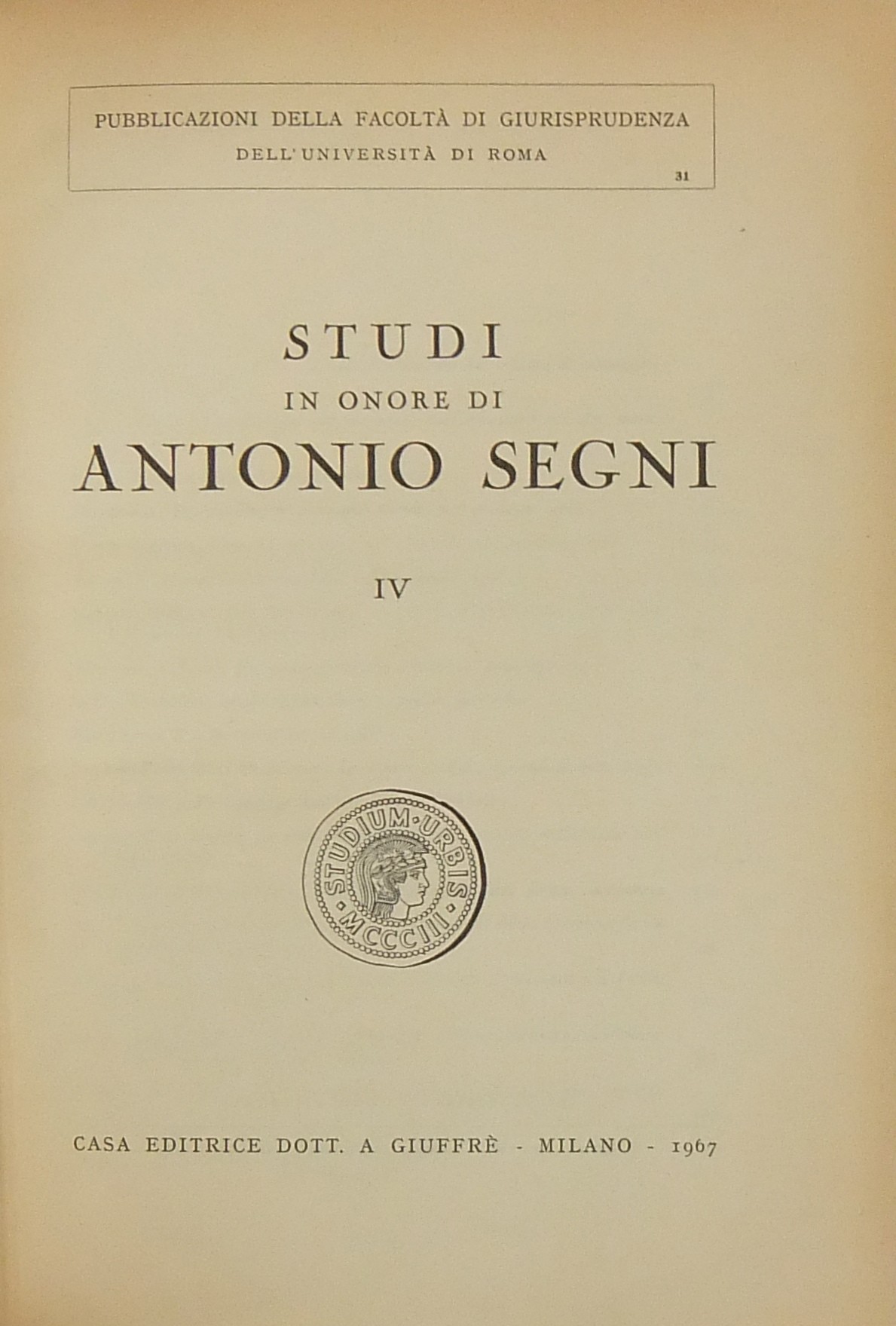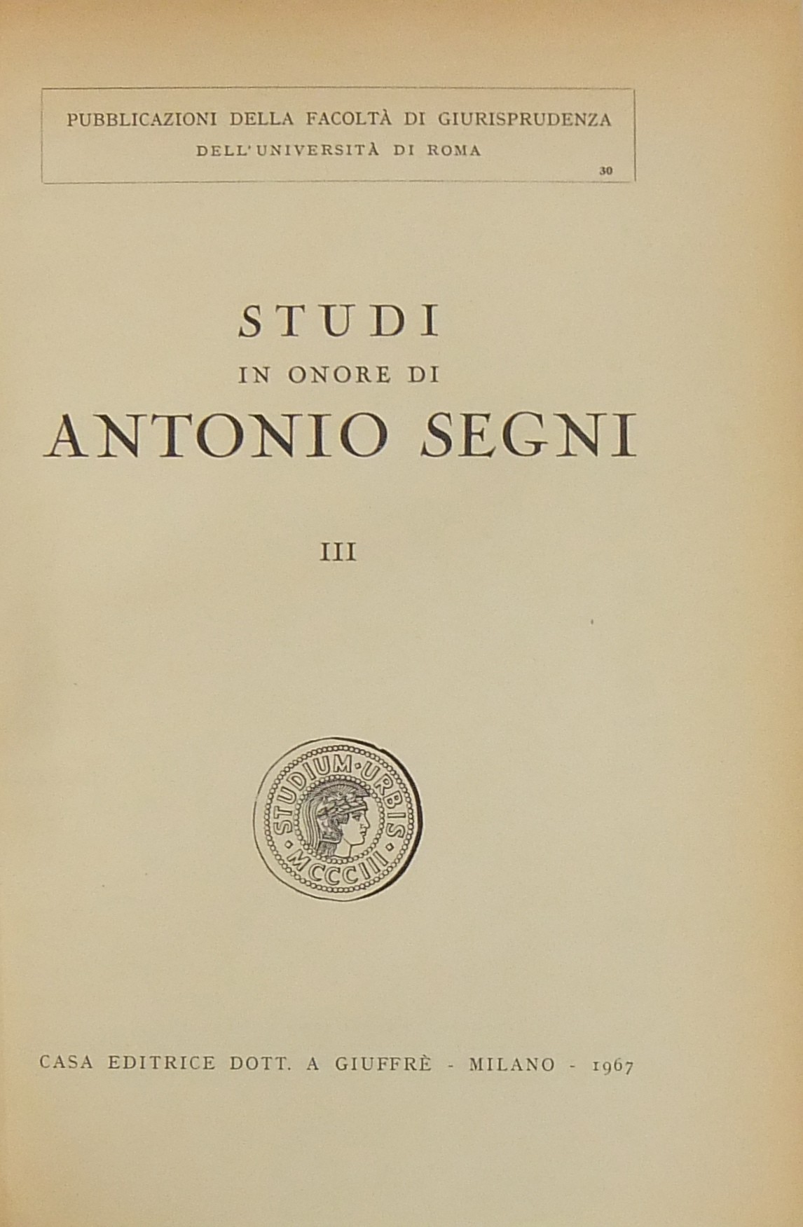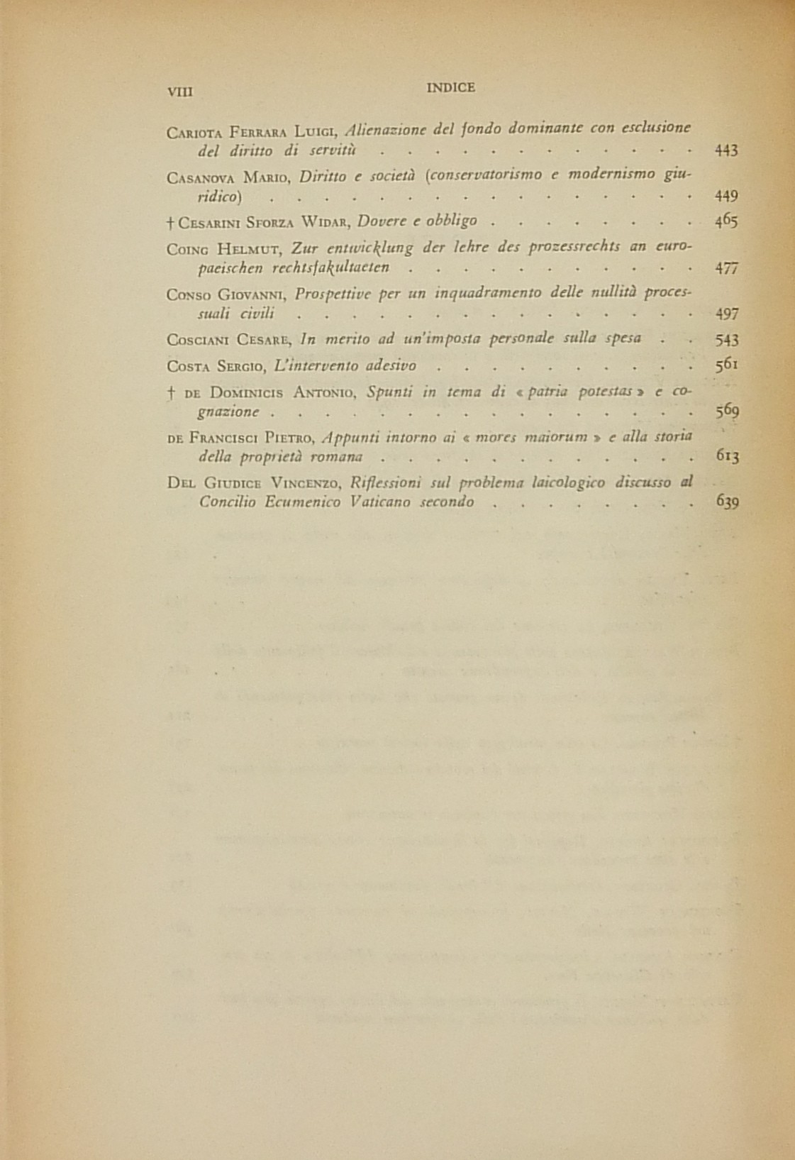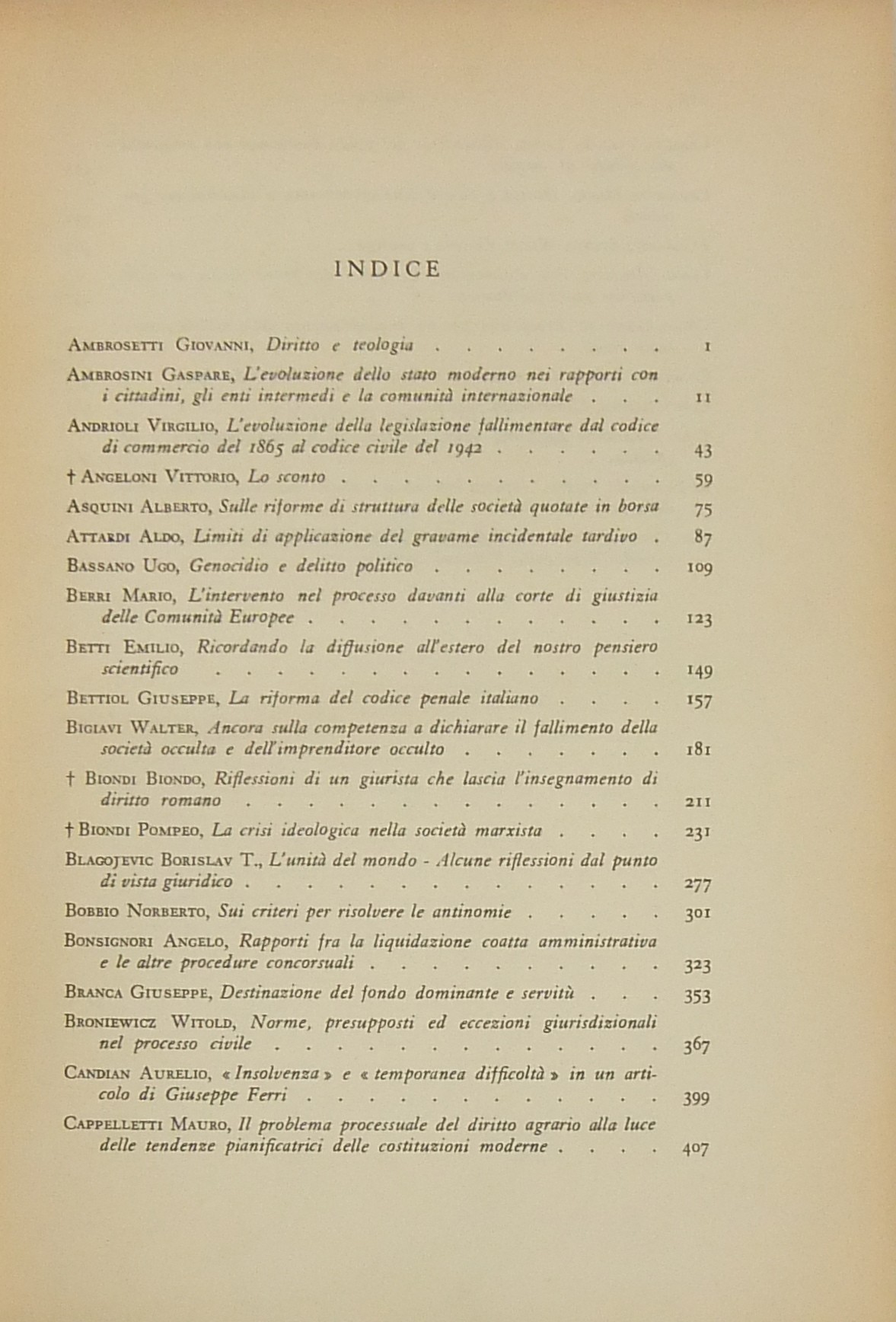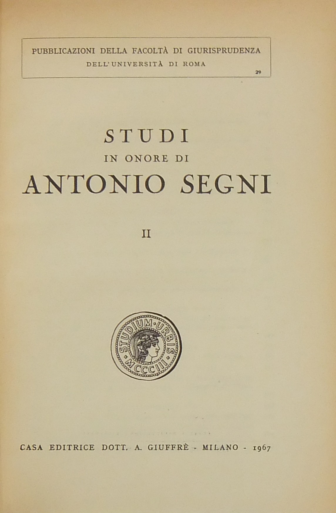 Ritratto fotografico di Antonio Segni all’inizio del primo volume. Scritti di: Ambrosetti, Ambrosini, Andrioli, Angeloni, Asquini, Attardi, Bassano, Berri, Betti, Bettiol, Bigiavi, B.Biondi, P.Biondi, Blagojevic, Bobbio, Bonsignori, Branca, Broniewicz, Candian, Cappelletti, Cariota Ferrara, Casanova, Cesarini Sforza, Coing, Conso, Cosciani, Costa, De Dominicis, De Francisci, Del Giudice, De Mattei, Denti, De Stefano, Ekelof, Fazzalari, F.Ferrara, G.Ferri, Flore, Fragistas, Franchi, Garbagnati, Gasparri, Gaudenzi, Gionfrida, M.Giorgianni, Gorla, Greco, Grosso, Gualandi, Habscheid, Hébraud, Heinitz, Jaeger, Jemolo, La China, Lancellotti, Lanfranchi, G.Leone, Liebman, Luther, Manca, Mandrioli, Messineo, Micheli, Minervini, Mitsopoulos, R.Monaco, Montesano, Morelli, Nicoletti, Oppo, Pajardi, Papi, Perrot, Pescatore, Piola, Pohle, Provinciali, Punzi, Ragusa Maggiore, Rammos, Sandulli, Salis, Santoro Passarelli, Satta, Schima, Schwab, Scognamiglio, Sentis Melendo, Sereni, Sotgia, Sperduti, G.Stolfi, M.Stolfi, Tarzia, Tavolaro, Torrente, Tumedei, Van Reepinghen, G.Vassalli, Veldet, Velidedeoglu, Vellani, Volterra, Wengerek.