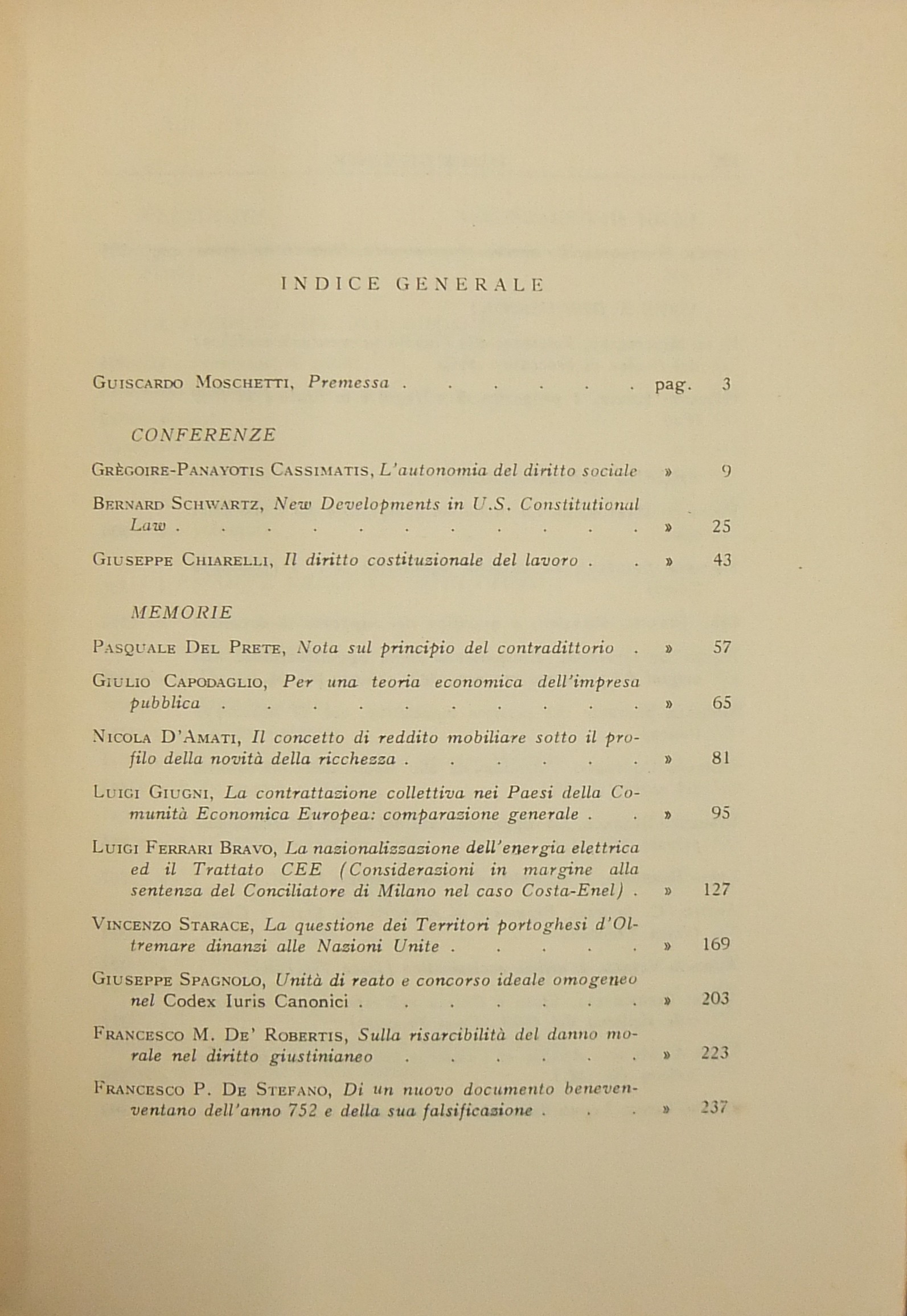 Scritti di: Barbiera, Battaglia, Capodaglio, Condorelli, Contento, Chiarelli, D'Amati, Del Prete, De' Robertis, De Stefano, Ferrari Bravo, Giugni, Jemolo, Lenti, Leone, Martorano, Montesano, Moschetti, Musca, Panayotis Cassimatis, Schwartz, Spagnolo, Spinelli, Starace, Vitale.