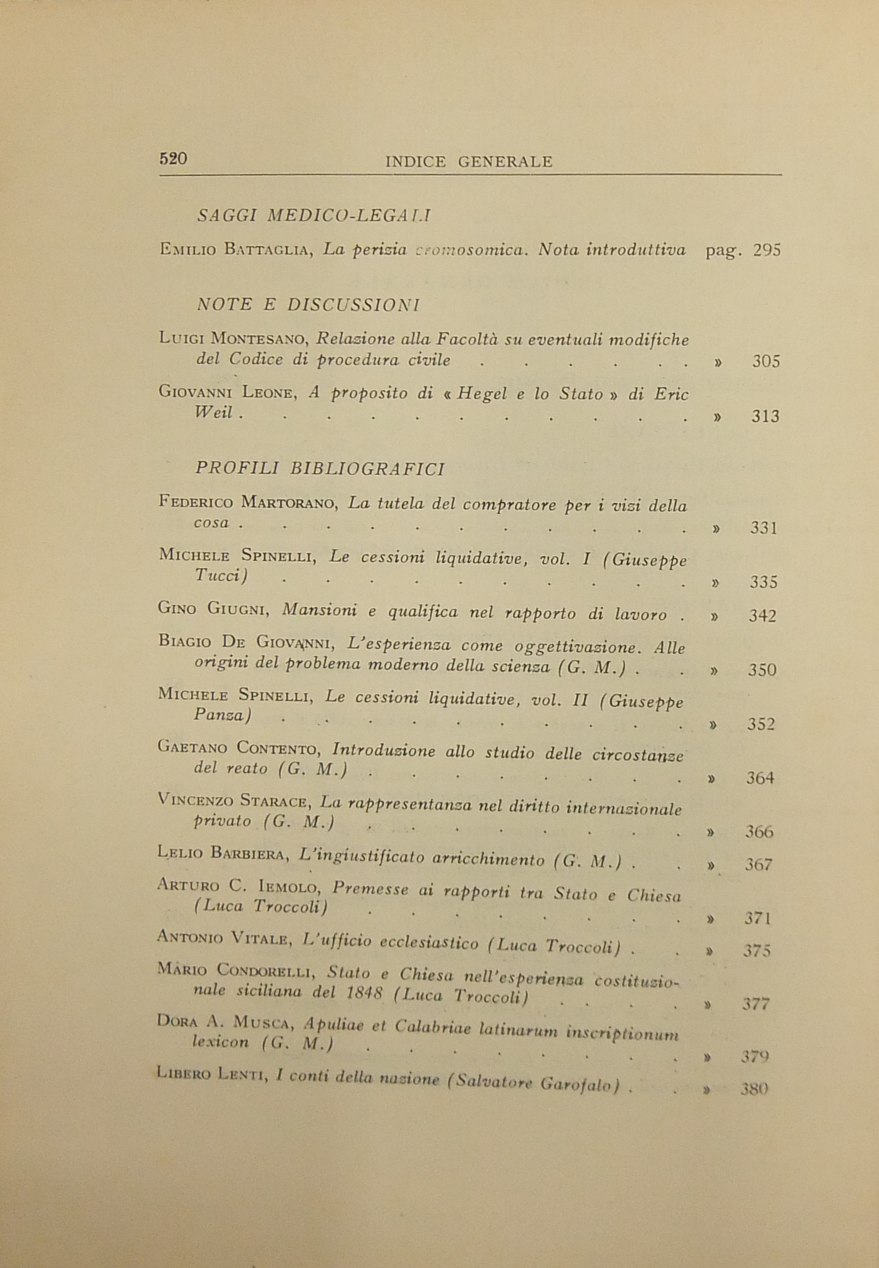 Scritti di: Barbiera, Battaglia, Capodaglio, Condorelli, Contento, Chiarelli, D’Amati, Del Prete, De’ Robertis, De Stefano, Ferrari Bravo, Giugni, Jemolo, Lenti, Leone, Martorano, Montesano, Moschetti, Musca, Panayotis Cassimatis, Schwartz, Spagnolo, Spinelli, Starace, Vitale.