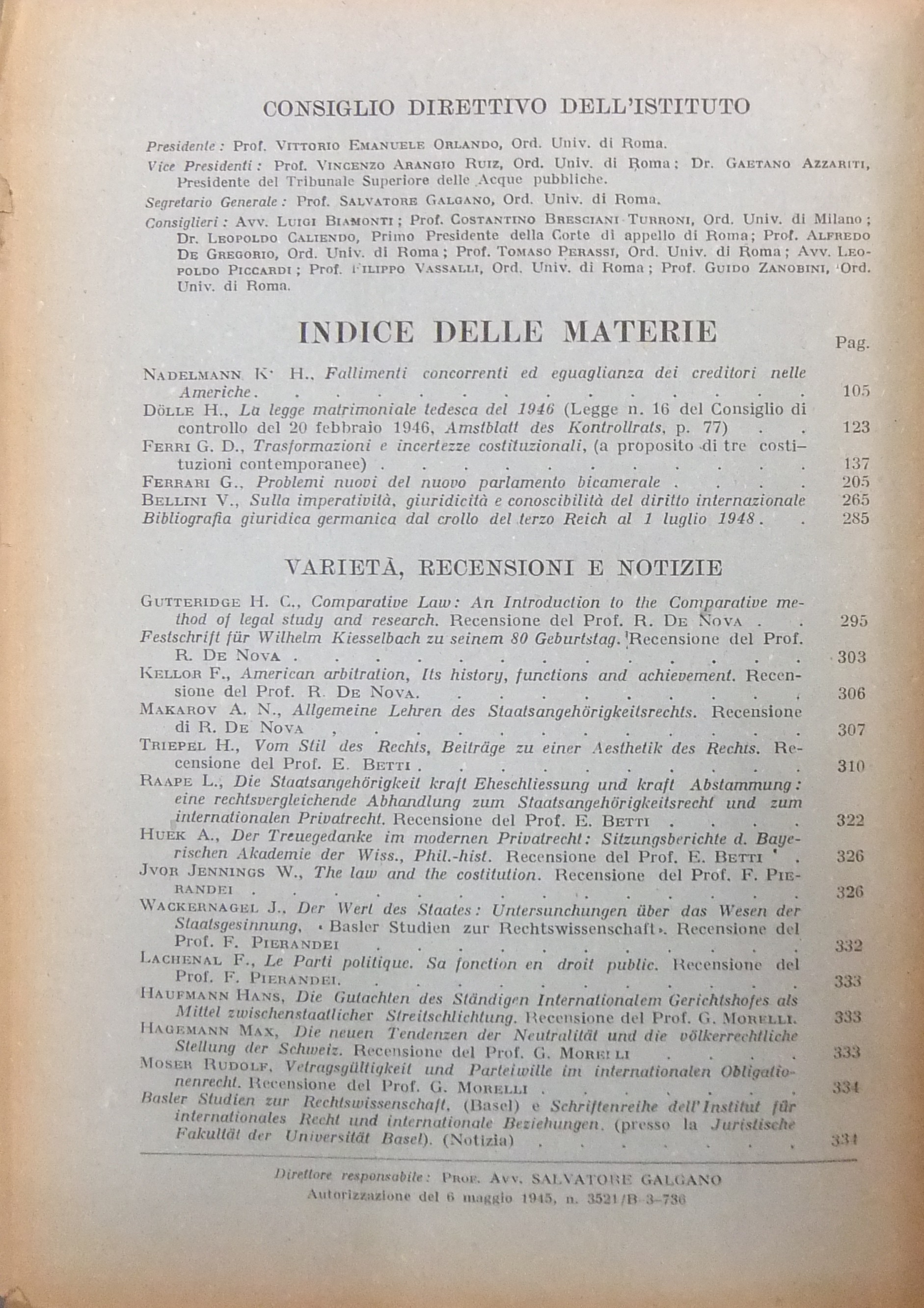 Consiglio direttivo: V.E. Orlando, V. Arangio Ruiz, G. Azzariti. Scritti di: A. Bellini, Dolle, G. Ferrari, G.D. Ferri, Nadelmann
