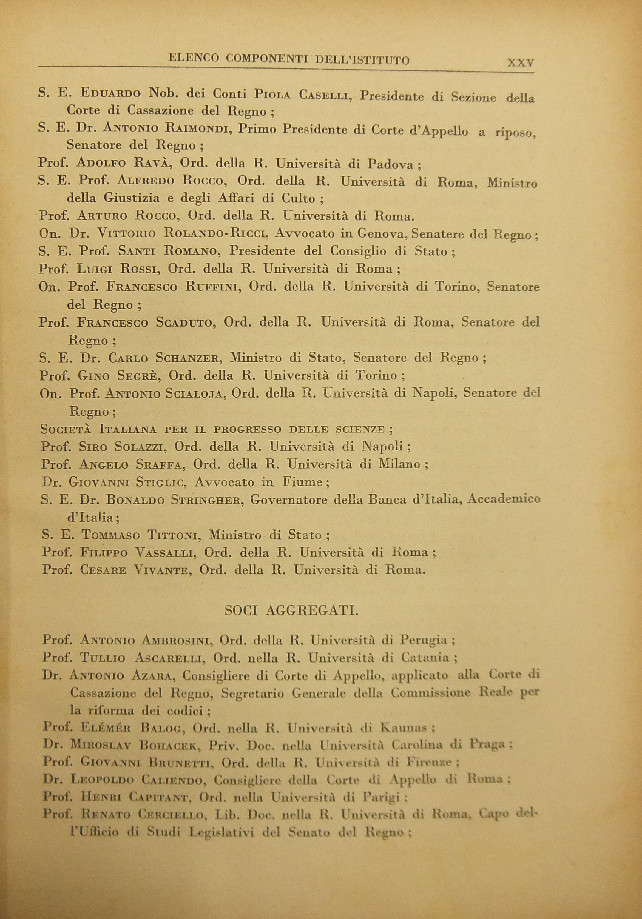 Consiglio direttivo: V. Scialoja, D’Amelio, Bonfante, S. Galgano, V. Arangio Ruiz, Benini, P. De Francisci, G. Del Vecchio, De Ruggiero.