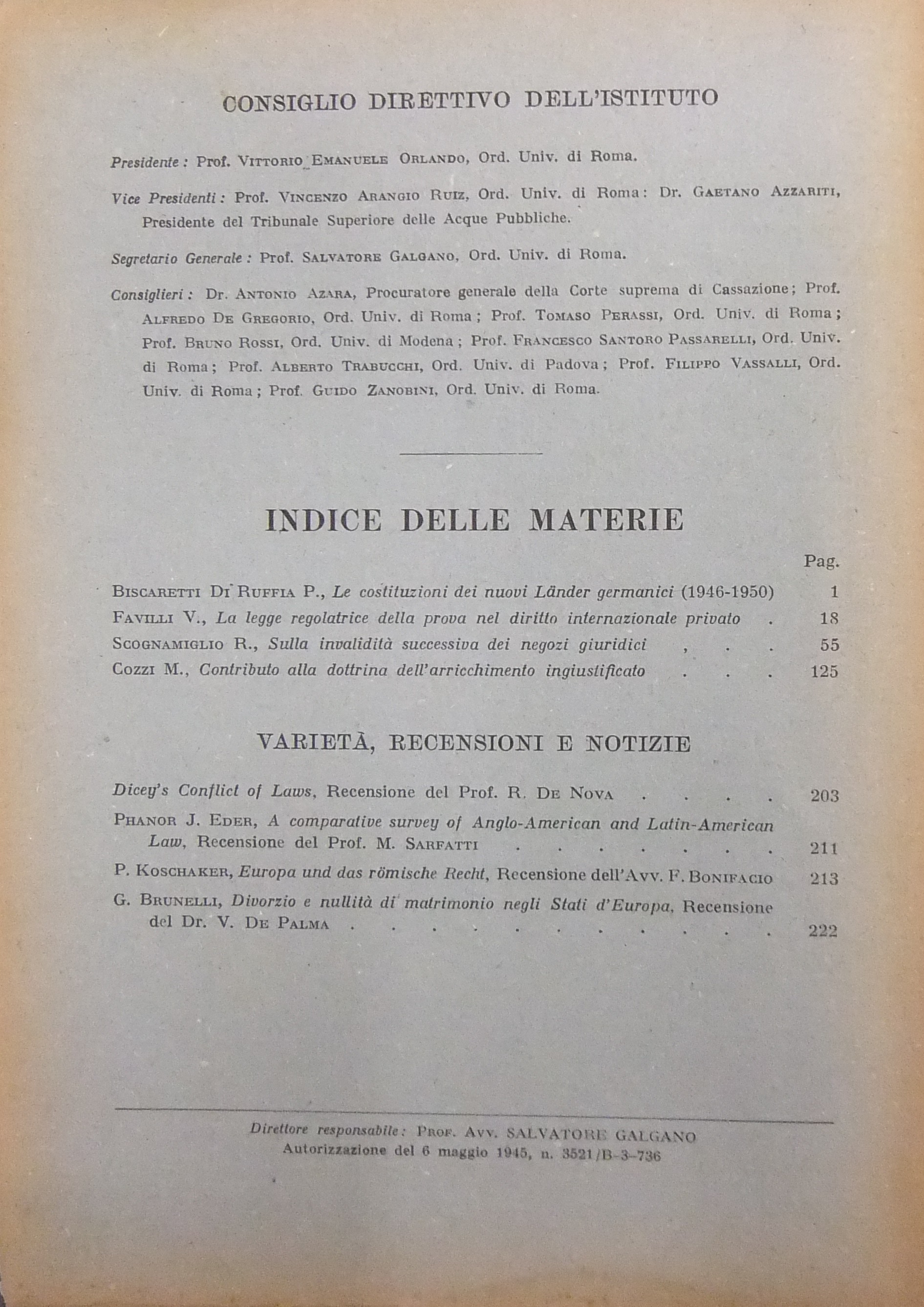 Consiglio direttivo: V.E. Orlando, V. Arangio Ruiz, G. Azzariti. Scritti di: Biscaretti di Ruffia, Brunelli, Cozzi, Favilli, Koschaker, Scognamiglio.