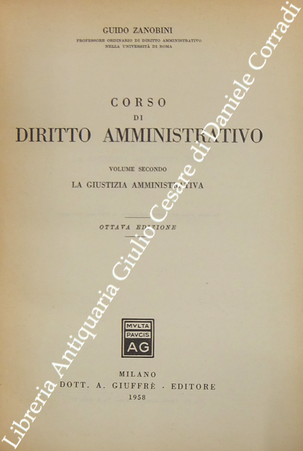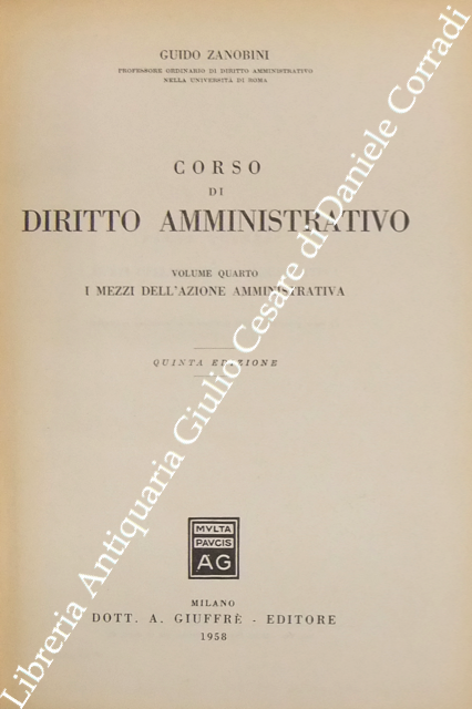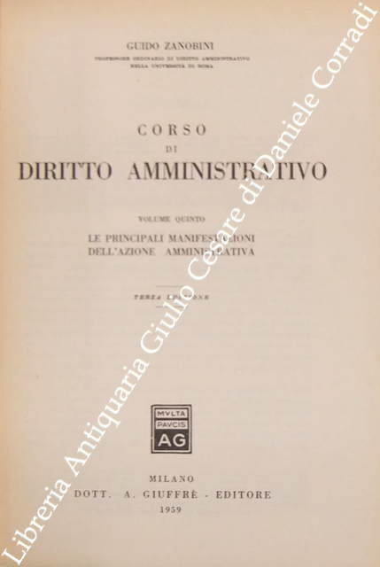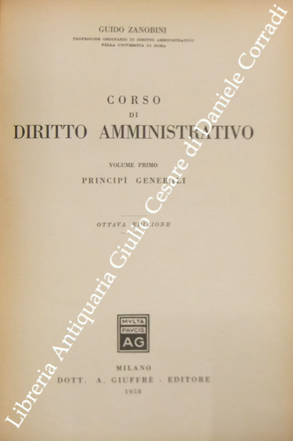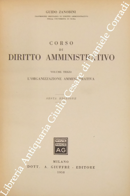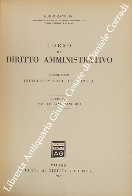 Corso di diritto amministrativo. Vol. I - Principi generali. Vol. II - La giustizia amministrativa. Vol. III - L'organizzazione amministrativa. Vol. IV - I mezzi dell'azione amministrativa. Vol. V - Le principali manifestazioni dell'azione amministrativa. Vol. VI - Indici generali dell'opera. A cura del Dott. Luciano Zanobini