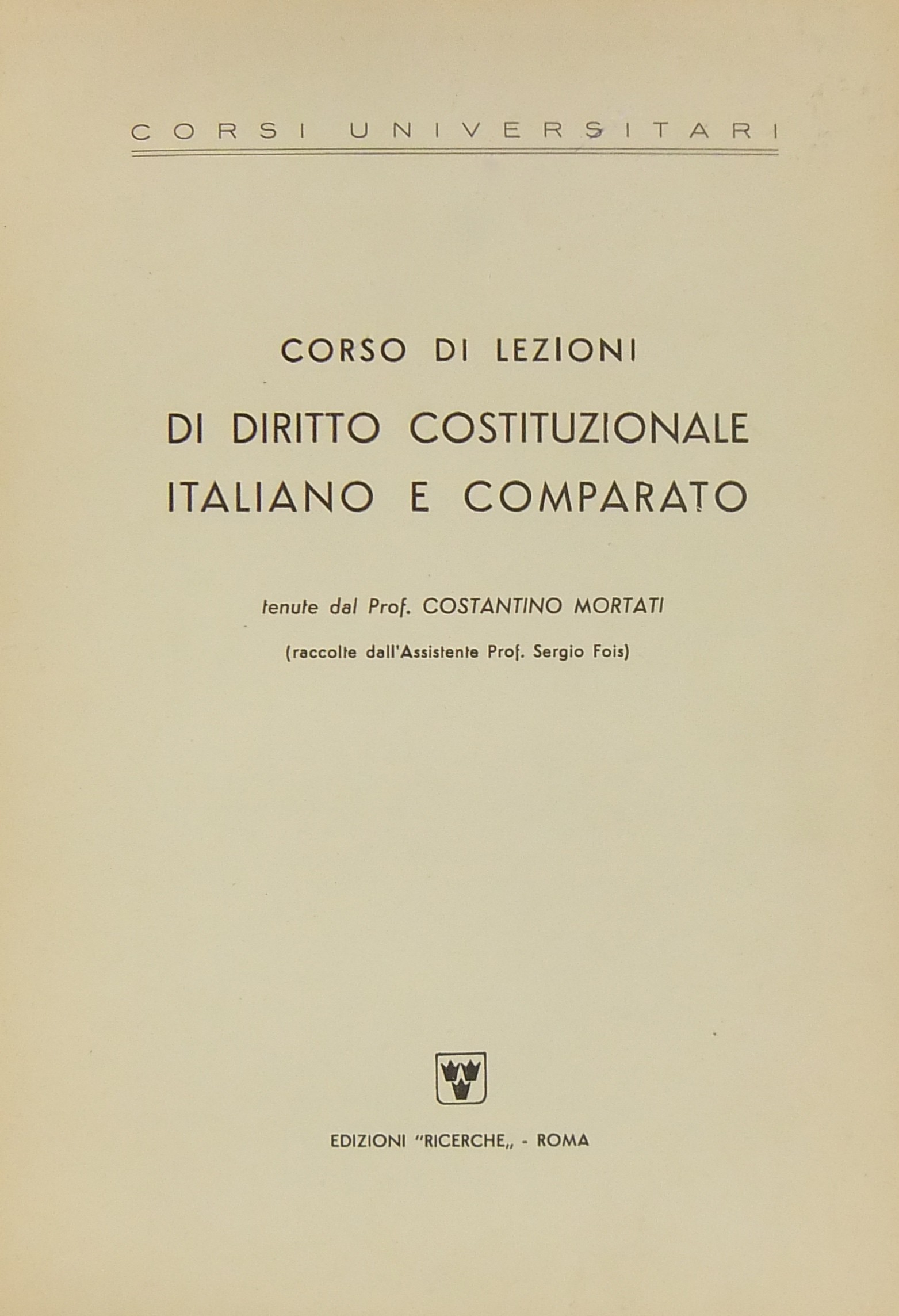 Corso di lezioni di diritto costituzionale italiano e comparato. (Raccolte dall'Assistente Prof. Sergio Fois)