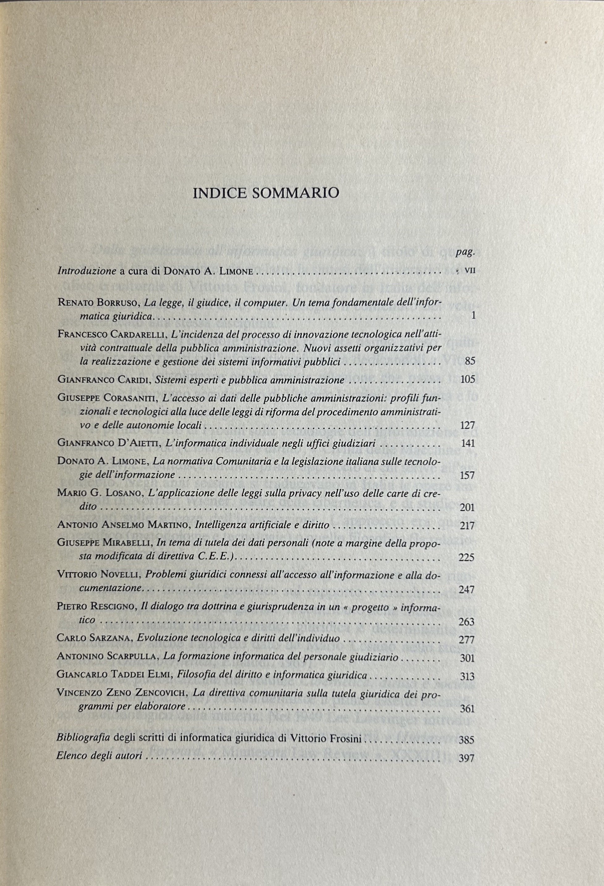 Scritti di: Borruso, Cardarelli, Caridi, Corasaniti, D'Aietti, Limone, Losano, Martino, Mirabelli, Novelli, Rescigno, Sarzana, Scarpulla, Taddei Elmi, Zeno Zencovich