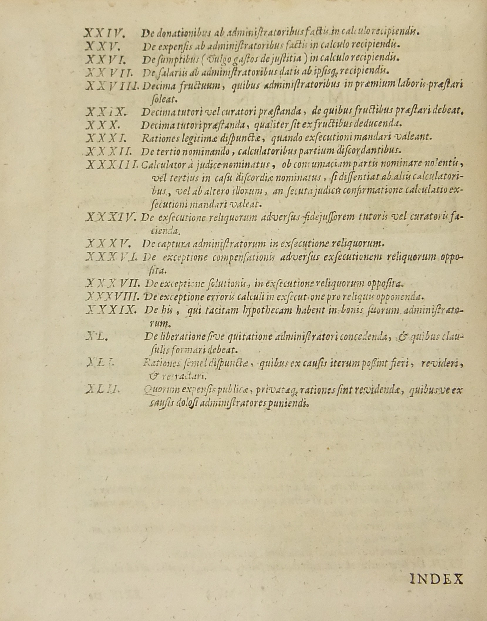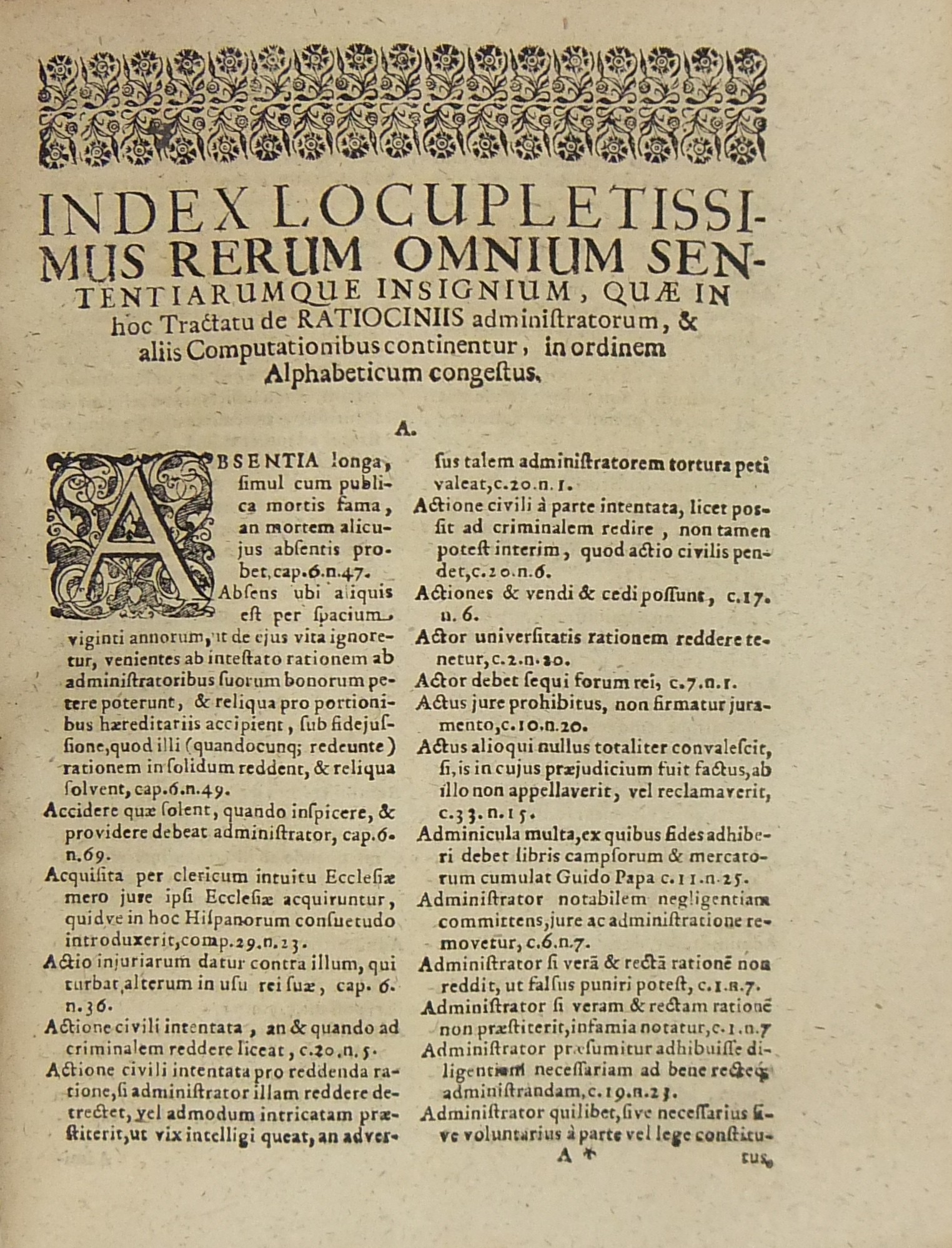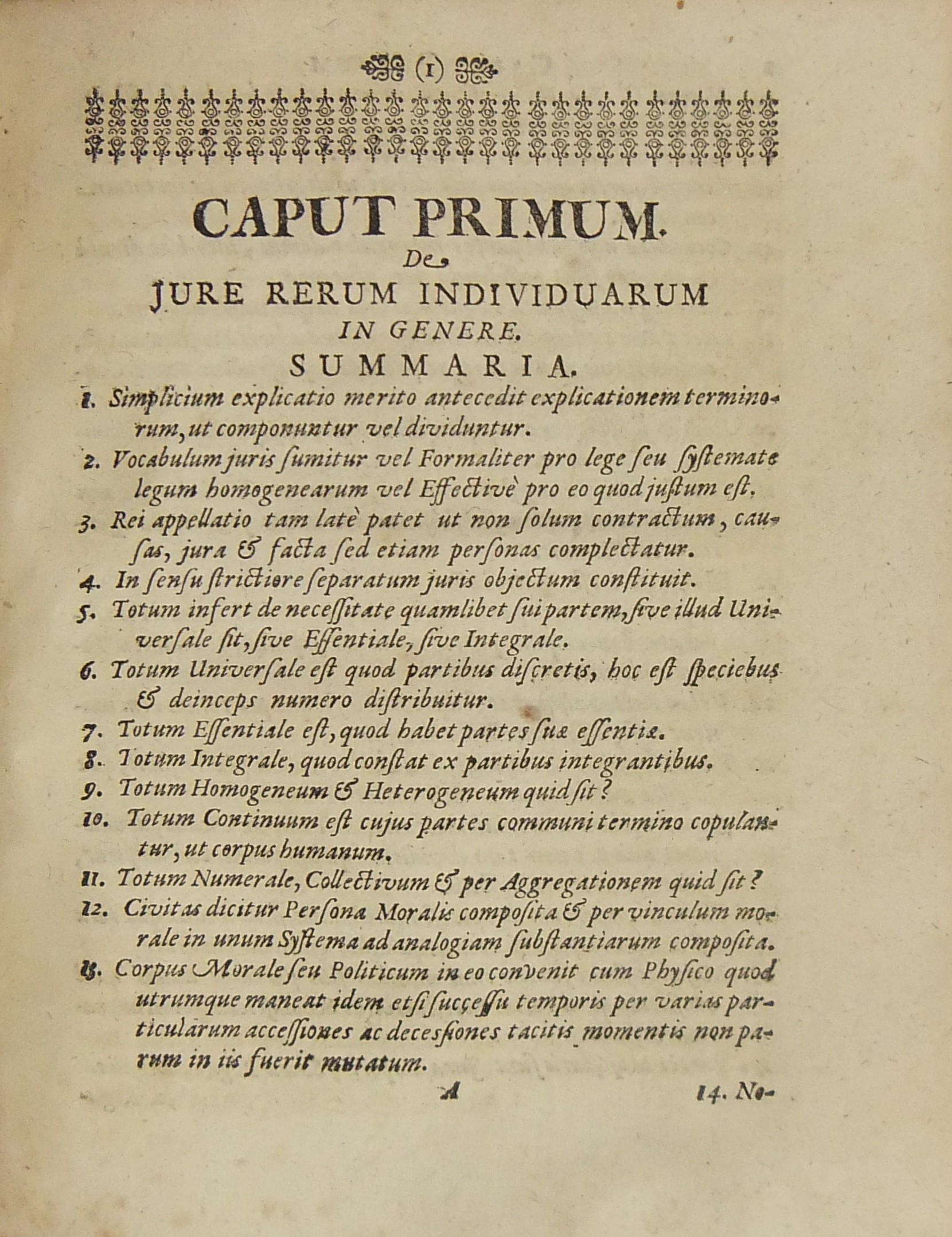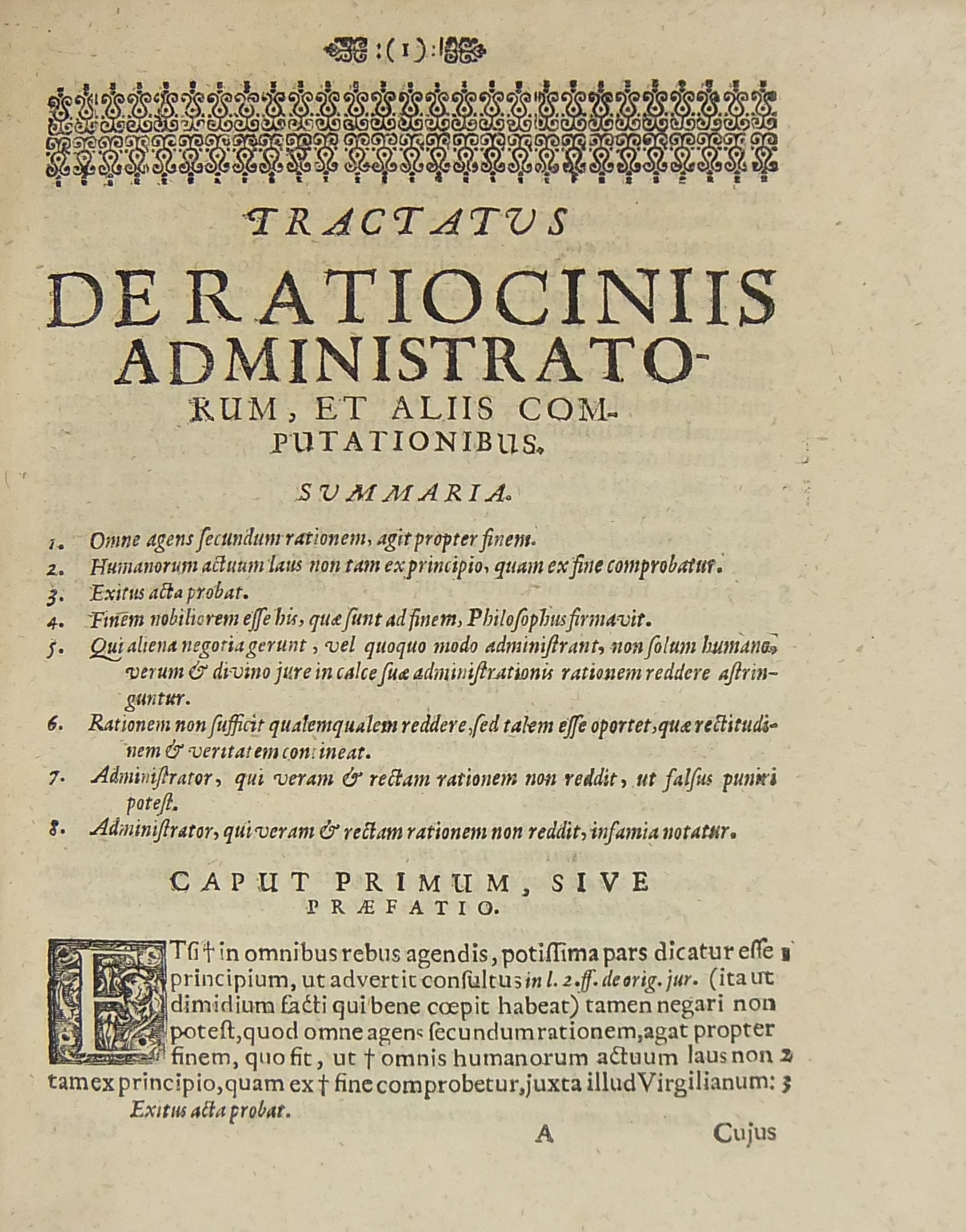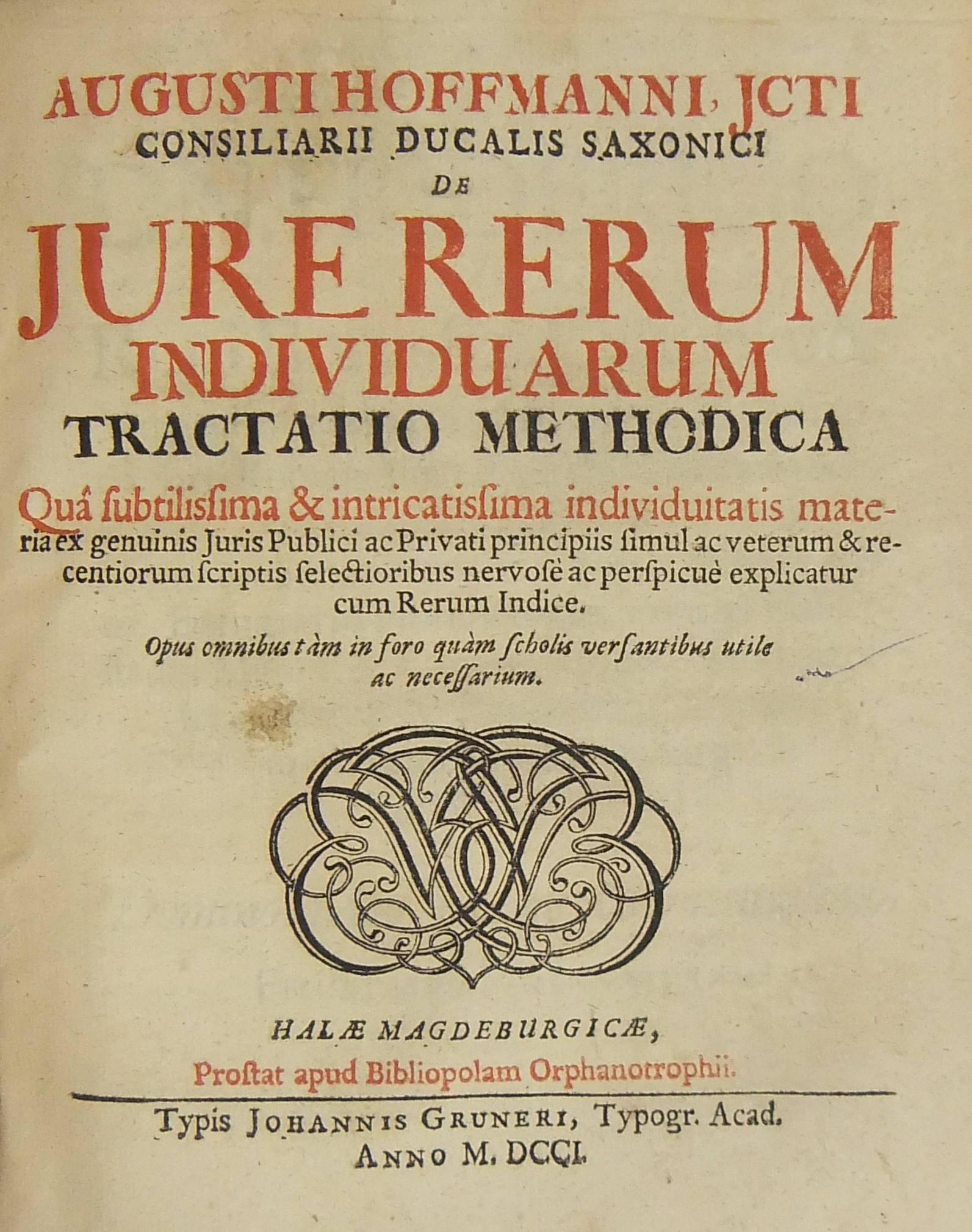 De ratiociniis administratorum, et computationibus variis aliis, tractatus praegnantissimus, Omnibus iuri operam dantibus, tam in theoria, quam praxi, utilis, iudicibus et aduocatis pernecessarius,... UNITO A: Augusti Hoffmanni - De Jure rerum individuarum tractatio methodica qua subtilissima e intricatissima individuitatis materia ex genuinis Juris Publici ac Privati principiis simul ac veterum e recentiorum scriptis selectioribus nervose ac perspique explicatur cum rerum indice.. Halae Magdeburgicae, typis Johannis Gruneri, 1701, pp. (20) + 488 + (56)