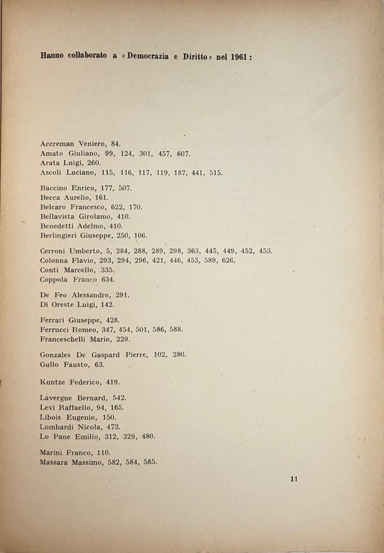 Scritti di: Accreman, Amato, Arata, Ascoli, Baccino, Becca, Belcaro, Bellavista, Benedetti, Berlingieri, Cerroni, Colonna, Conti, Coppola, De Feo, Di Oreste, Ferrari, Ferrucci, Franceschelli, Gonzales De Gaspard, Gullo, Kuntze, Lavergne, Levi, Libois, Lombardi, Lo Pane, Marini, Massara, Merusi, Minervini, Minniti, Natoli, Pannikar, Peppe, Perrone, Pisi, Poggi, Pugliatti, Rizzo, Rosapepe, Sabarini, Servello, Smuraglia, Szabò, Terracini, Vais, Vassalli, Vecchione, Vincenzi, Violante
