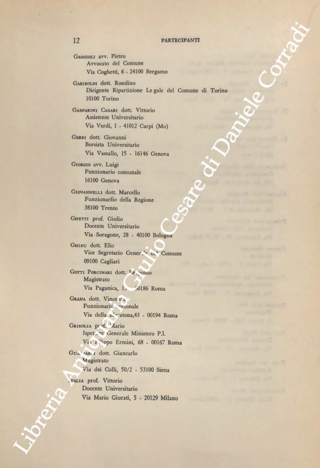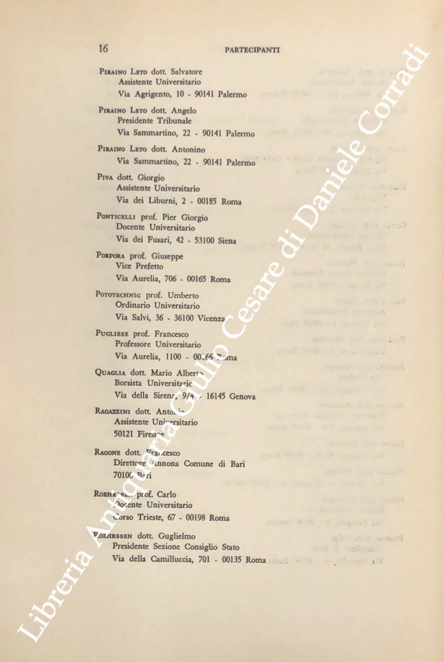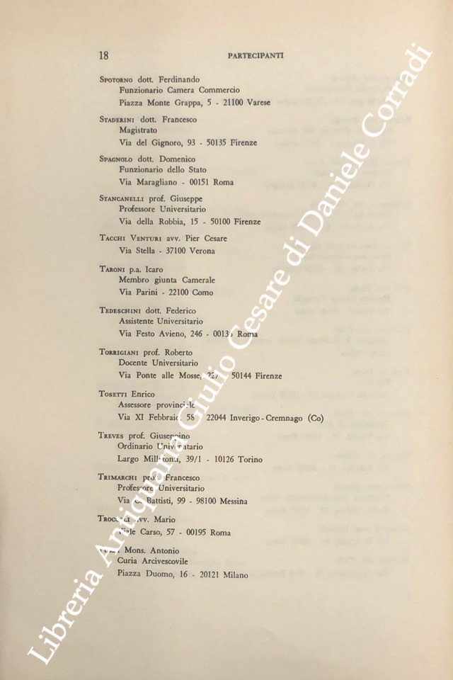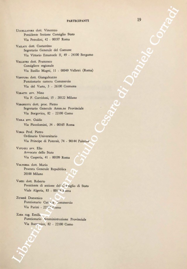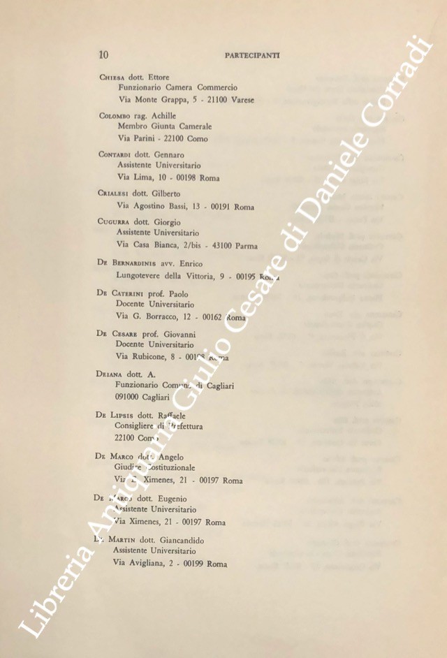 Partecipanti: Abate, Acquarone, Agnello, Agrifoglio, Alagna, Amadori, Amendola, Aliverti, Andream, Angeletti A., Angeletti M., Balboni, Baragiola, Bassanini, Bassi, Bergonzini, Berlucchi, Bertani, Berti, Birtig, Bonazzi, Bonifacio, Bosisio, Buscema, Calisse, Caianiello, Cairoli, Cantucci, Capaccioli, Capalozza, Cappelli, Cappellini, Casetta, Cassese, Catelani, Chiarelli, Chiesa, Colombo, Contardi, Crialesi, Cugurra, De Bernardinis, De Caterini, De Cesare, Deiana, De Lipsis, De Marco A., De Marco E., De Martin, Dessy, Di Pace, Di Raimondo, Di Giulio, Ehlermann, Falcone, Ferrara, Ferrari, Fiamminghi, Fletzer, Fois, Forni, Furlani, Gaggioli, Gariboldi, Gasparini, Gerbi, Giorgio, Giovannelli, Ghetti, Ghisu, Gotti, Grana, Grisolia, Guasparri, Italia, Jaricci, Levi, Licalzi, Locati G. Locati M., Loy, Lombardo, Lorenzoni, Lucifredi, Luparello, Luraschi, Morforio, Martini, Masci, Massari, Mauri, Mazzarolli, Menegatti, Menzani, Mercogliano, Merusi, Miglori, Mignone, Mor, Morbidelli, Morì, Moretti, Motzo, Nappi, Neri, Orusa, Pagani, Palaia, Paleologo, Panetta, Papaldo, Pasini, Pastori, Pericu, Pianese, Piraino Leto Angelo, Piraino Leto Antonino, Piraino Leto S., Piva, Ponticelli, Porpora, Pototschnig, Pugliese, Quaglia, Ragazzini, Ragone, Roehrssen C. Roehrssen G., Romano Alberto, Romano Antonio, Roversi, Rigamonti, Sacchi Morsiani, Sala, Sanfelici, Scarella, Schinaia, Sciacca, Scotto, Salberini, Selvaggi, Spotorno, Staderini, Spagnolo, Stancanelli, Tacchi, Taroni, Tedeschini, Torrigiani, Tosetti, Treves, Trimarchi, Troccoli, Turri, Uccellatore, Vailati, Velletri, Ventura, Veratti, Verghetti, Viola, Virga, Vitucci, Volterra, Vozzi, Zumbè, Zara