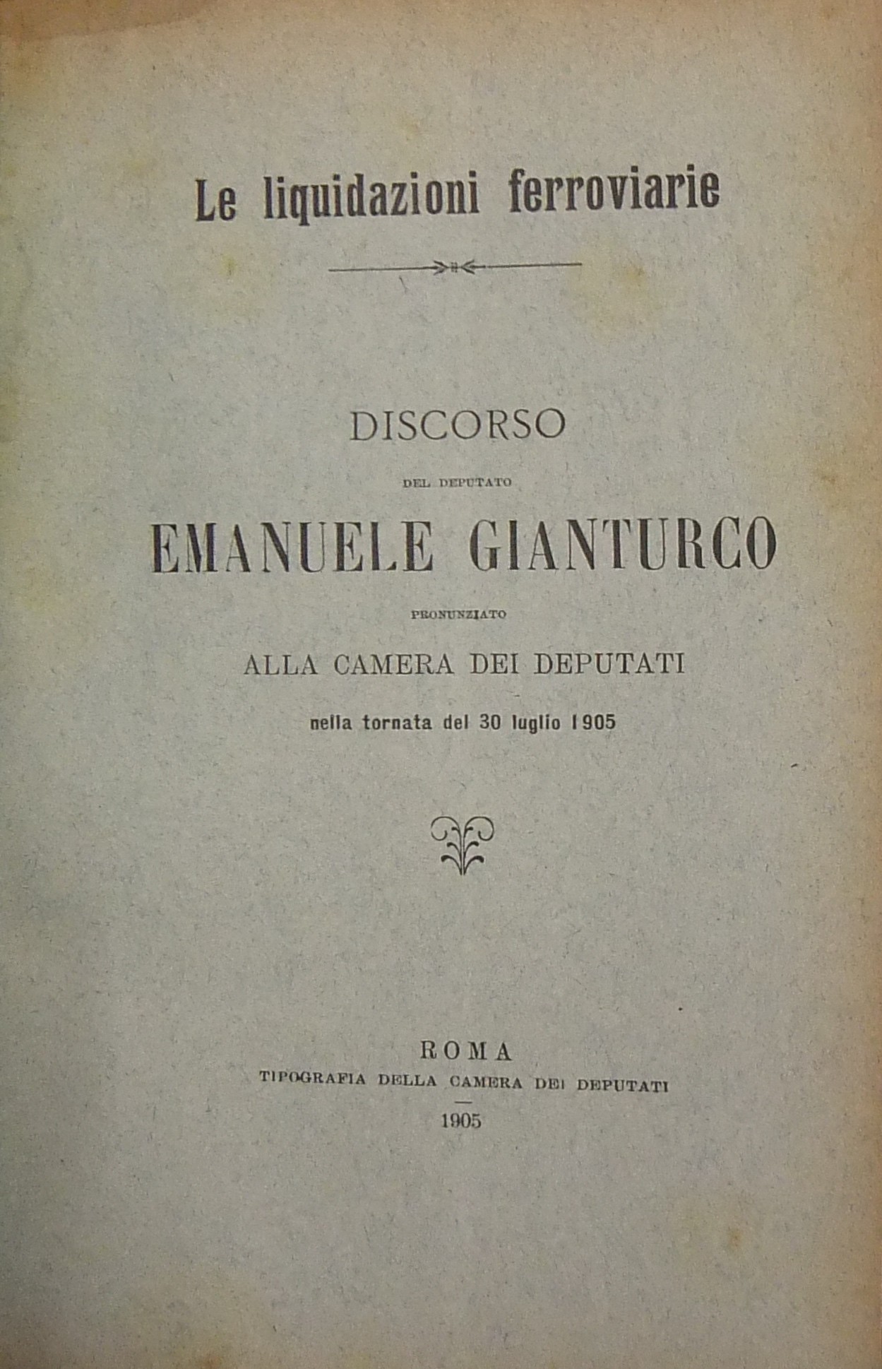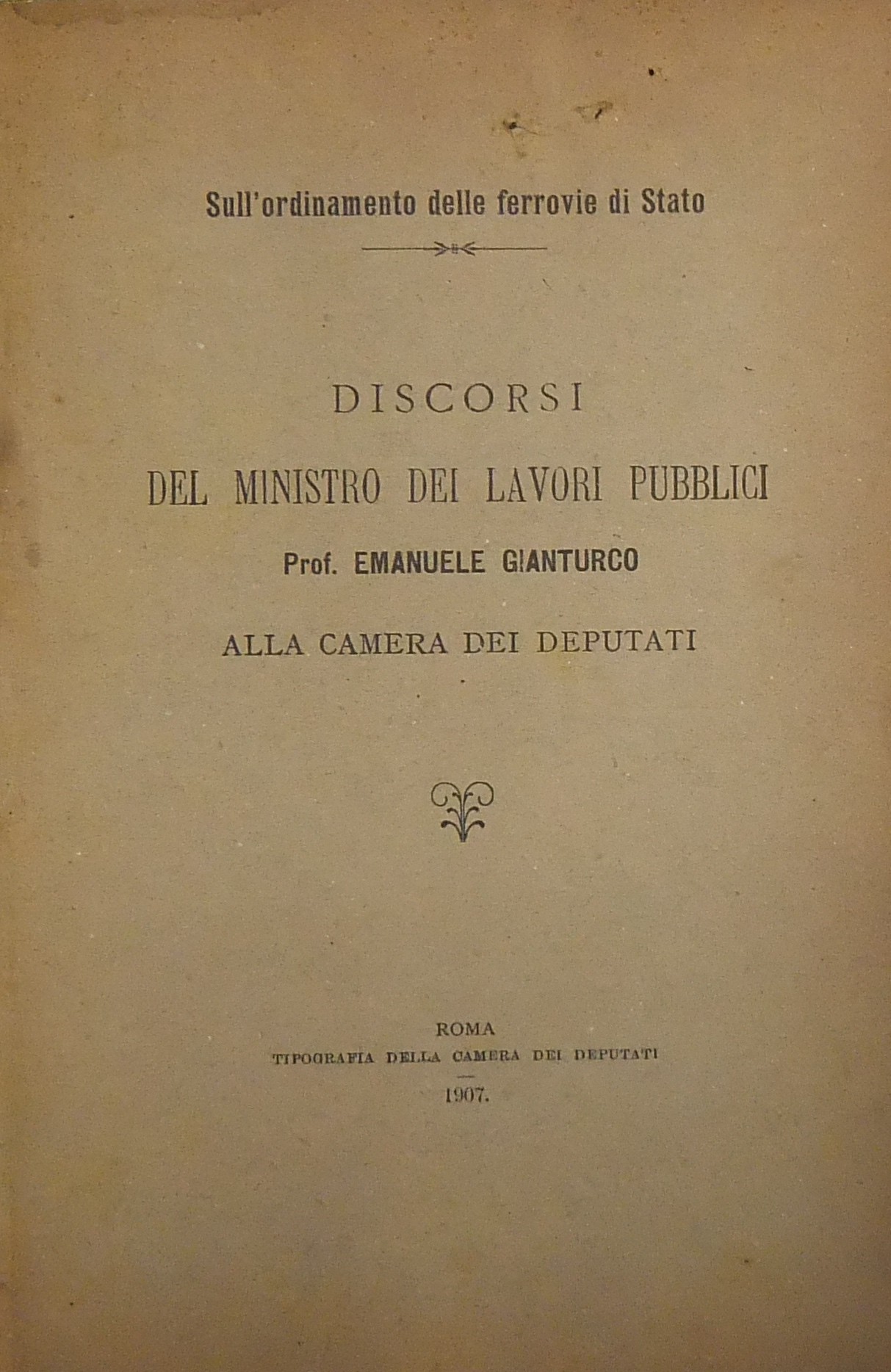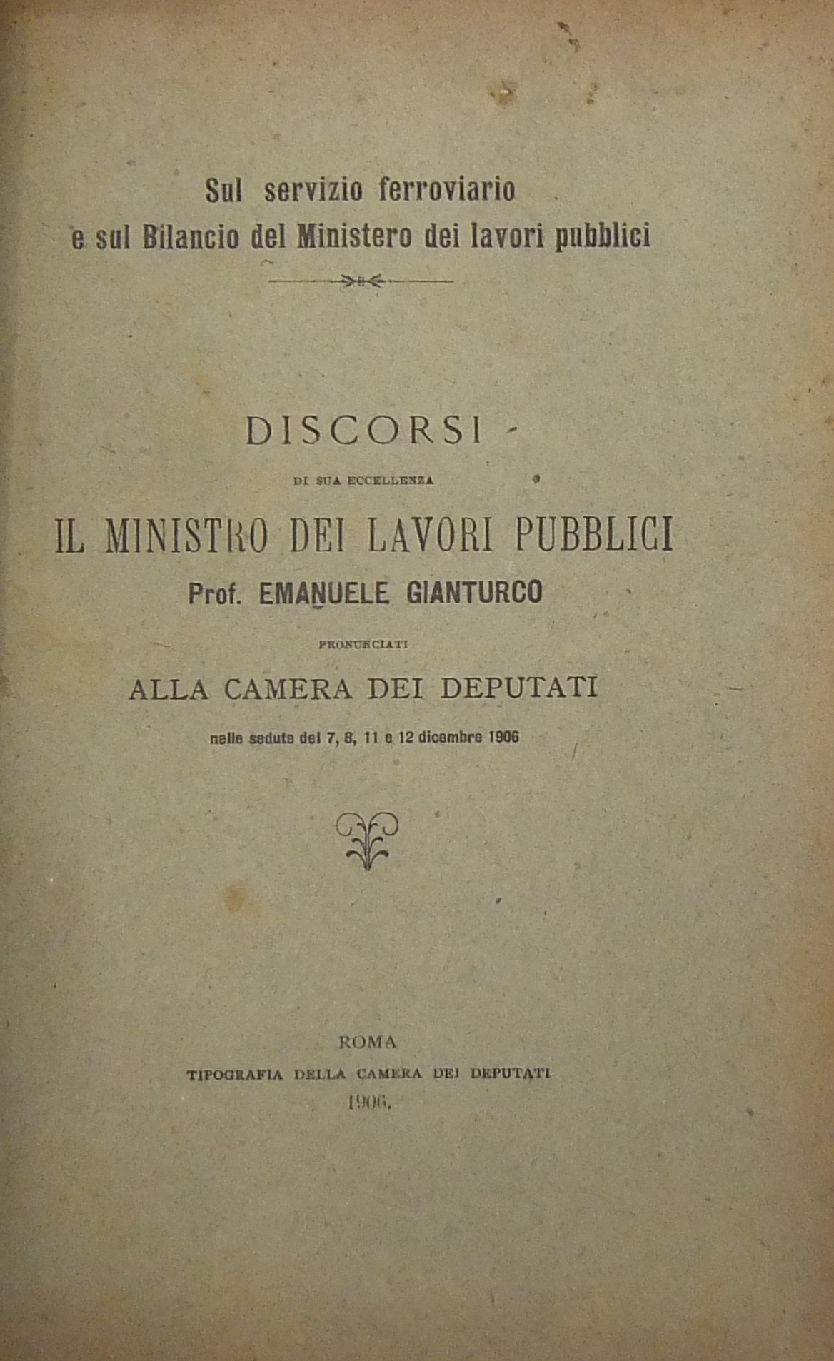 Sulle modificazioni all'ordinamento giudiziario. Discorso ... pronunziato alla Camera dei Deputati nella tornata del 17 febbraio 1905. UNITO A: Le liquidazioni ferroviarie. Discorso ... pronunziato alla Camera dei Deputati nella tornata del 30 luglio 1905. UNITO A: Sullo sgravio del debito ipotecario. Discorso ... pronunziato alla Camera dei Deputati nella tornata del 24 febbraio 1905. UNITO A: Sul servizio ferroviario e sul Bilancio del Ministero dei lavori pubblici. Discorsi ... pronunciati alla Camera dei Deputati nelle sedute del 7, 8, 11 e 12 dicembre 1906. UNITO A: Il suffragio universale e la politica ecclesiastica. Dichiarazione di voto di Emanuele Gianturco alla Camera dei Deputati nella tornata del 1° febbraio 1906. UNITO A: Sull'ordinamento delle ferrovie dello Stato. Discorsi ... alla Camera dei Deputati.