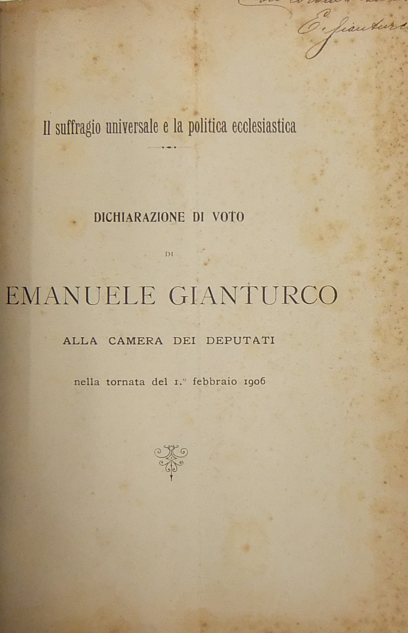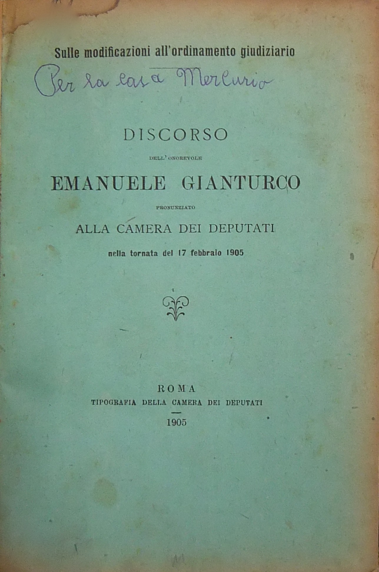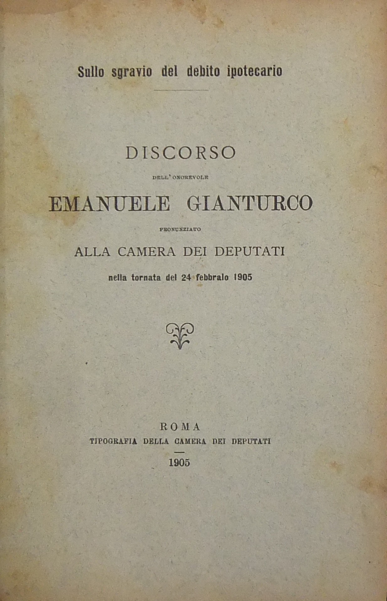 Sulle modificazioni all'ordinamento giudiziario. Discorso ... pronunziato alla Camera dei Deputati nella tornata del 17 febbraio 1905. UNITO A: Le liquidazioni ferroviarie. Discorso ... pronunziato alla Camera dei Deputati nella tornata del 30 luglio 1905. UNITO A: Sullo sgravio del debito ipotecario. Discorso ... pronunziato alla Camera dei Deputati nella tornata del 24 febbraio 1905. UNITO A: Sul servizio ferroviario e sul Bilancio del Ministero dei lavori pubblici. Discorsi ... pronunciati alla Camera dei Deputati nelle sedute del 7, 8, 11 e 12 dicembre 1906. UNITO A: Il suffragio universale e la politica ecclesiastica. Dichiarazione di voto di Emanuele Gianturco alla Camera dei Deputati nella tornata del 1° febbraio 1906. UNITO A: Sull'ordinamento delle ferrovie dello Stato. Discorsi ... alla Camera dei Deputati.