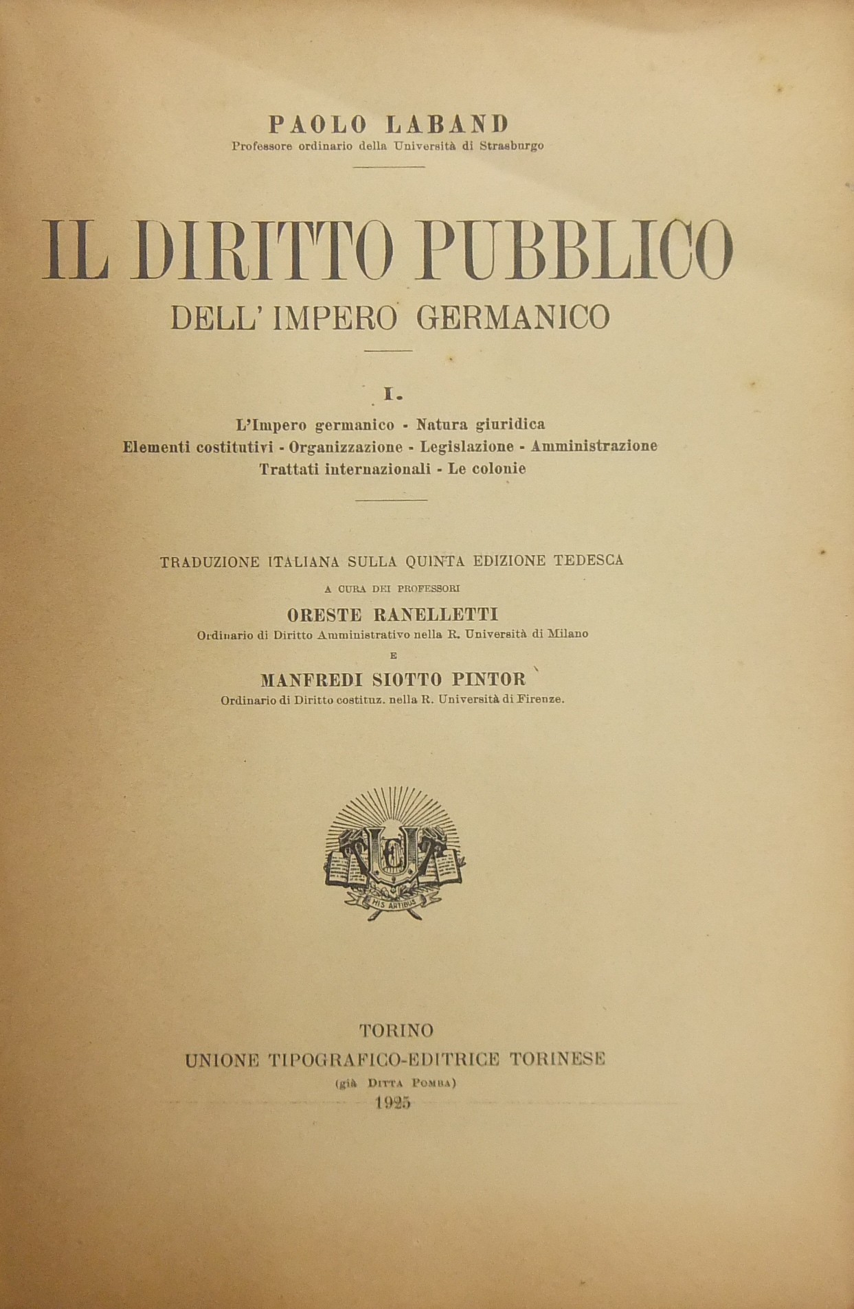 Il diritto pubblico dell'Impero Germanico. Vol. I (unico pubblicato) - L'Impero germanico. Natura giuridica. Elementi costitutivi. Organizzazione. Legislazione. Amministrazione. Trattati internazionali. Le colonie. Traduzione italiana sulla quinta edizione tedesca a cura dei Professori Oreste Ranelletti e Manfredi Siotto Pintor