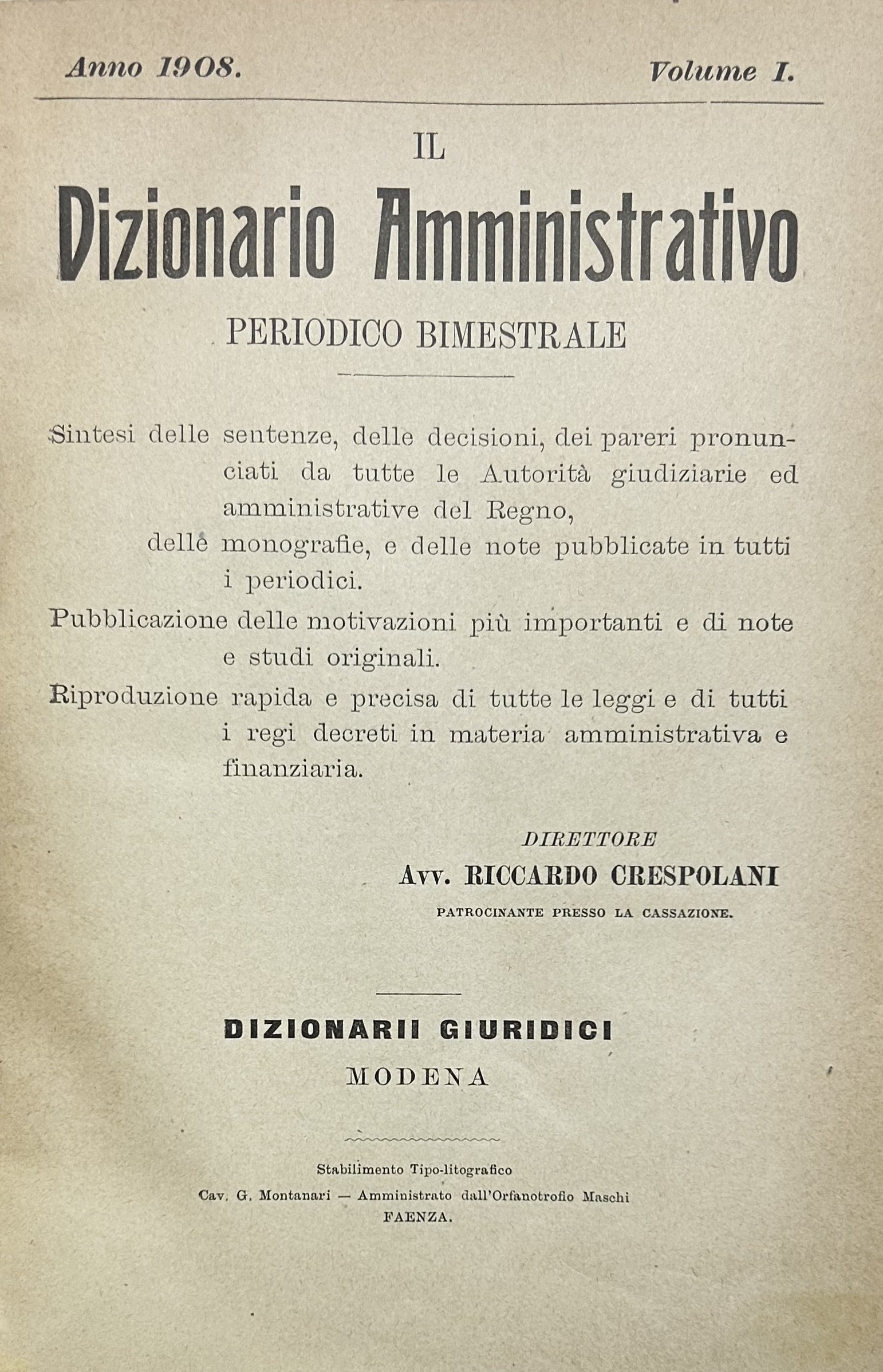 Il Dizionario Amministrativo. Periodico bimestrale. Sintesi delle sentenze, delle decisioni, dei pareri pronunciati da tutte le Autorità giudiziarie ed amministrative del Regno, delle monografie, e delle note pubblicate in tutti i periodici. Pubblicazione delle motivazioni più importanti e di note e studi originali. Riproduzione rapida e precisa di tutte le leggi e di tutti i regi decreti in materia amministrativa e finanziaria