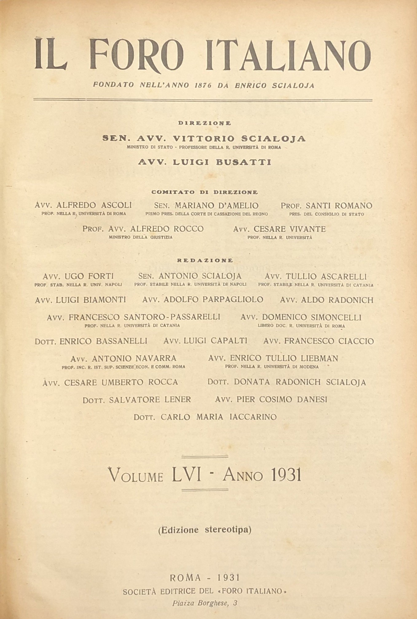 Il Foro Italiano. Fondato nell'anno 1876 da Enrico Scialoja. Anno LVI. 1931