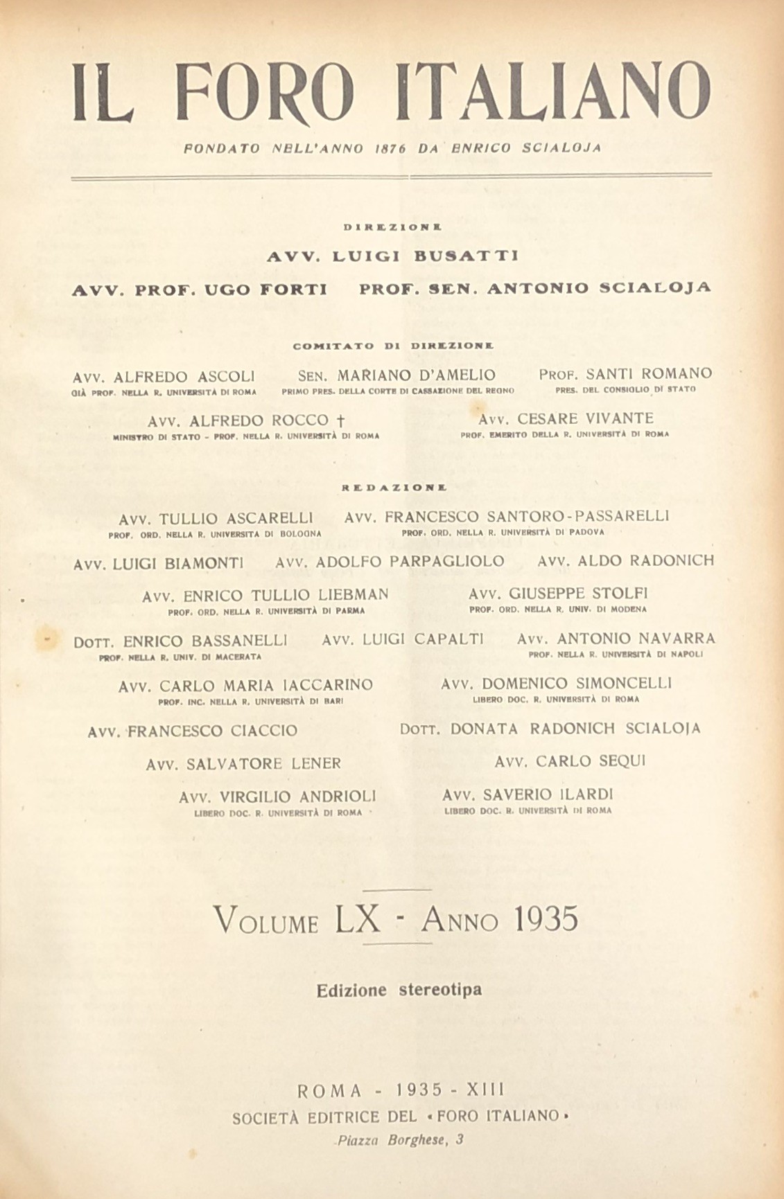 Il Foro Italiano. Fondato nell'anno 1876 da Enrico Scialoja. Anno LX. 1935