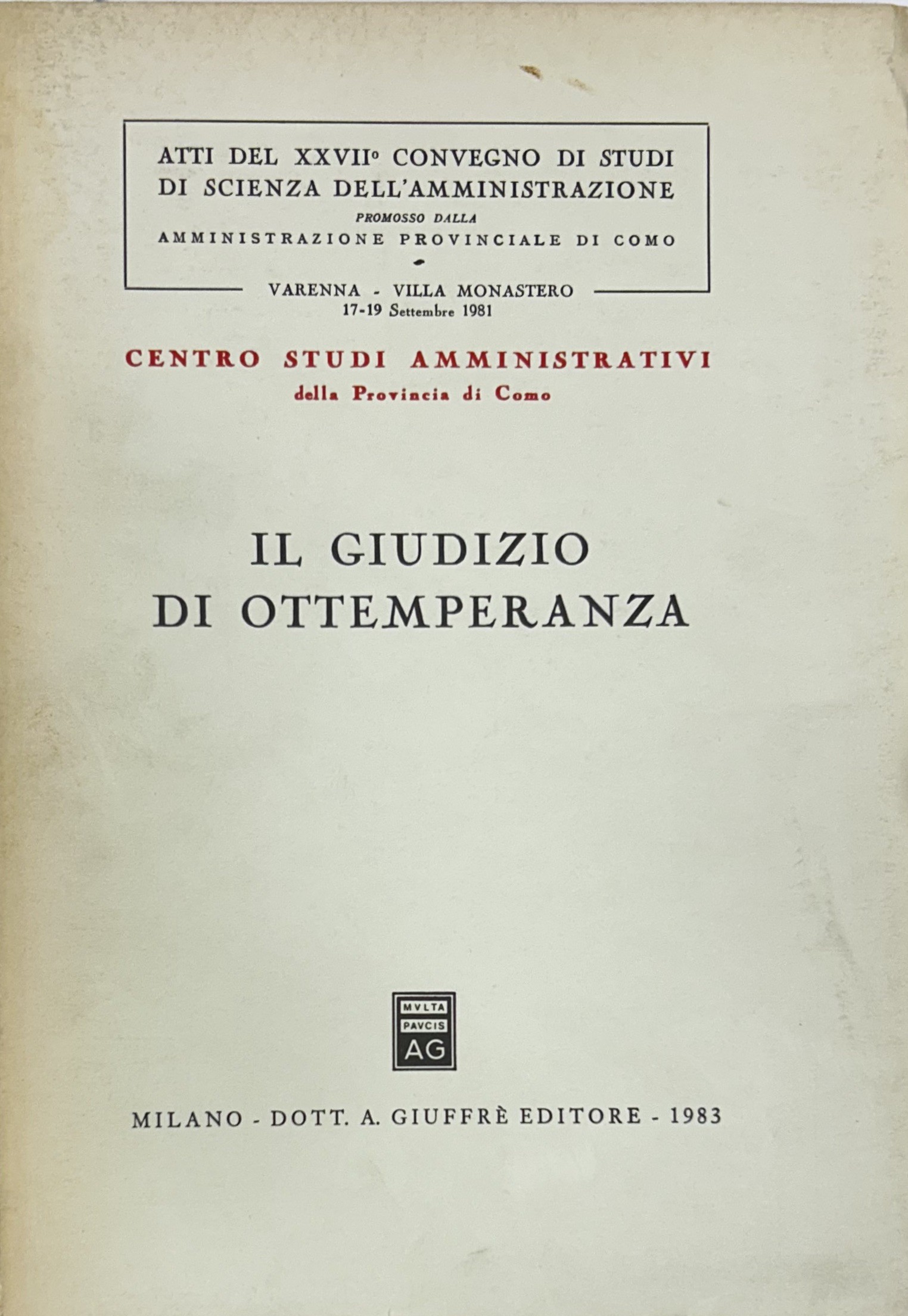 Il giudizio di ottemperanza. Atti del XXVII Convegno di Studi di Scienza dell'Amministrazione promosso dalla Amministrazione Provinciale di Como. Varenna - Villa Monastero 17-19 Settembre 1981