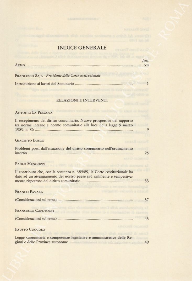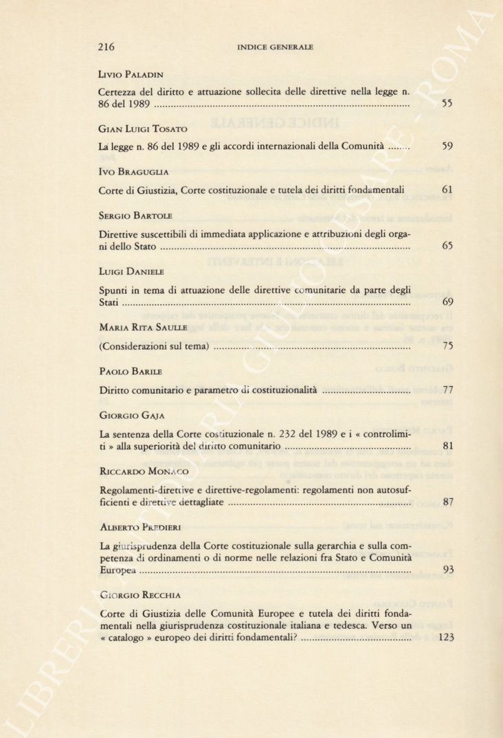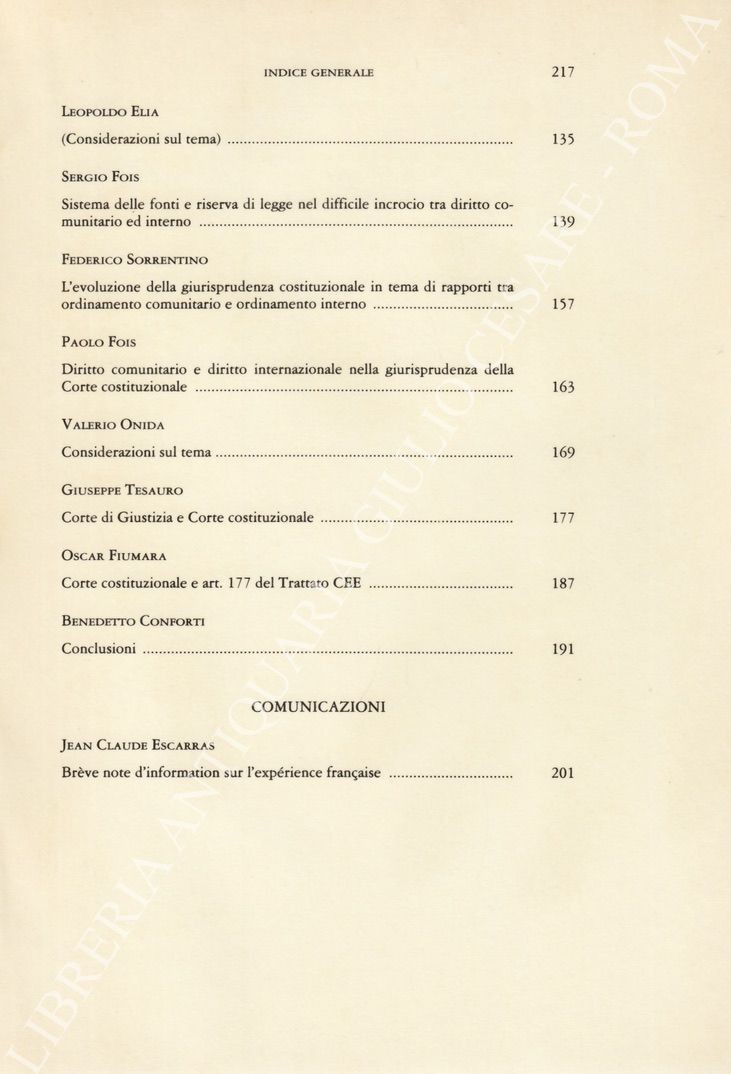 Scritti di: Barile, BArtole, Bosco, Braguglia, Capotorti, Cucolo, Daniele, Elia, Escarras, Favara, Fiumara, Fois P., Fois S., Gaja, La Pergola, Mengozzi, Monaco, Onida, Paladin, Predieri, Recchia, Saulle, Sorrentino, Tesauro, Tosato