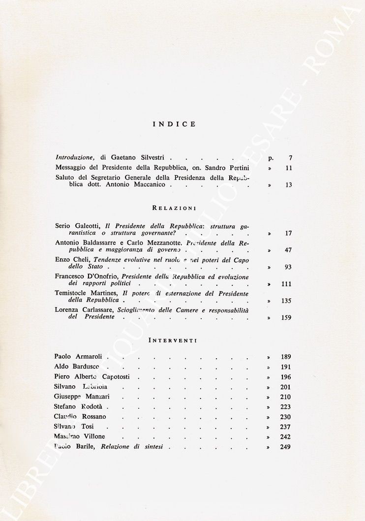 Scritti di: Ainis, Aloisi, Armaroli, Baldassarre, Bardusco, Barile, Capotosti, Carlassare, Cheli, Cuccodoro, Cuocolo, D’Onofrio, D’Orazio, Galeotti, Grisolia, Labriola, Lucifredi, Manzari, Martines, Mezzanotte, Rodotà , Rossano, Russo, Sandulli N., Silvestri, Tosi, Tuccari, Ventura, Villone, Volpi.