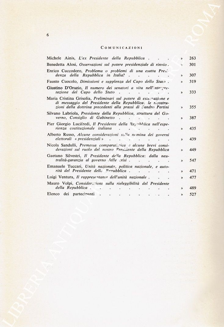 Scritti di: Ainis, Aloisi, Armaroli, Baldassarre, Bardusco, Barile, Capotosti, Carlassare, Cheli, Cuccodoro, Cuocolo, D'Onofrio, D'Orazio, Galeotti, Grisolia, Labriola, Lucifredi, Manzari, Martines, Mezzanotte, Rodotà , Rossano, Russo, Sandulli N., Silvestri, Tosi, Tuccari, Ventura, Villone, Volpi.
