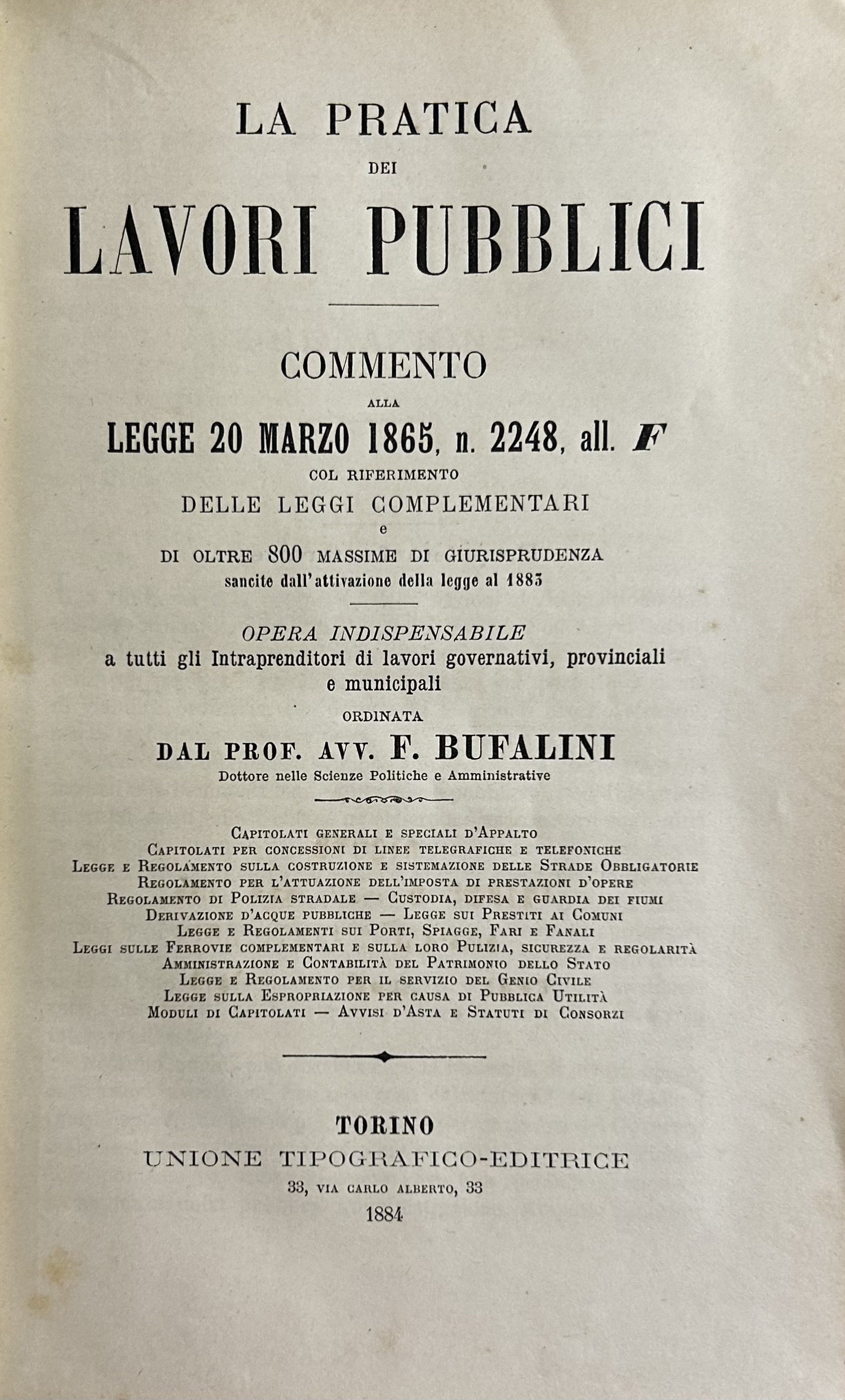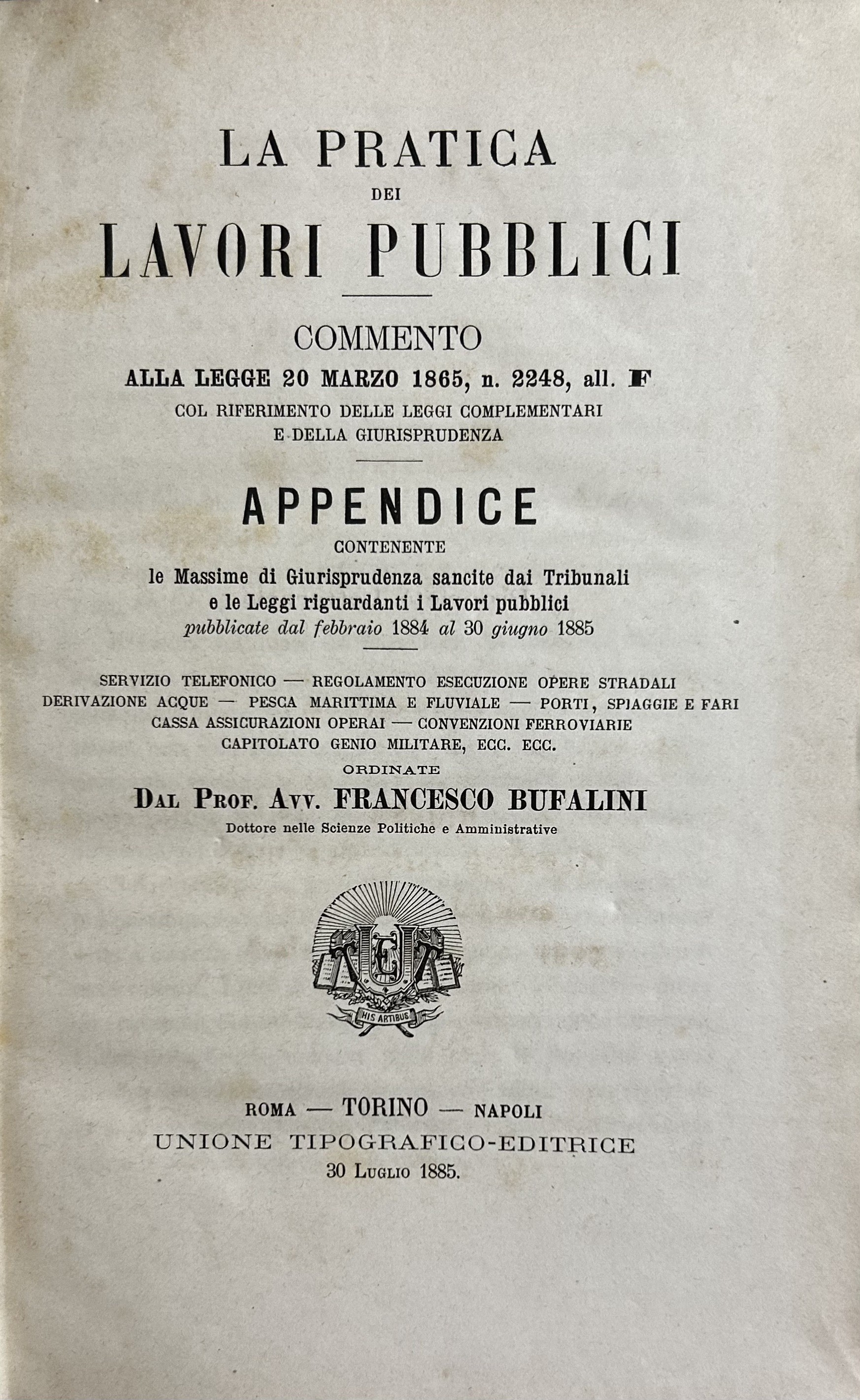 La pratica dei lavori pubblici. Commento alla Legge 20 Marzo 1865, n. 2248, all. F. Col riferimento delle leggi complementari e di oltre 800 massime di giurisprudenza sancite dall'attivazione della legge al 1883; Appendice contenente le massime di giurisprudenza sancite dai tribunali e le leggi riguardanti i lavori pubblici pubblicate dal febbraio 1884 al 30 giugno 1885