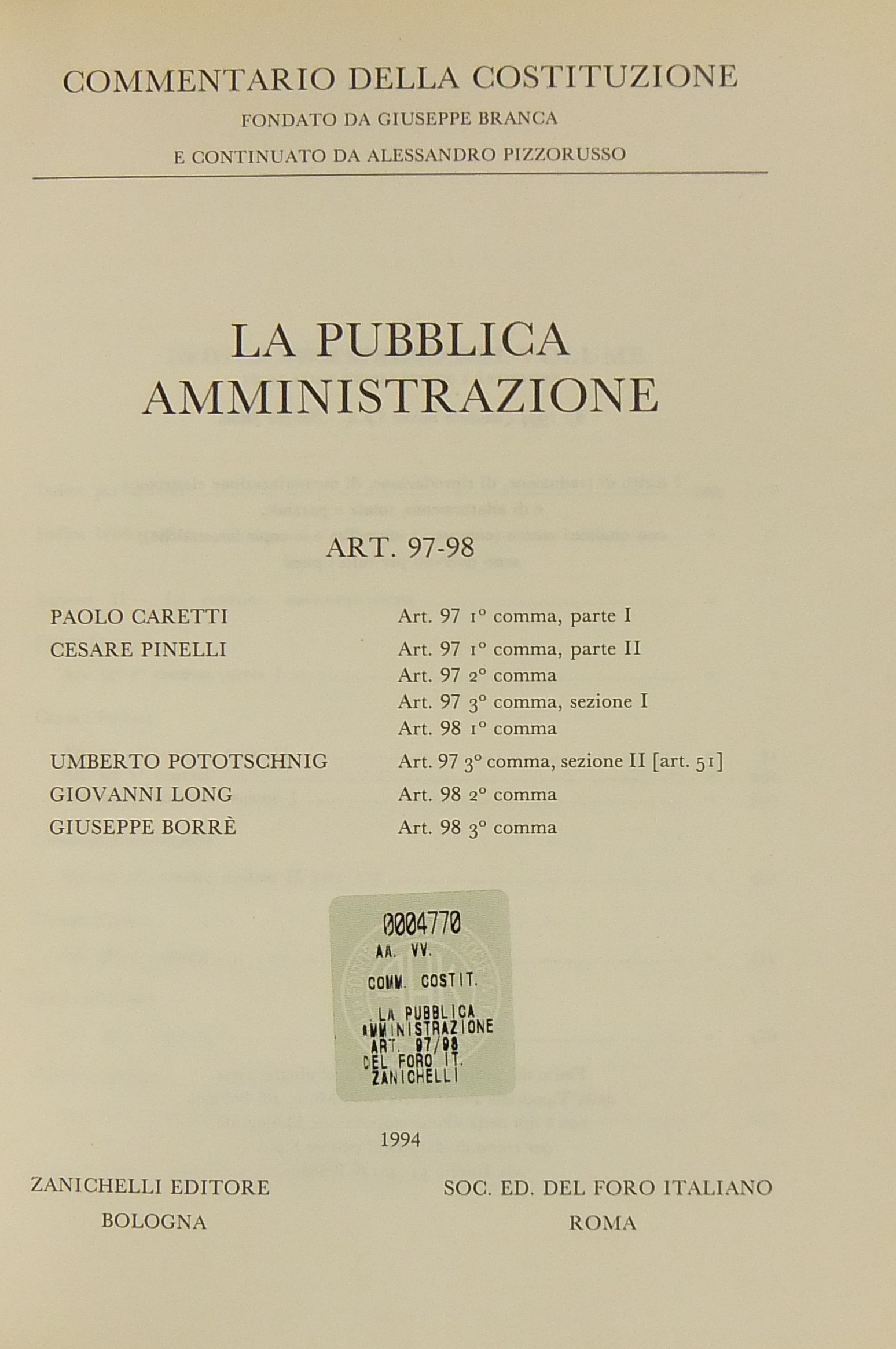 Direttore Collana: Fondato da G. Branca e continuato da A. Pizzorusso
