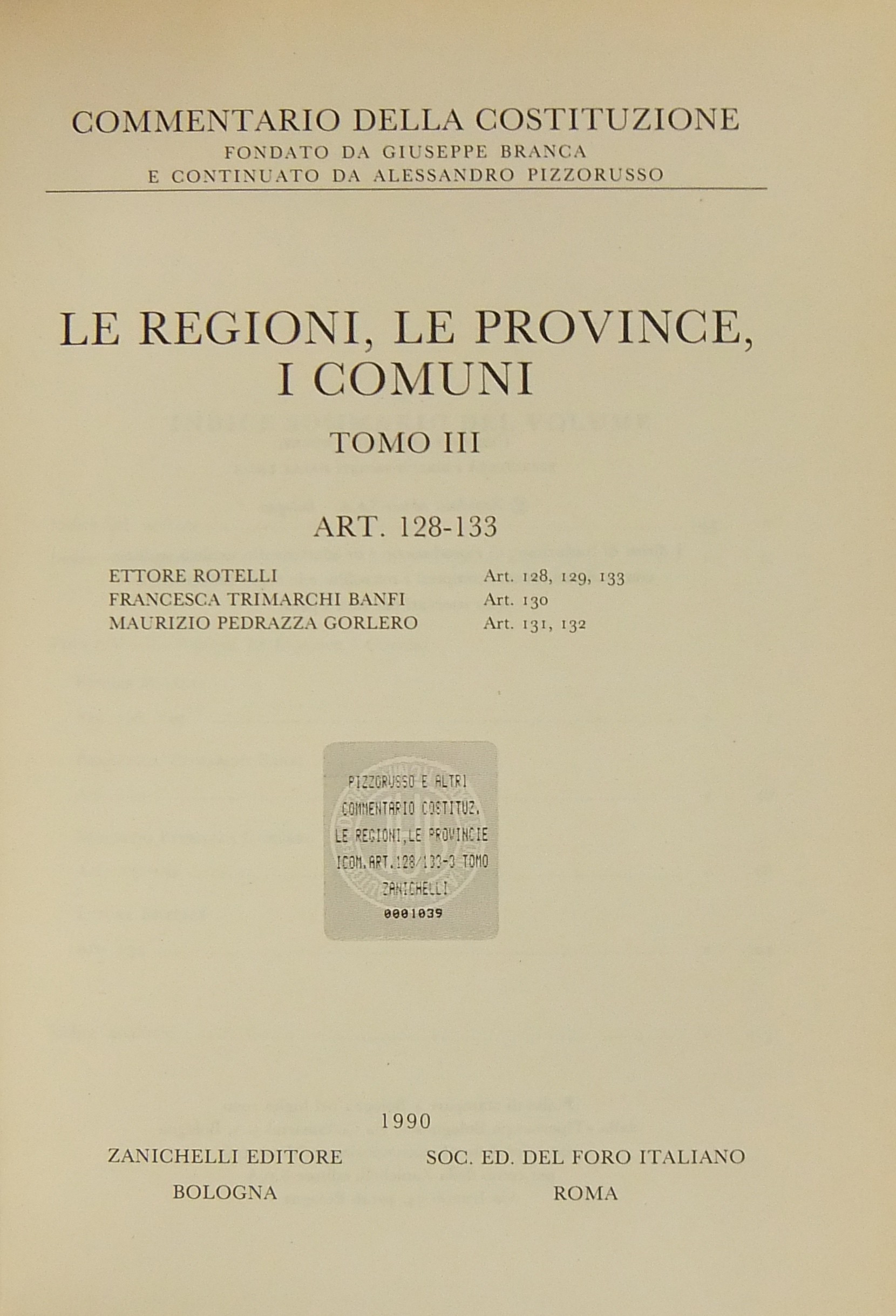 Le Regioni, le Province, i Comuni. Tomo III - Art. 128-133