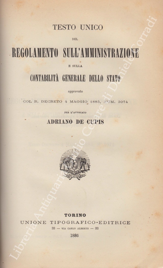 Legge sull'amministrazione del patrimonio dello Stato e sulla contabilità generale 8 luglio 1883, n. 1455, serie 3 annotata e seguita dal relativo regolamento. Appendice al Commento della Legge 22 aprile 1869 n. 5026; UNITO A: Testo unico del regolamento sull'amministrazione e sulla contabilità generale dello stato approvato col R. Decreto 4 maggio 1885, num. 3074