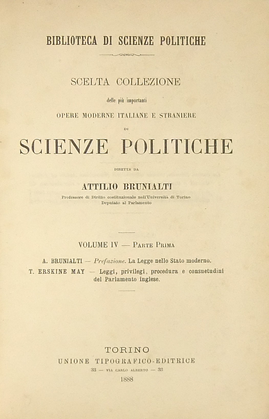Erskine May T. - Leggi, privilegi, procedura e consuetudini del Parlamento inglese. Brunialti A. - "Prefazione" La legge nello Stato moderno