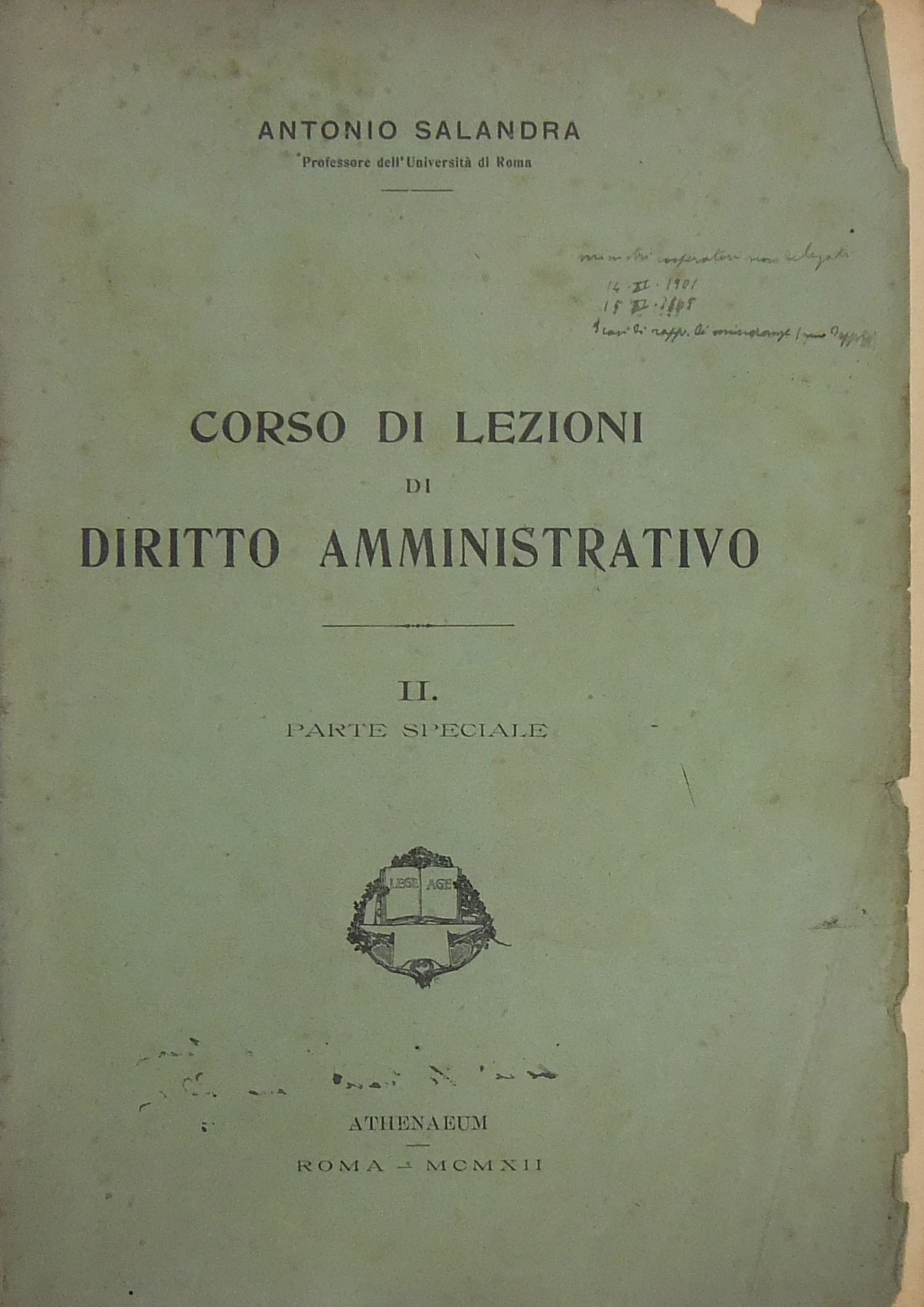 Lezioni di diritto amministrativo per l'anno accademico 1911-1912. Raccolte dall'Avv. Carlo Manes. Vol. I - Parte generale. Vol. II - Parte speciale