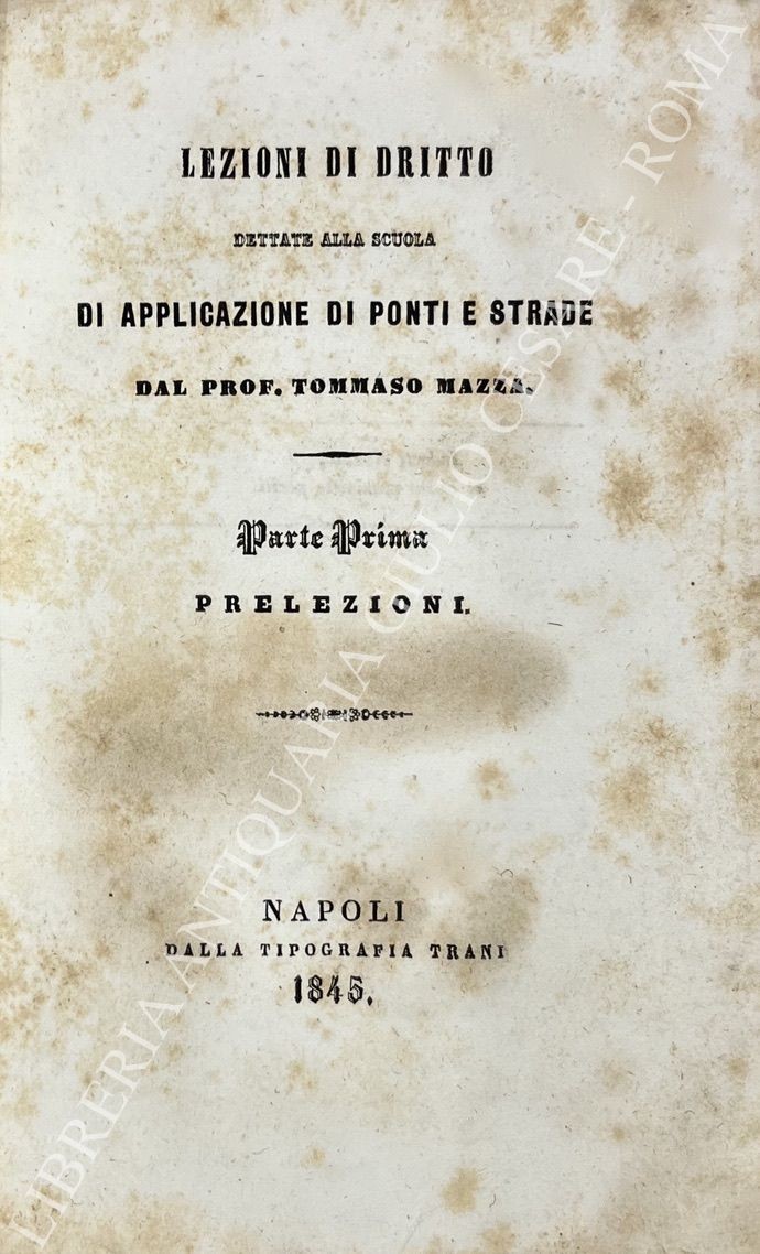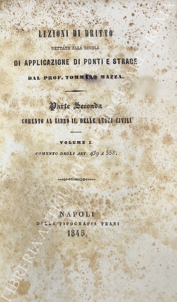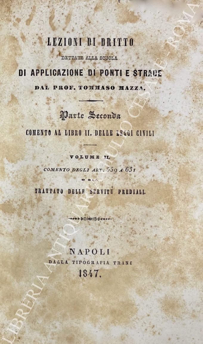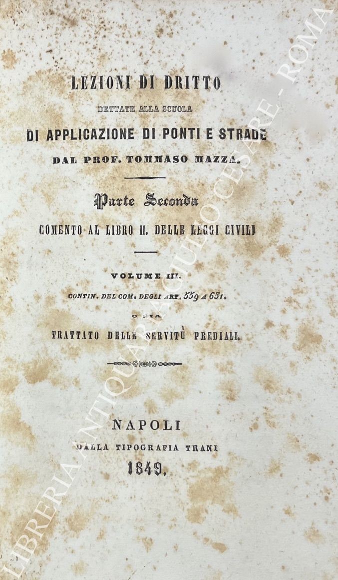 Lezioni di dritto dettate alla scuola di applicazione di ponti e strade. Parte prima - Prelezioni; Parte seconda - Comento al Libro II delle Leggi civili: Vol. I - Comento degli Art. 439 a 558; Parte seconda - Comento al Libro II delle Leggi civili: Vol. II - Comento degli Art. 559 a 631 o sia Trattato delle servitù prediali. Parte seconda - Comento al Libro II delle Leggi civili: Vol. III - Continuazione del comento degli Art. 559 a 631 o sia Trattato delle servitù prediali. Documenti autentici in appendice al trattato delle servitù prediali