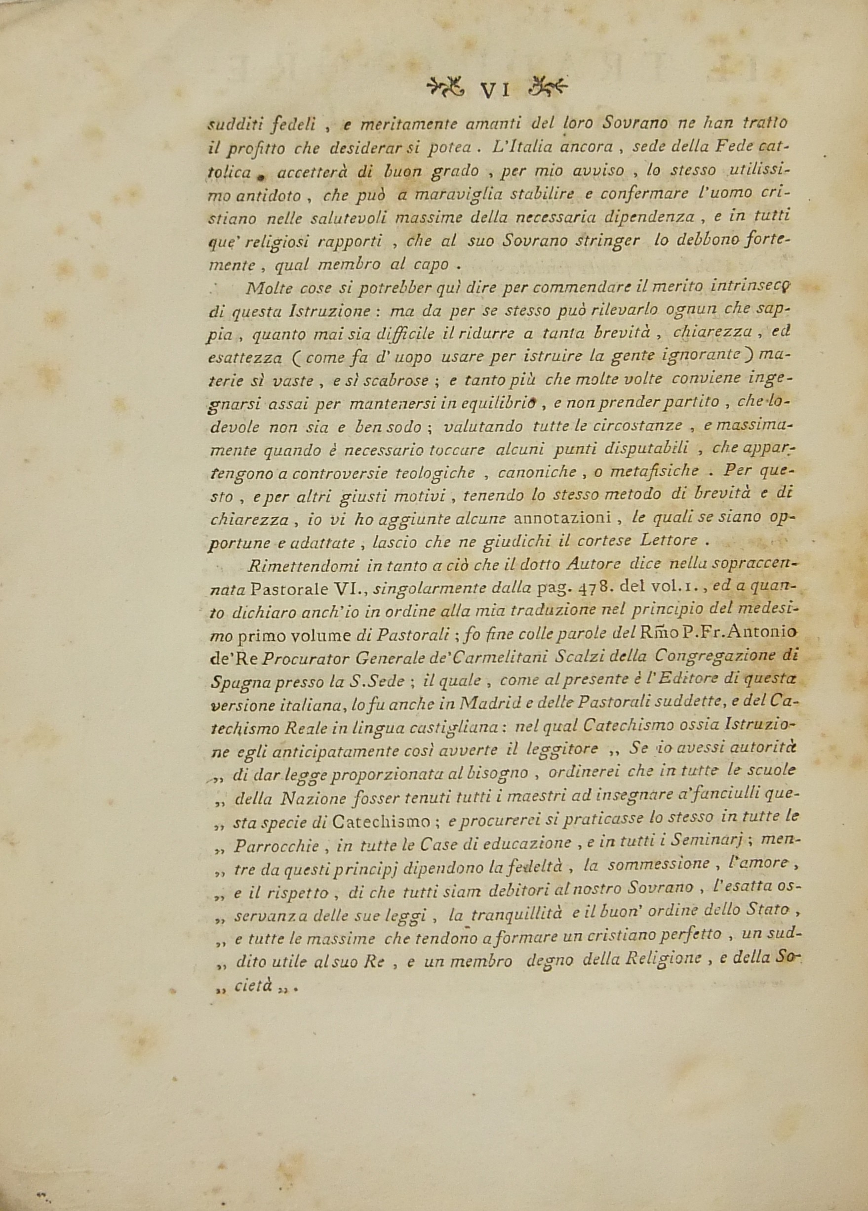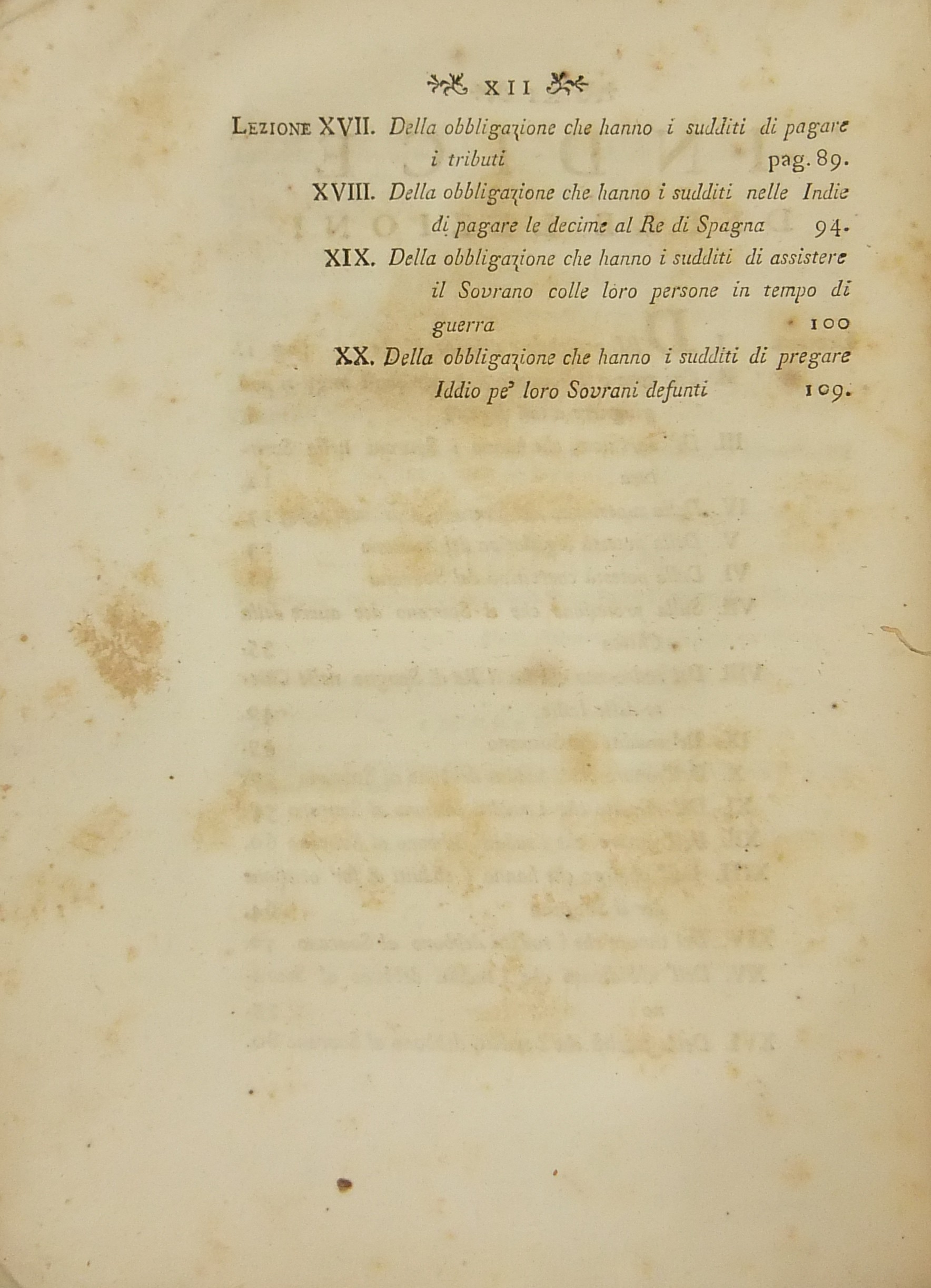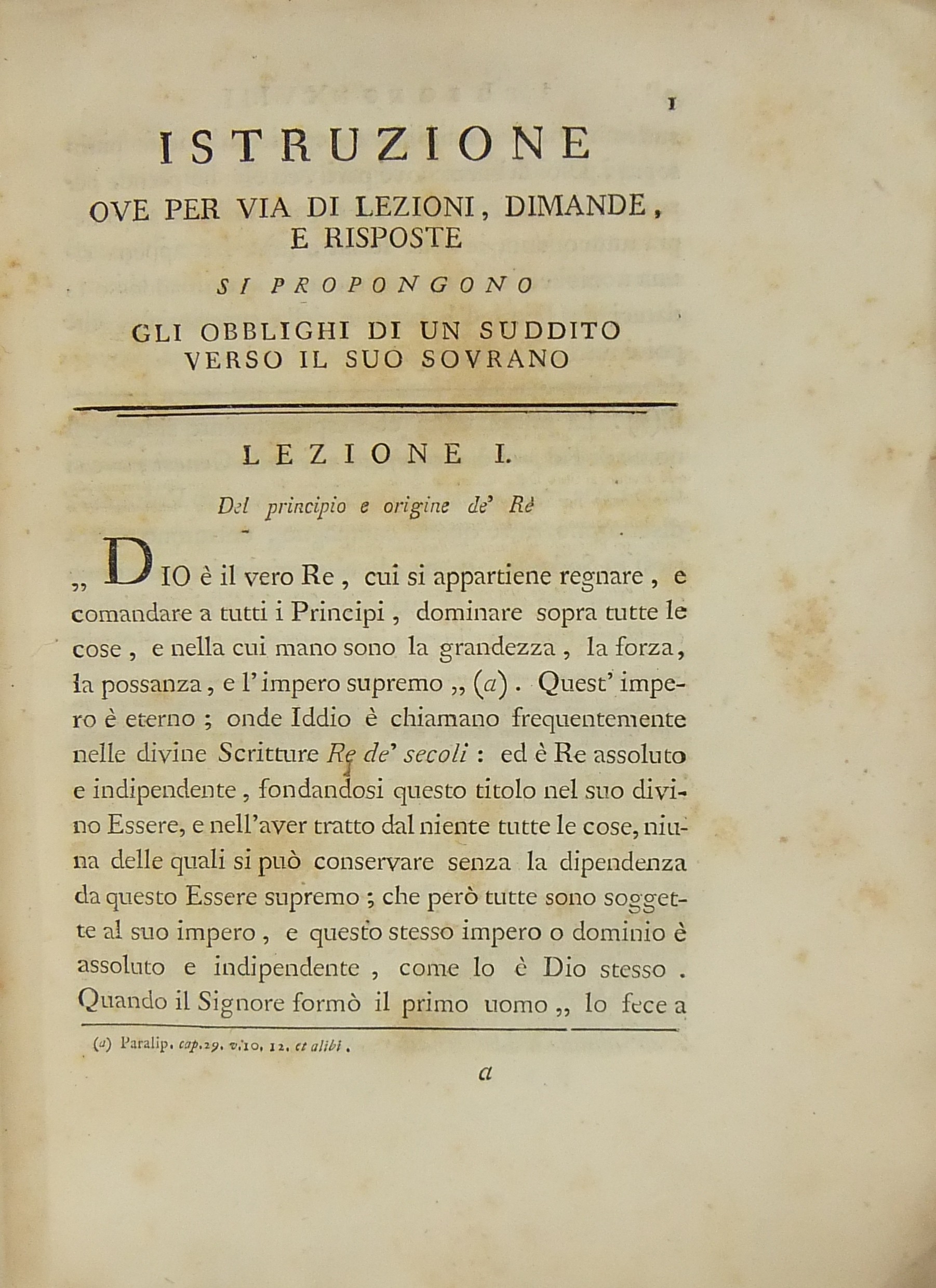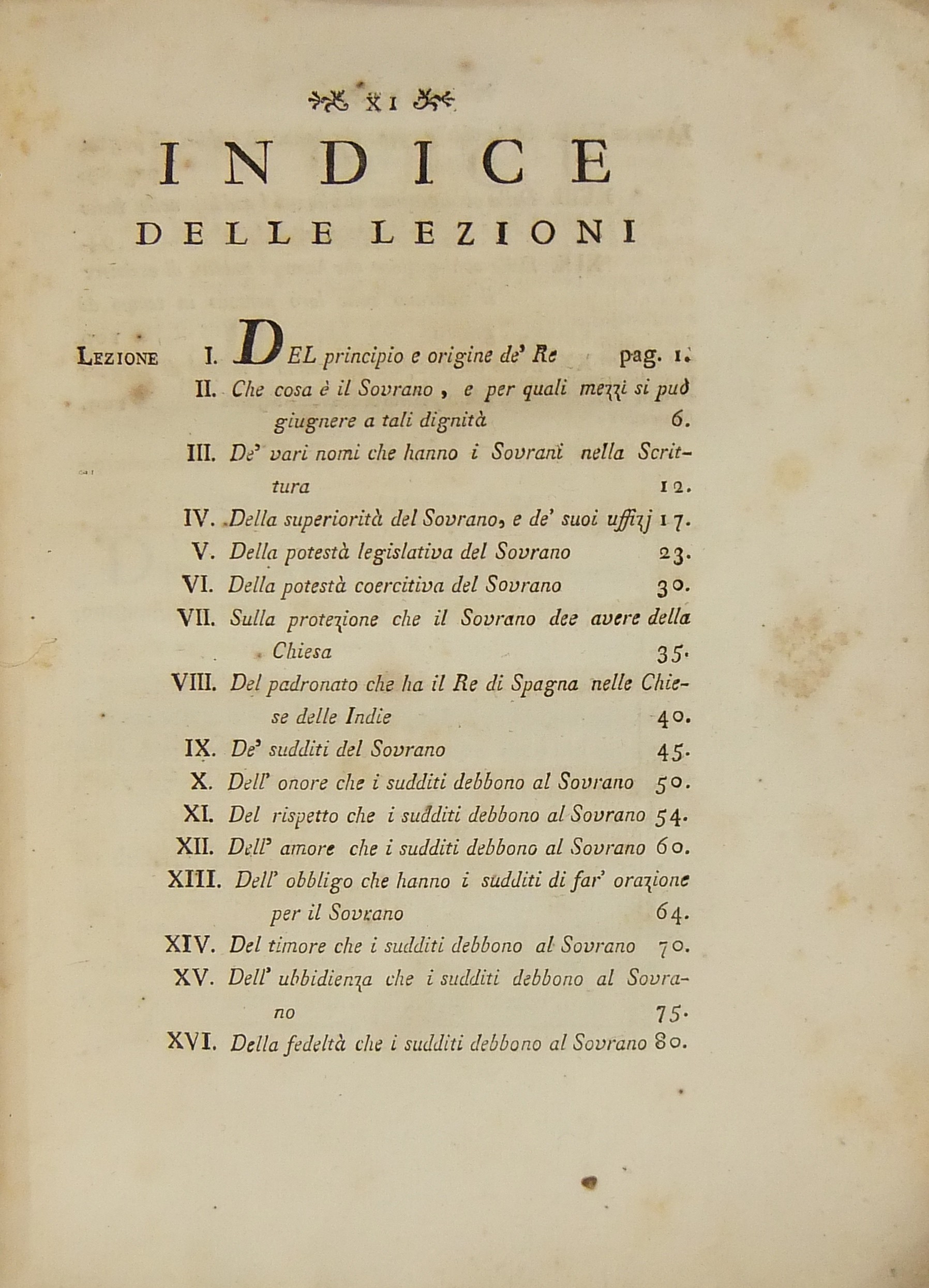 Obblighi del suddito verso il suo sovrano proposti per via di lezioni dimande e risposte dall'Illustrissimo e Reverendissimo Signore Monsig. D. Fr. Giuseppe Antonio di Sant'Alberto.. Traduzione dall'idioma spagnuolo nell'italiano del sacerdote D. Niccolò de Lagua. Coll'aggiunta di varie annotazioni
