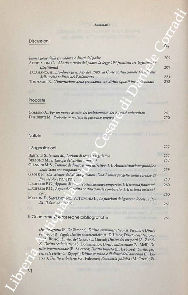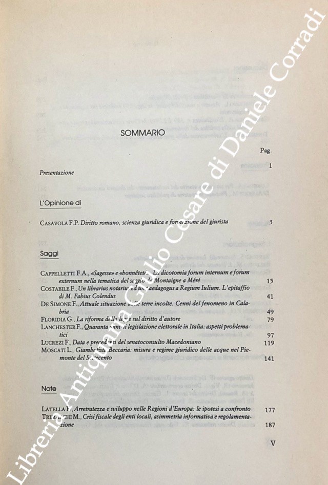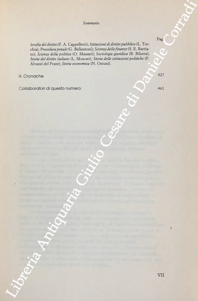 Scritti di: Arcidiacono, Bartole, Bellomo, Cappelletti, Casavola, Corbino, Costabile, D’Alberti, De Simone, Florida, Giannini, Grossi, Lanchester, Latella, Lucifredi, Lucrezi, Merloni, Moscati, Talamanca, Tommasini, Trimarchi
