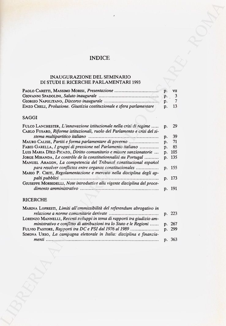 Scritti di: Caretti, Spadolini, Napolitano, Cheli, Lancaster, Fusaro, Calise, Garella, Diez-Picazo, Miranda, Aragon, Chiti, Morbidelli, Lopresti, Mannelli, Pastore, Urso