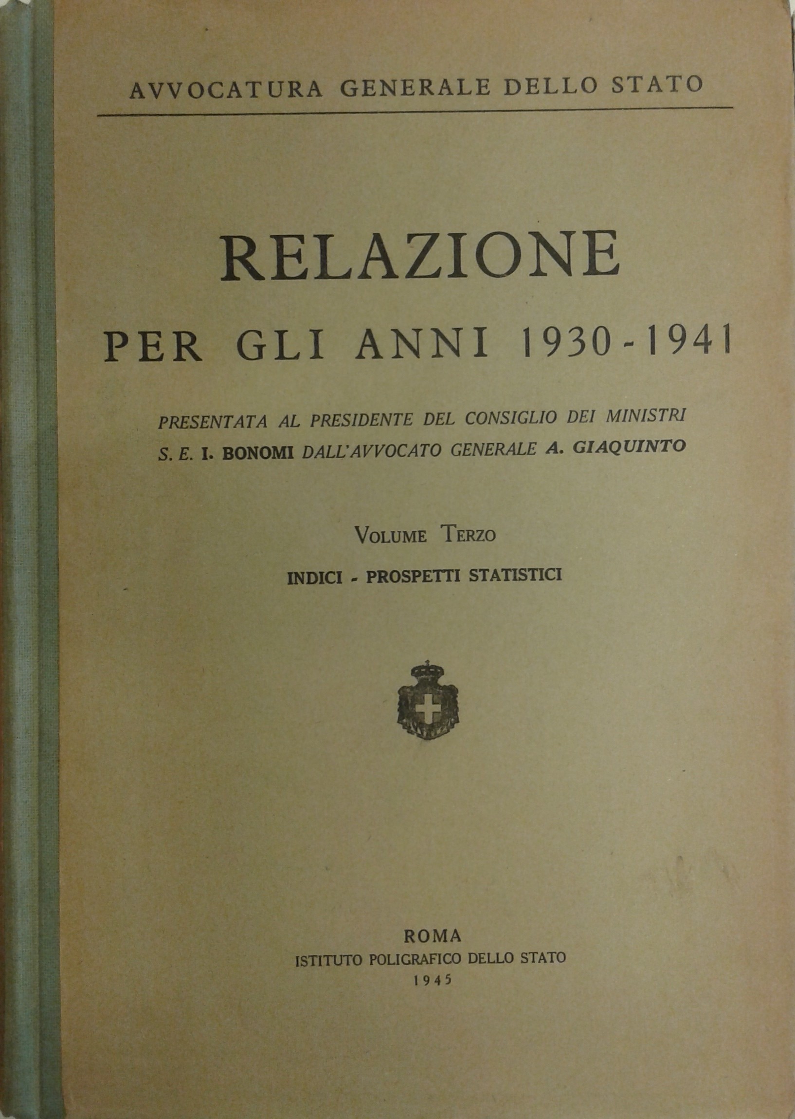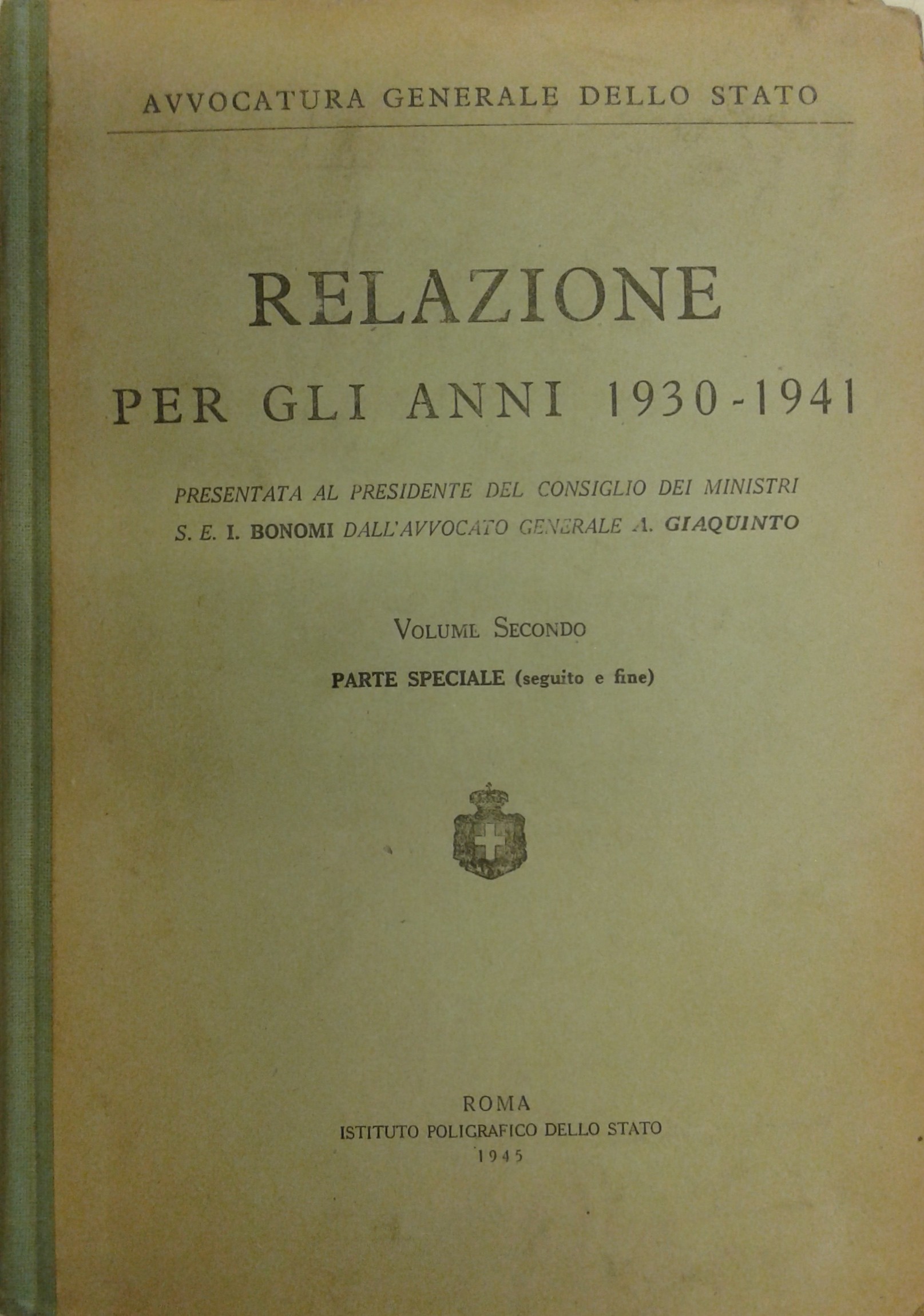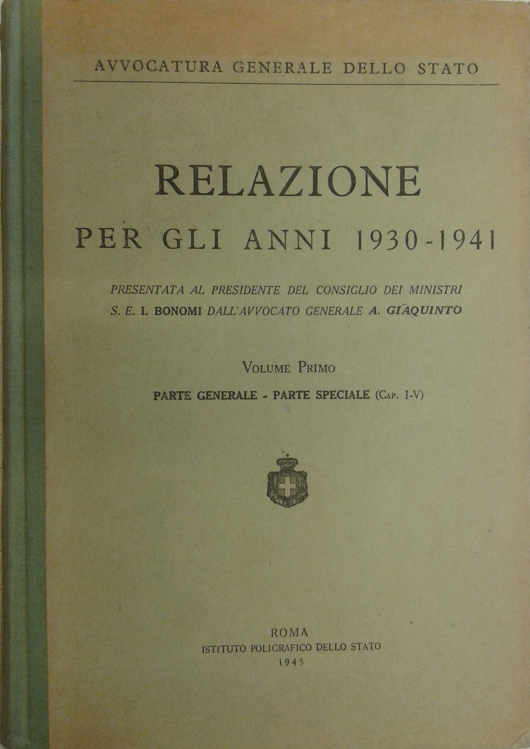 Relazione per gli anni 1930-1941. Presentata al Presidente del Consiglio dei Ministri S.E. I. Bonomi dall'Avvocato Generale A. Giaquinto