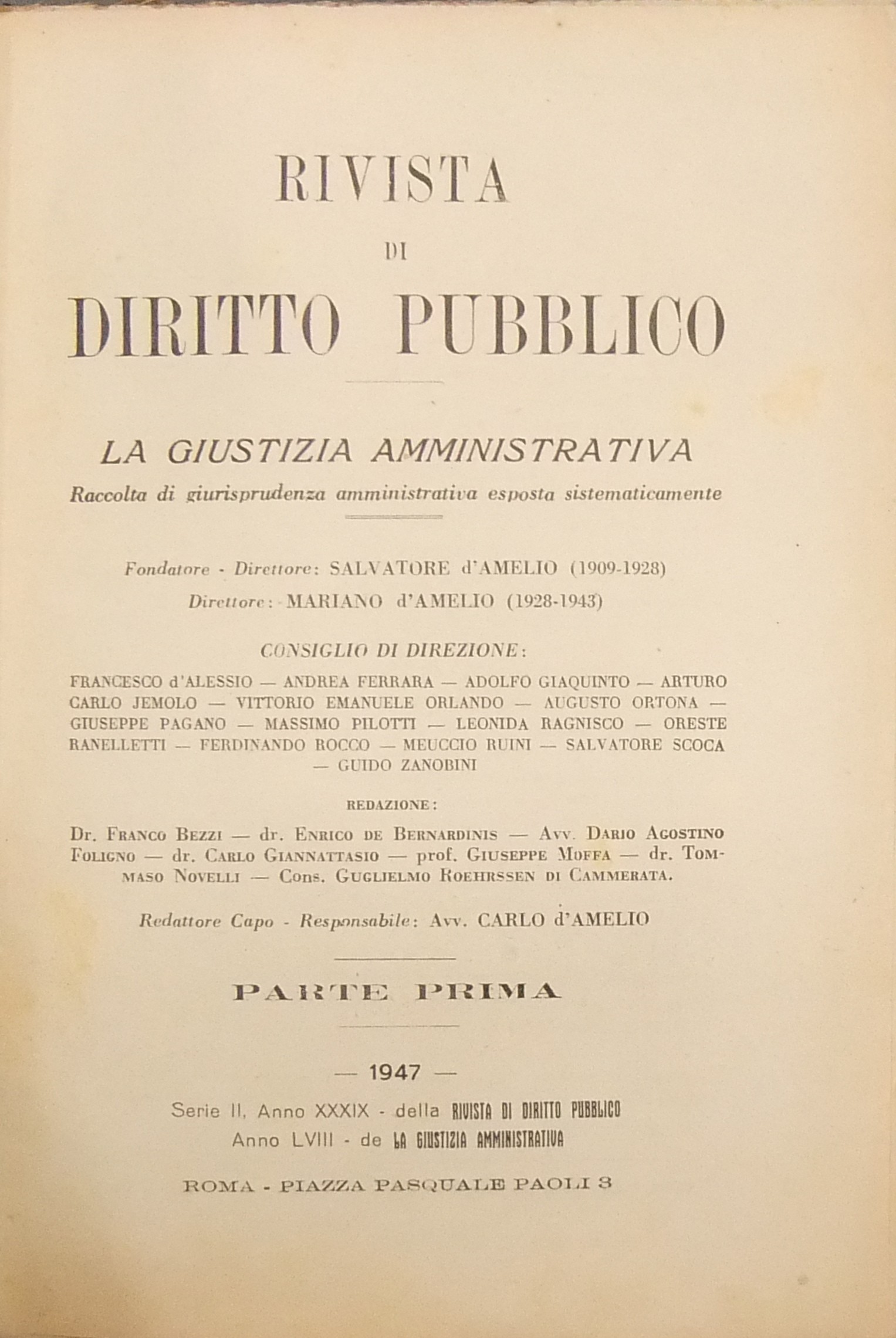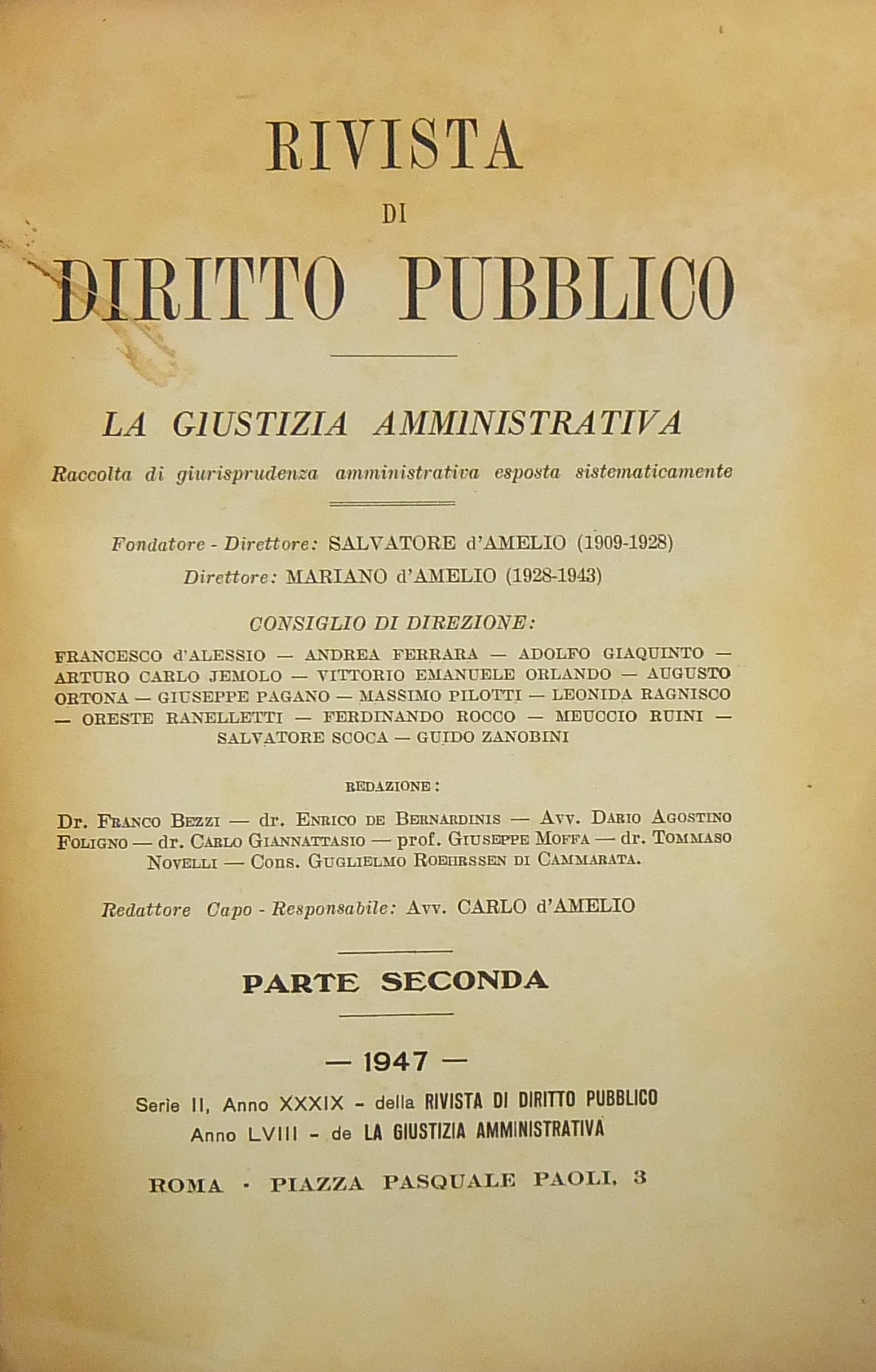 Fondatore Salvatore D’amelio. Direttore Mariano D’Amelio. Consiglio di direzione: F. D’Alessio, A. Ferrara, Giaquinto, Jemolo, Orlando, Ortona, Pagano, Pilotti, Ragnisco, Ranelletti, F. Rocco, Rioni, S. Scoca, Zanobini.