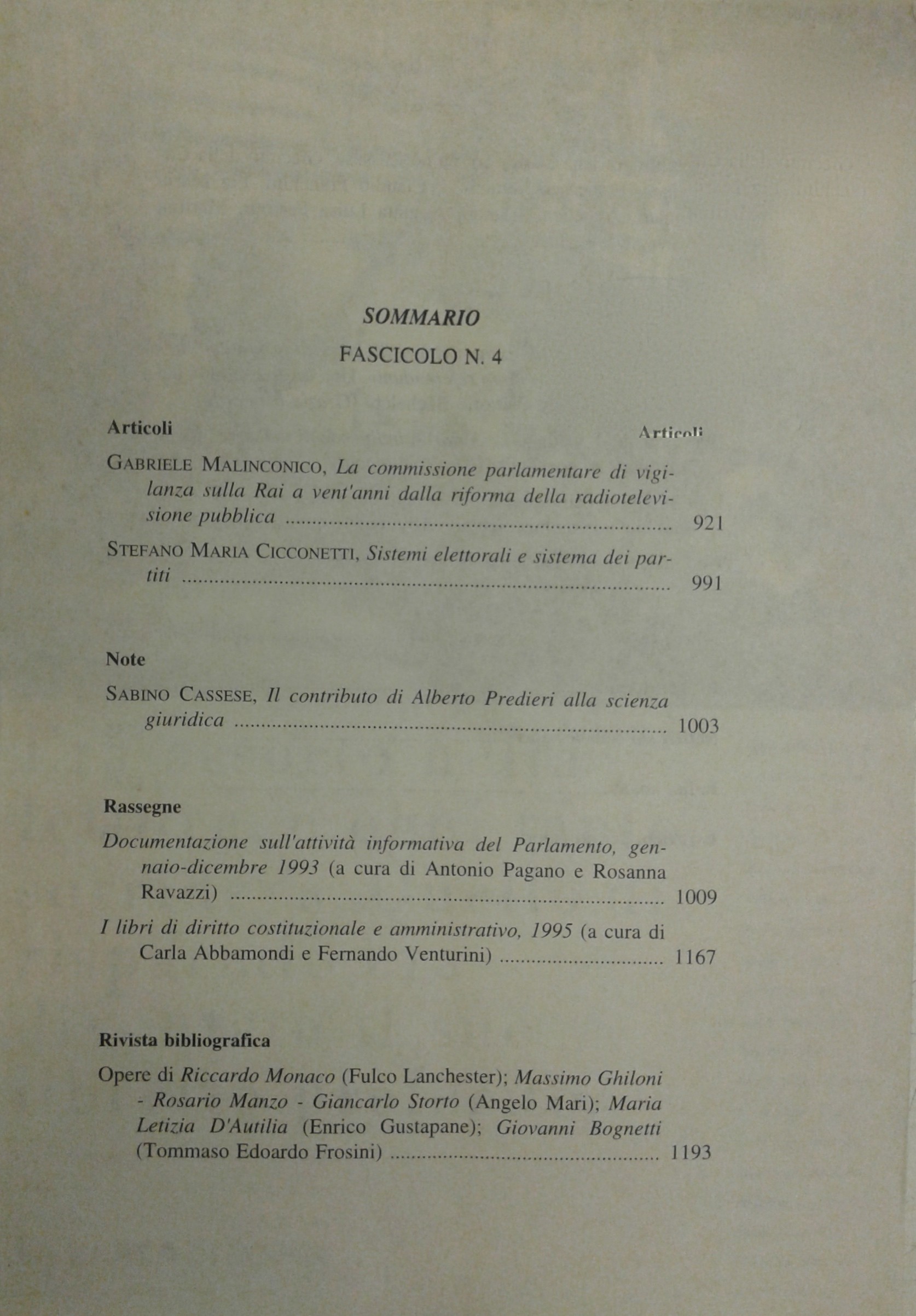 Rivista trimestrale di diritto pubblico. Fondata da Guido Zanobini. Diretta da Giovanni Miele e Massimo Severo Giannini. Anno XLVI - 1996
