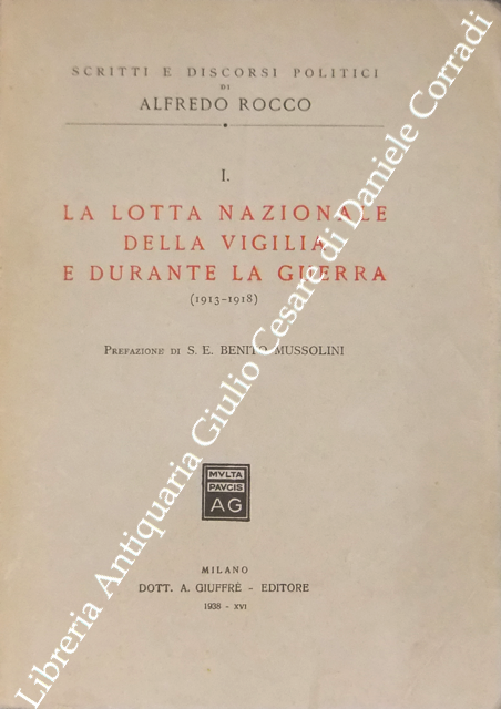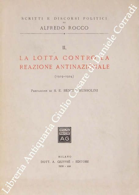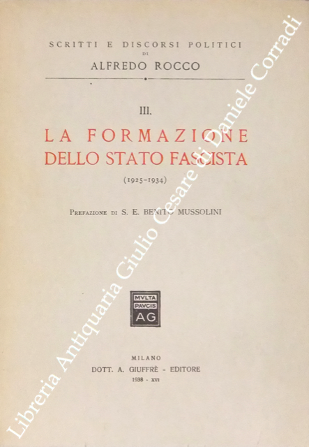Scritti e discorsi politici di Alfredo Rocco. Vol. I - La lotta nazionale della vigilia e durante la guerra (1913-1918). Prefazione di S. E. Benito Mussolini; Vol. II - La lotta contro la reazione antinazionale (1919-1924). Prefazione di S. E. Benito Mussolini; Vol. III - La formazione dello Stato fascista (1925-1934). Prefazione di S. E. Benito Mussolini