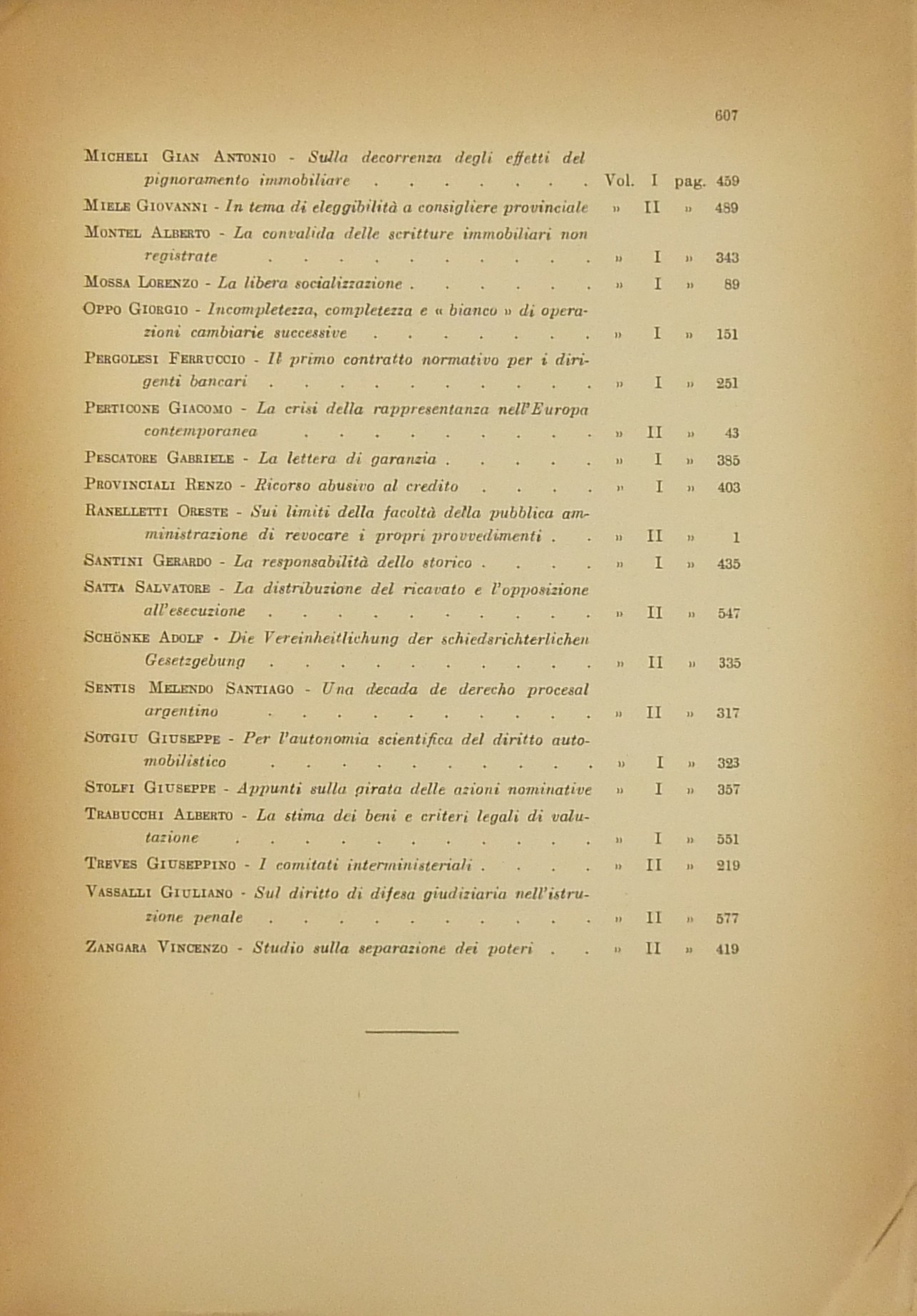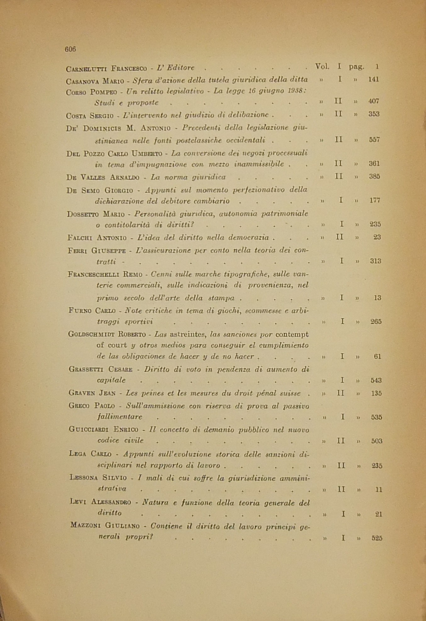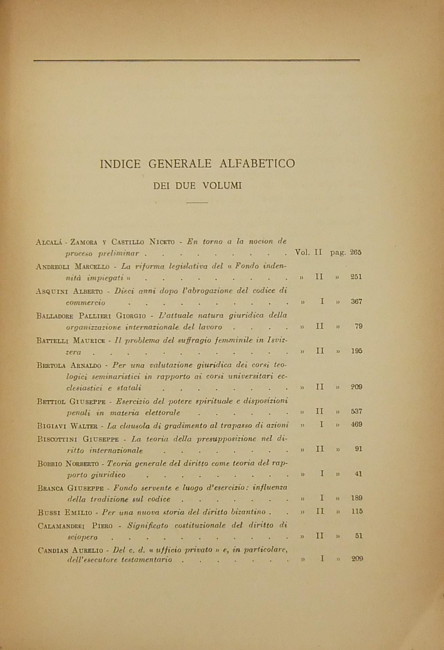Ritratto fotografico di Antonio Milani ad inizio del primo volume. Scritti di: Alcalà Zamora y Castillo Niceto, M. Andreoli, Asquini, Balladore Pallieri, Battelli, Bertola, Bettiol, Bigiavi, Biscottini, Bobbio, Branca, Bussi, Calamandrei, Candian, Carnelutti, Casanova, Corso, Costa, De' Dominicis, Del Pozzo, De Valles, De Semo, Dossetto, Falchi, G. Ferri, R. Franceschelli, Furno, Goldschmidt, Grassetti, Graven, P. Greco, Guicciardi, Lega, Lessona, A. Levi, Mazzoni, Micheli, G. Miele, Montel, Mossa, Oppo, Pergolesi, Perticone, G. Pescatore, Provinciali, Ranelletti, Santini, S. Satta, Schonke, Sentis Melendo, Sotgiu, G. Stolfi, Trabucchi, G. Treves, G. Vassalli, Zangara.