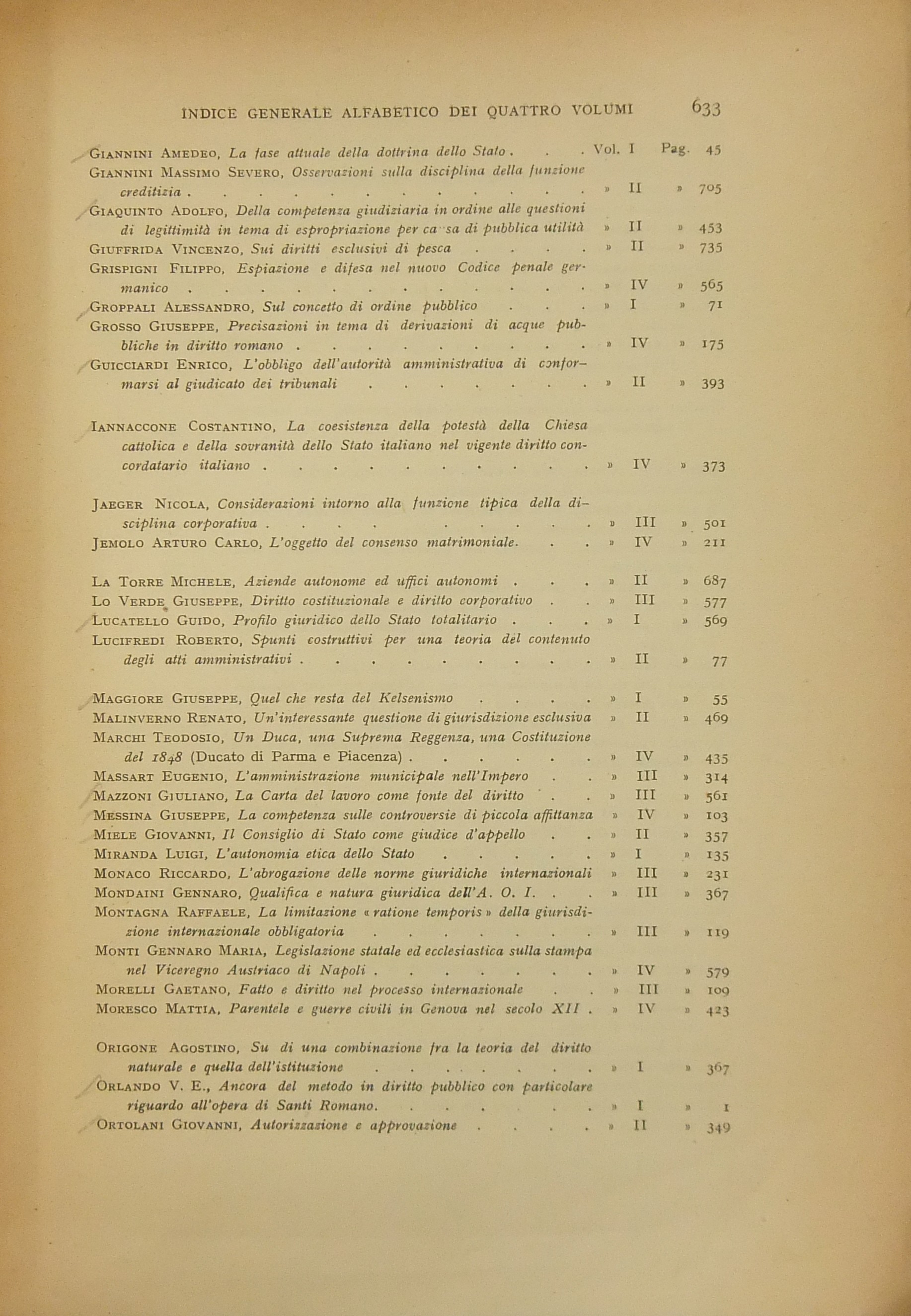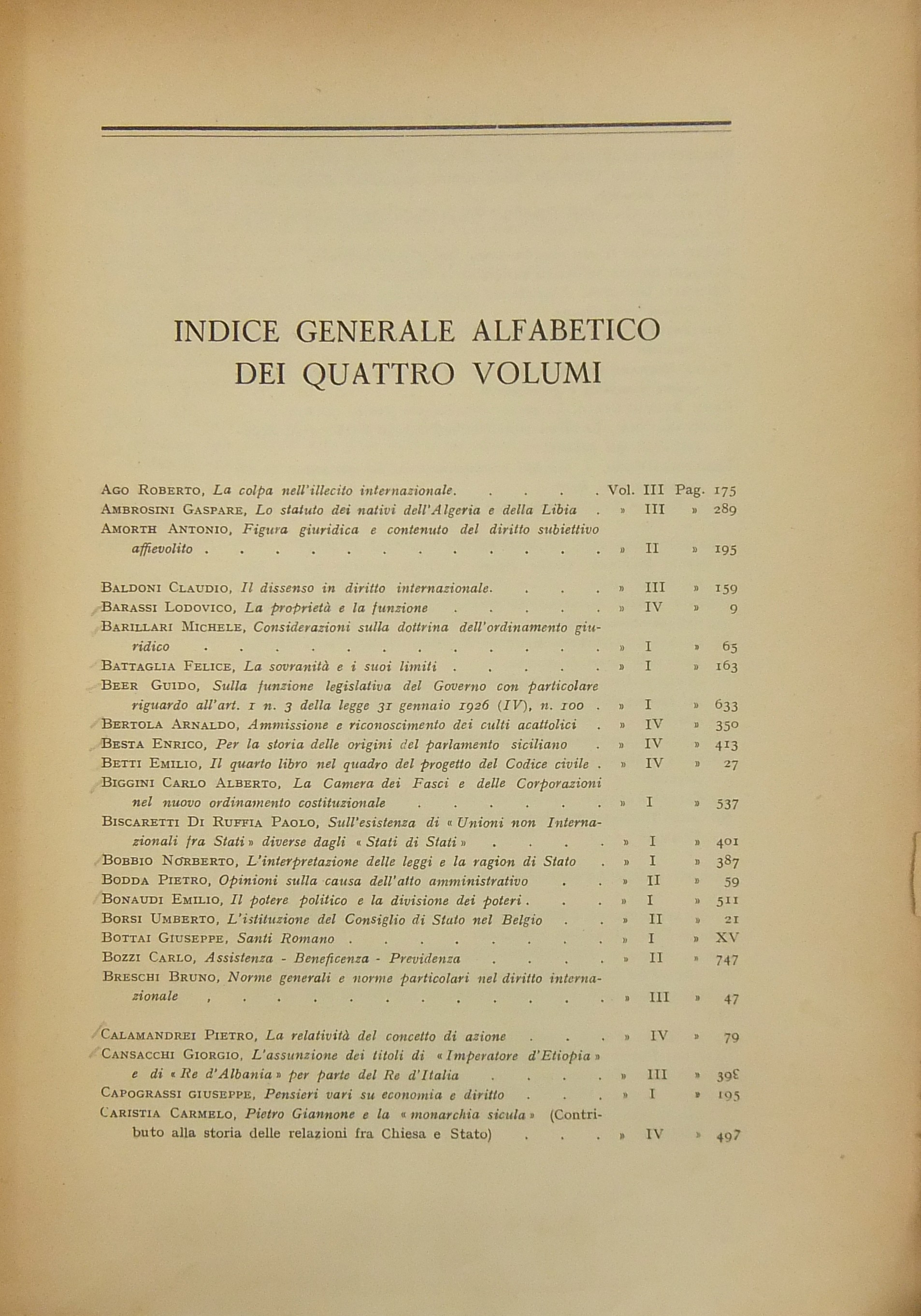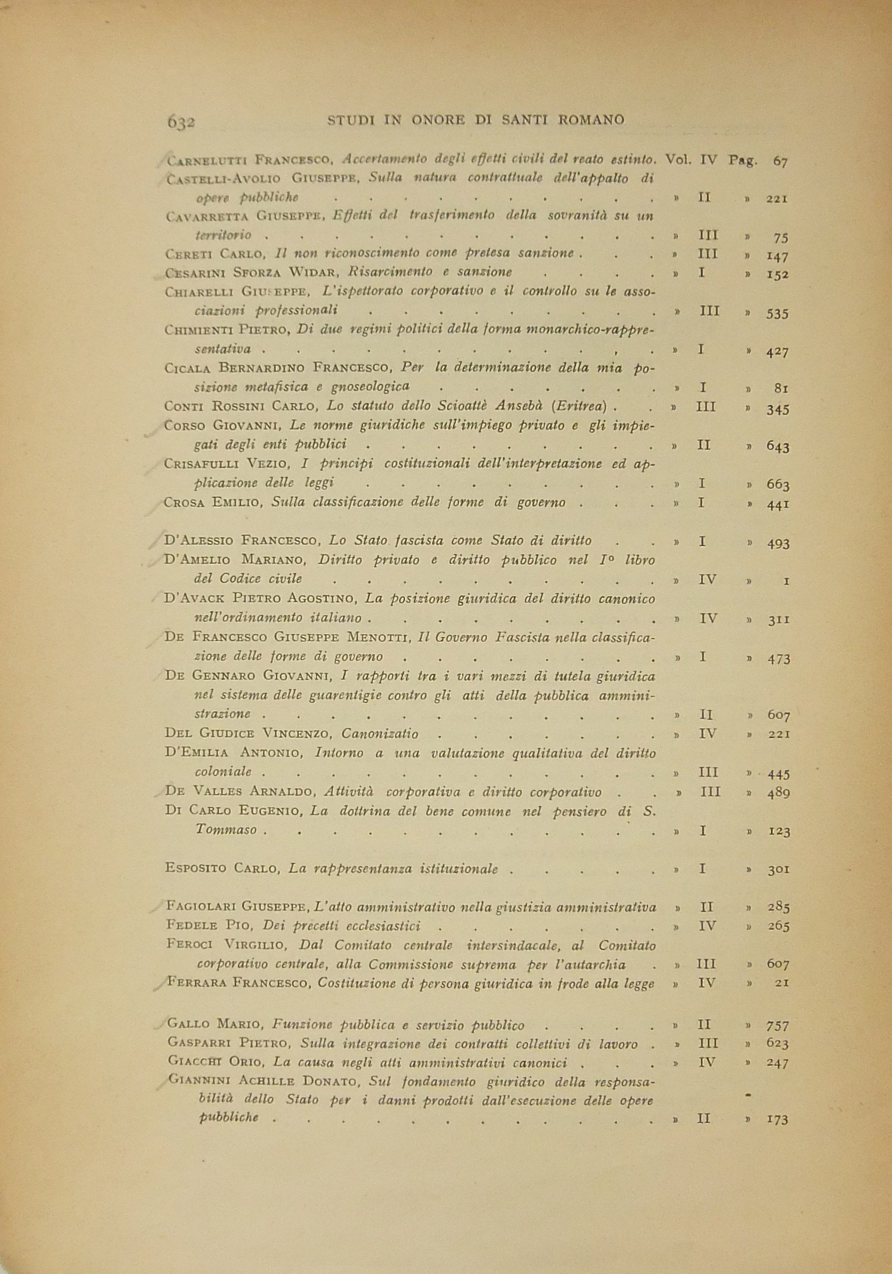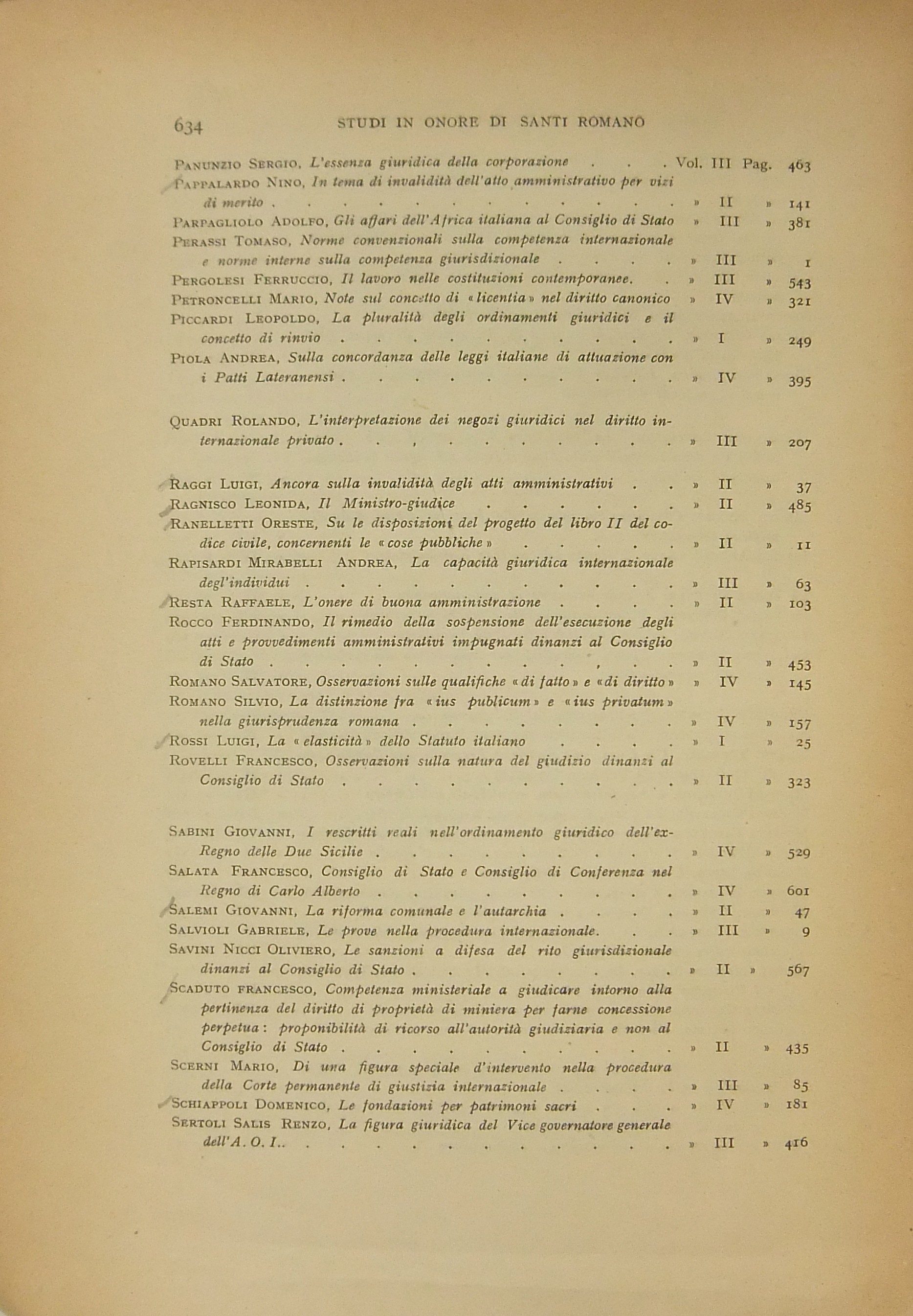 Ritratto fotografico di Santi Romano ad inizio del primo volume. Scritti di: Ago, G.Ambrosini, A.Amorth, Baldoni, Barassi, Barillari, Battaglia, Beer, Bertola, Besta, Betti, Biggini, Biscaretti Di Ruffia, Bobbio, Bodda, Bonaudi, Borsi, Bottai, Bozzi, Breschi, Calamandrei, Cansacchi, Capograssi, Caristia, Carnelutti, Castelli Avolio, Cavarretta, Cereti, Cesarini Sforza, Chiarelli, Chimienti, Cicala, Conti Rossini, Corso, V.Crisafulli, Crosa, D’Alessio, D’Amelio, D’Avack, De Francesco G.M., De Gennaro, Del Giudice V., D’Emilia, de Valles, Di Carlo, Esposito, Fagiolari, Fedele, Feroci, Ferrara F., Gallo, Gasparri, Giacchi, Giannini A.D., Giannini A., Giannini M.S., Giaquinto, Giuffrida V., Grispigni F., Groppali, Grosso G., Guicciardi, Iannaccone, Jaeger, Jemolo, La Torre, Lo Verde, Lucatello, Lucifredi, Maggiore, Malinverno, Marchi, Massart, Mazzoni, Messina, Miele G., Miranda, Monaco R., Mondaini, Montagna, Monti G.M., Morelli, Moresco, Origone, Orlando, Ortolani, Panunzio, Pappalardo, Parpagliolo, Perassi, Pergolesi, Petroncelli, Piccardi, Piola, Quadri R., Raggi, Ragnisco, Ranelletti, Rapisardi Mirabelli, Resta, Rocco F., Romano Salvatore, Romano Silvio, Rossi L., Rovelli, Sabini, Salata, Salemi, Salvioli, Savini Nicci, Scaduto, Scerni, Schiappoli, Sertoli Salis, Tosato, Udina, Vacchelli, Vannini, Vuoli, Zanobini.