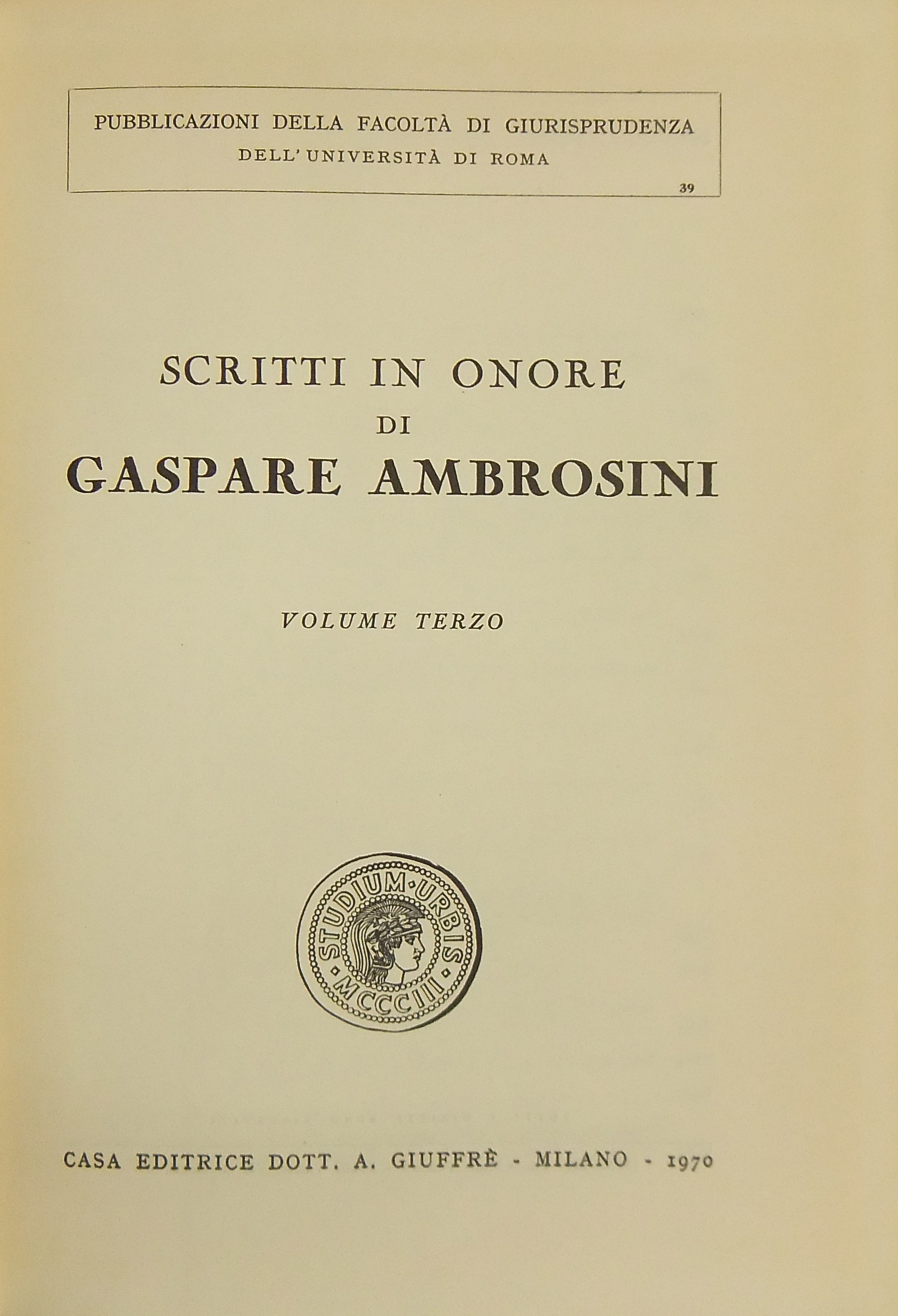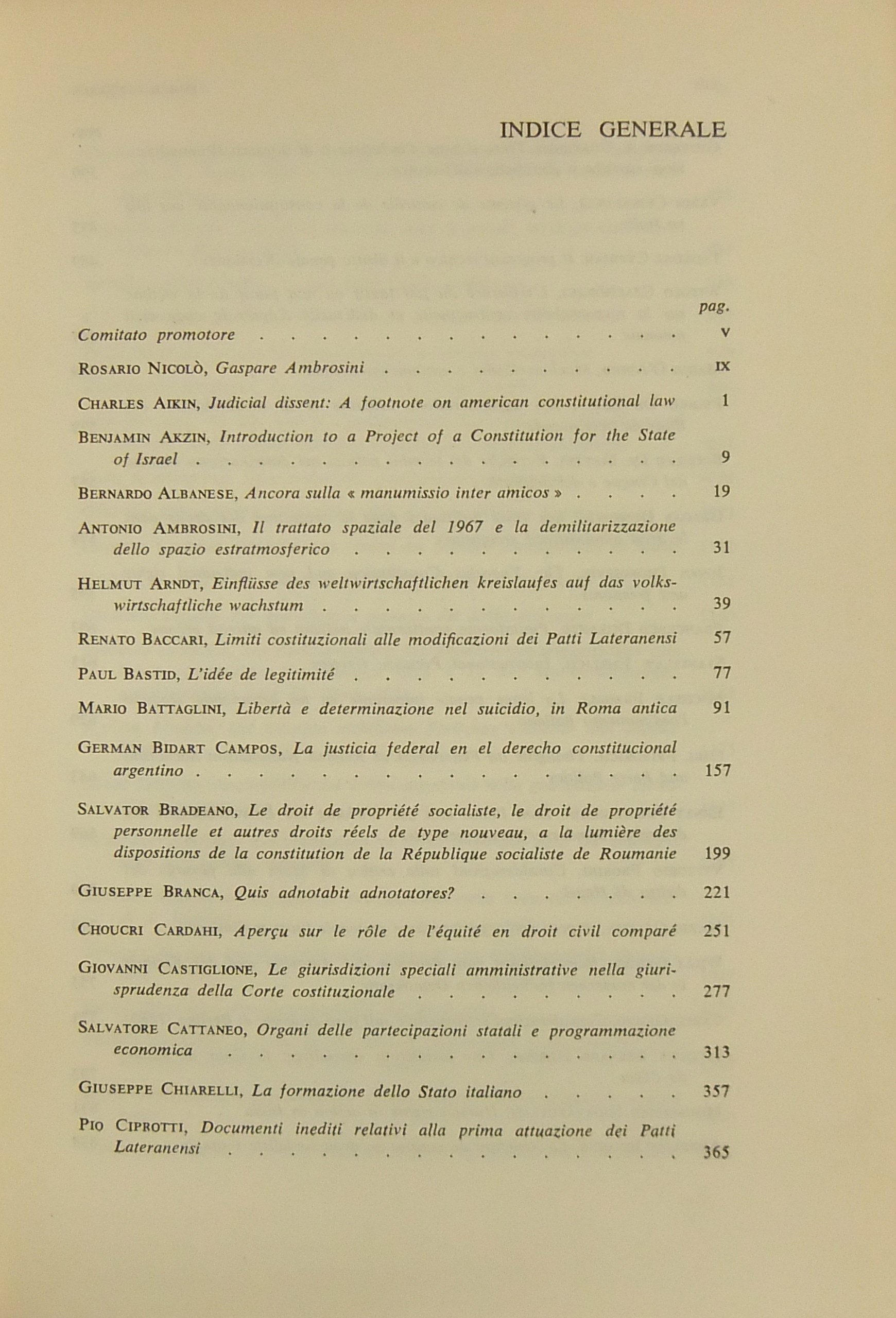 Ritratto fotografico di Ambrosini ad inizio del primo volume. Scritti di: C. Aikin, B. Arkin, Albanese, G. Ambrosini, Arndt, Baccari, Bastid, Battaglini, Bidart Campos, S. Bradeano, Branca, Cardahi, Castiglione, S. Cattaneo, Chiarelli, Ciprotti, G.A. Costanzo, V.Crisafulli, Cyprian, Czachòrski, D’Addio, De Briey, De Mattei, Denkovic, Djordjevic, Durante, Ehrlich, Fragali, Friedrich, Friesenhahn, V. Frosini, Galizia, Geiger, Giglio, Herzog, Hidayatullah, A. Ionasco, T. Ionasco, Jedryka, Jemolo, Kapur, Kastari, Katzarov, Kersell, Klinghoffer, Kuchenhoff, Langrod, Lavagna, Leanza, Leibholz, Leisner, Lessona, Luchaire, Marongiu, Maunz, Melichar, Modugno, Nadelmann, G. Negri, Nicolò, Odent, Oestreich, Palazzoli, Paresce, Pensovecchio Li Bassi, Pergolesi, Perticone, Petrilli, Pfeifer, O.H. Phillips, Pinto, Piola, Ramaswami, Rowatt, Rozmaryn, Rupp, A.M. Sandulli, Sawer, Scheffler, F.B. Schick, L. Schultz, Schunck, G. Sciascia, Spagna Musso, Sperduti, Spicer, Srzentic, Stein, Stjepanovic, Szaszy, Tosato, Udina, Venezia, Villari, Zangara, Zingali.