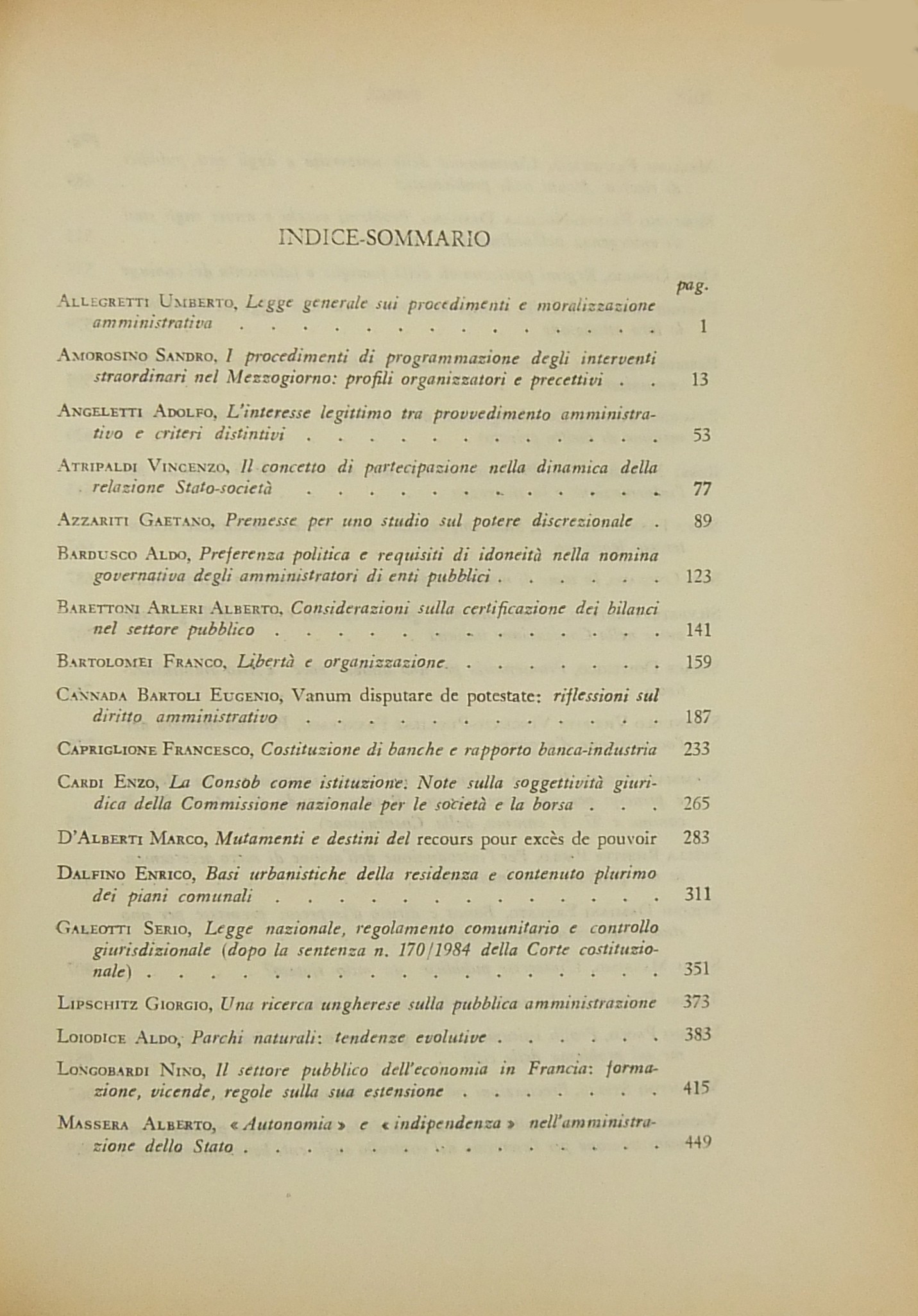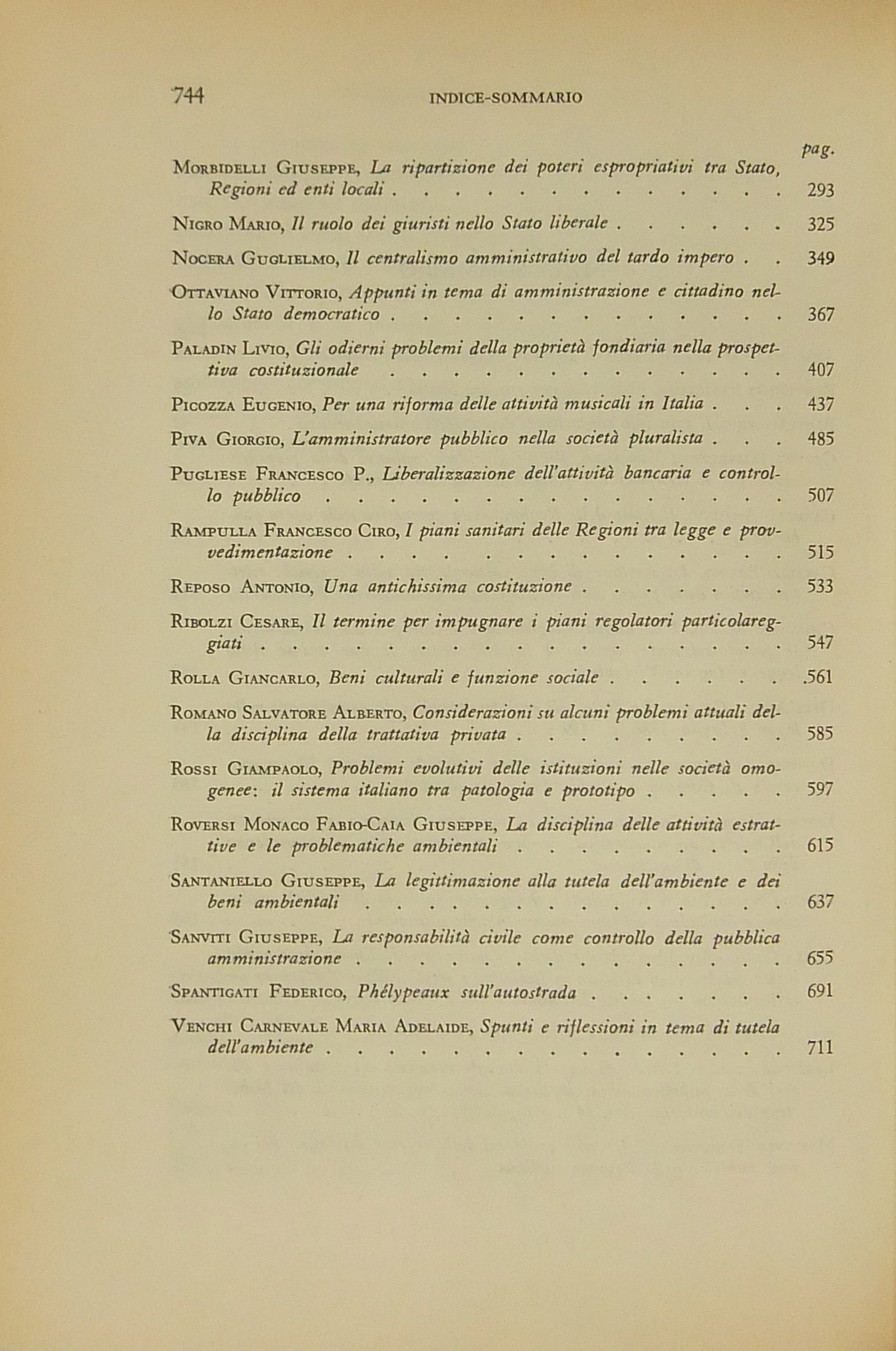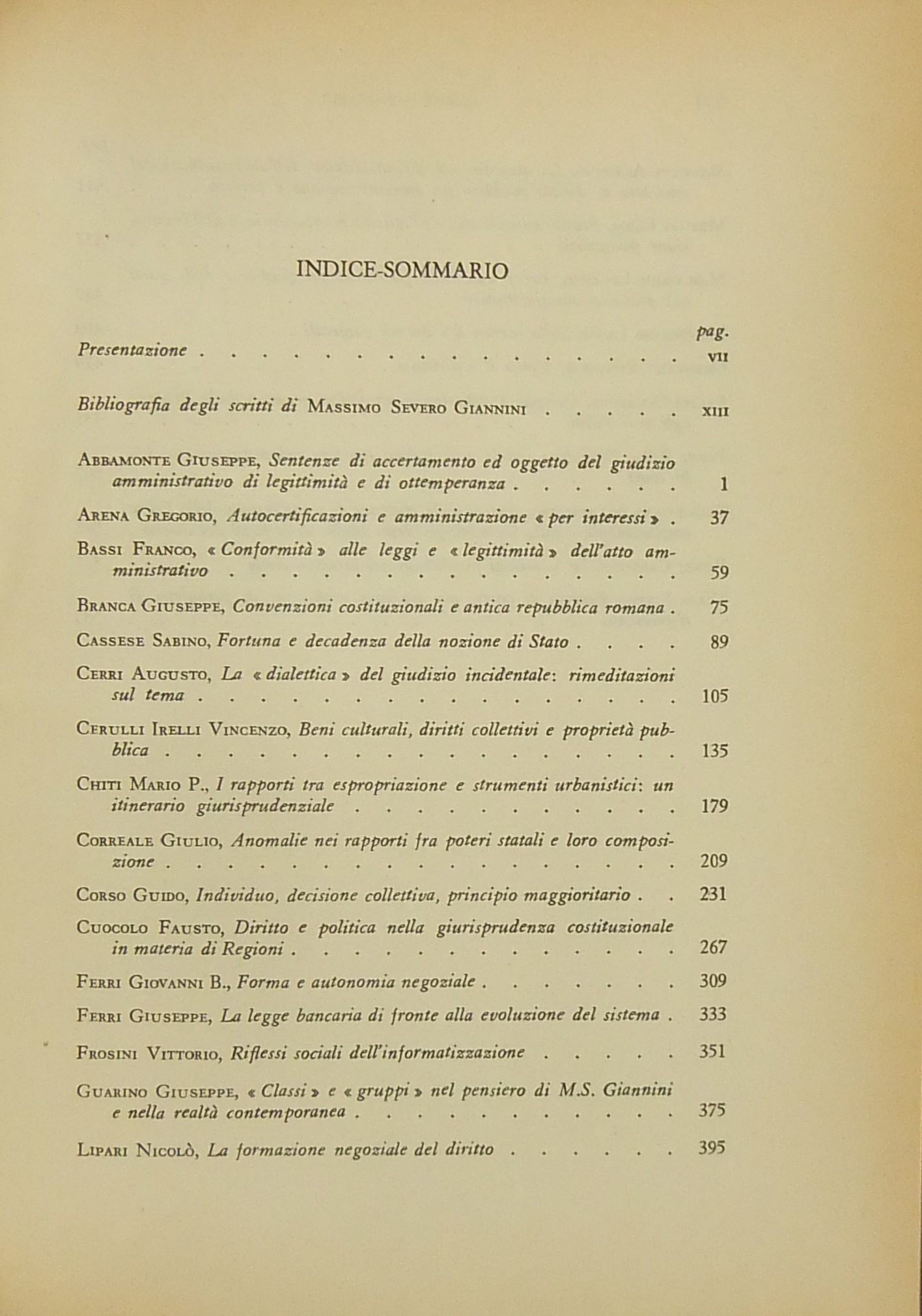 Scritti di: Abbamonte, Allegretti, Amorosino, Angeletti, Arena, Armaroli, Atripaldi, Azzariti, Bardusco, Barettoni Arleri, Bartolomei, Bassi, Benvenuti, Berti, Branca, Cannada Bartoli, Capriglione, Caputi, Cardi, Carullo, S. Cassese, B. Cavallo, Cerri, Cerulli Irelli, Chiavario, Chiti, Correale, Corso, Cuocolo, D'Alberti, Dalfino, Dell'Acqua, Dominici, Esposito, G.B. Ferri, G. Ferri, V. Frosini, Galeotti, Giocoli Nacci, Gorla, G. Guarino, Italia, S. Labriola, Lipari, Lipschitz, Loiodice, Longobardi, Martines, Massera, A. Masucci, Merloni, Merusi, Migliorini, Modugno, Montesano, Morbidelli, Nigro, Nocera, Oppo, Orestano, Ottaviano, Paldin, Palma, G. Pastori, Perez, Picozza, Piva, Pizzorusso, Predieri, F. Pugliese, Punzi, Rampulla, Reposo, P. Rescigno, Ribolzi, Rolla, S.A. Romano, G. Rossi, Rossi Merighi, Roversi Monaco, Santaniello, Sanviti, Scoca, Sepe, Silvestri, Sorace, Spagnuolo Vigorita, Spantigati, Stammati, P. Stella Richter, Sticchi, Stipo, Teresi, Urbani, Valentini, Venchi Carnevale, Vignocchi, Virga.
