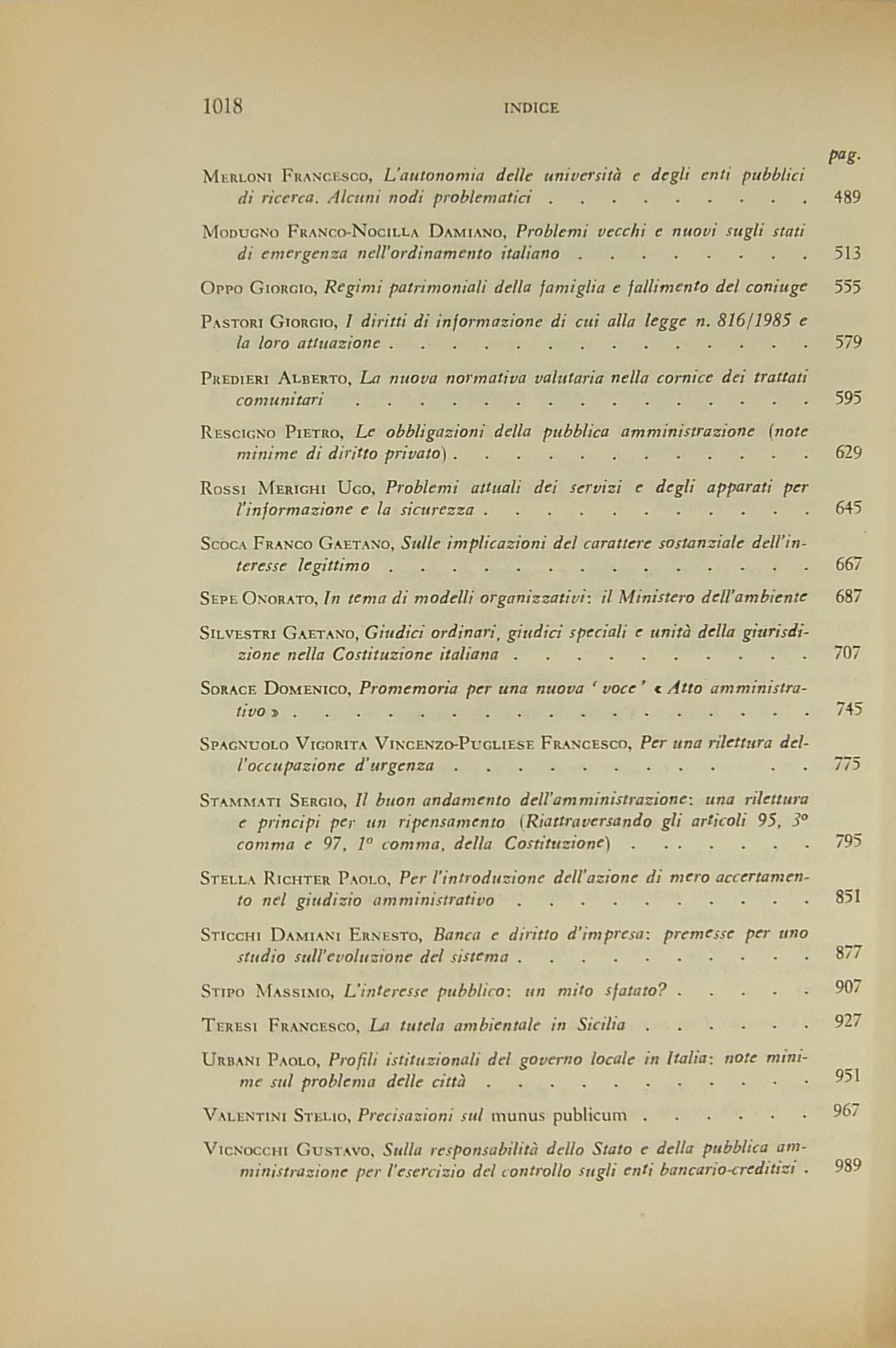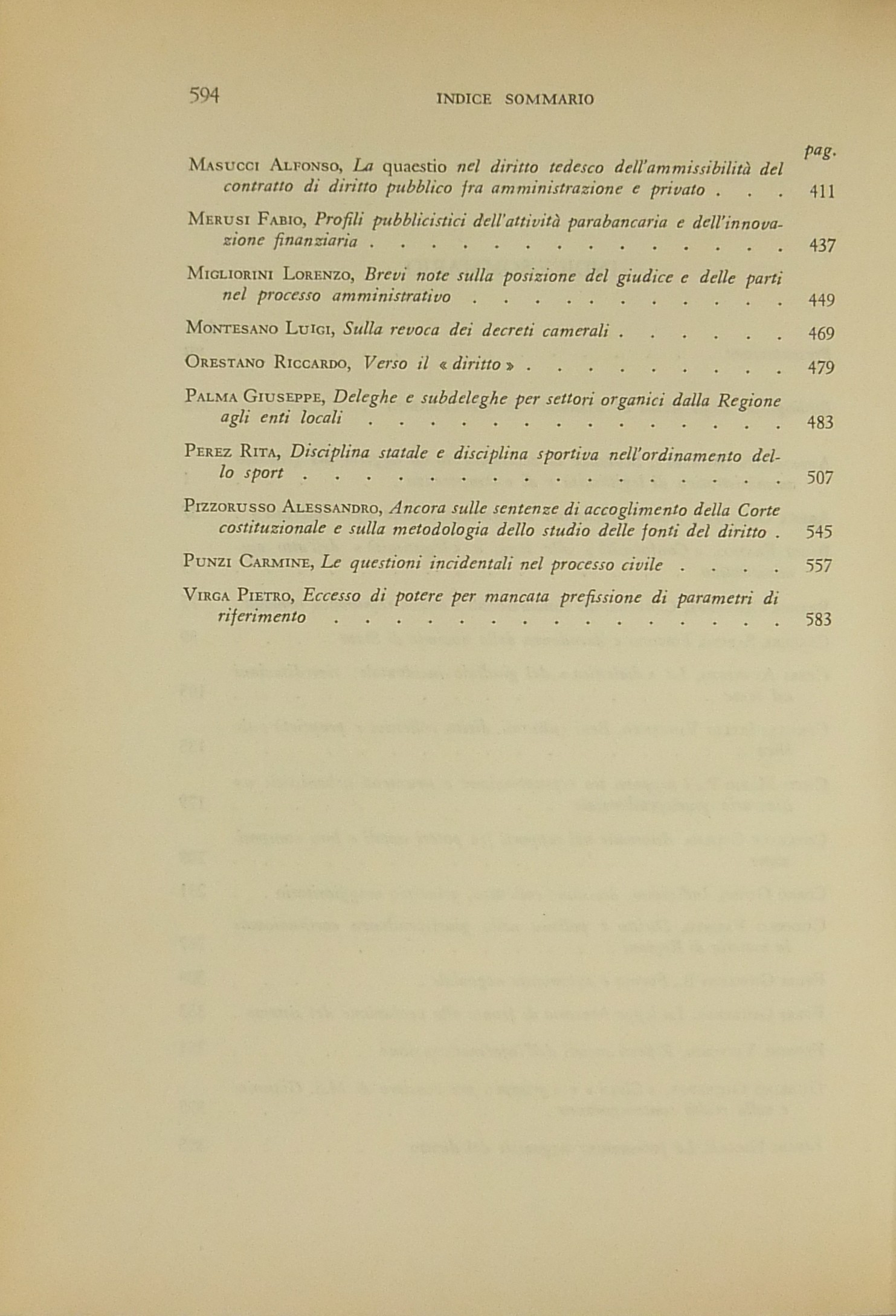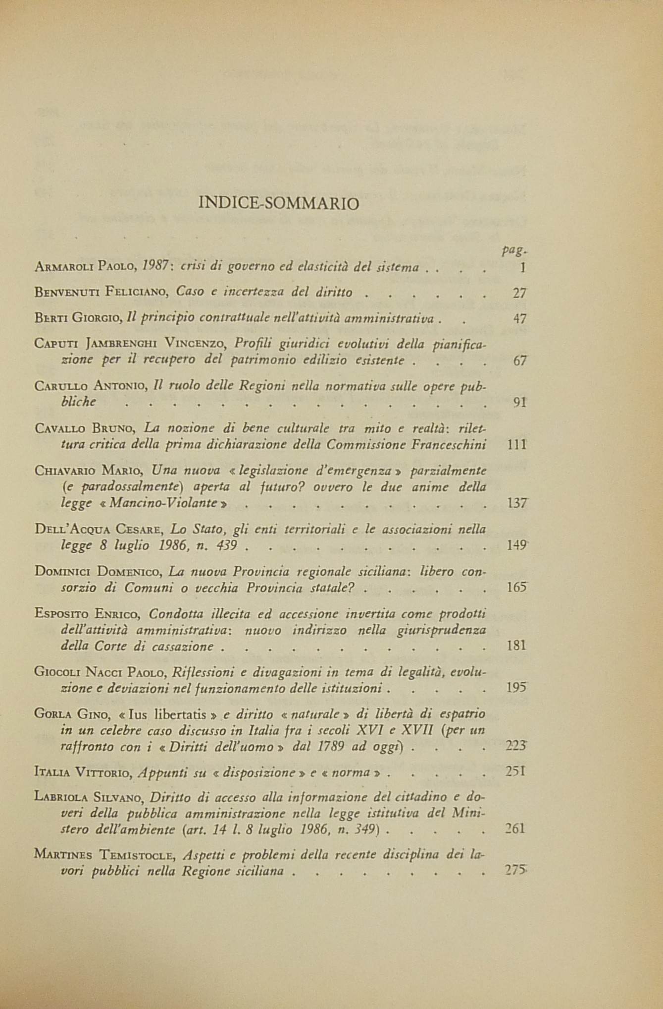 Scritti di: Abbamonte, Allegretti, Amorosino, Angeletti, Arena, Armaroli, Atripaldi, Azzariti, Bardusco, Barettoni Arleri, Bartolomei, Bassi, Benvenuti, Berti, Branca, Cannada Bartoli, Capriglione, Caputi, Cardi, Carullo, S. Cassese, B. Cavallo, Cerri, Cerulli Irelli, Chiavario, Chiti, Correale, Corso, Cuocolo, D'Alberti, Dalfino, Dell'Acqua, Dominici, Esposito, G.B. Ferri, G. Ferri, V. Frosini, Galeotti, Giocoli Nacci, Gorla, G. Guarino, Italia, S. Labriola, Lipari, Lipschitz, Loiodice, Longobardi, Martines, Massera, A. Masucci, Merloni, Merusi, Migliorini, Modugno, Montesano, Morbidelli, Nigro, Nocera, Oppo, Orestano, Ottaviano, Paldin, Palma, G. Pastori, Perez, Picozza, Piva, Pizzorusso, Predieri, F. Pugliese, Punzi, Rampulla, Reposo, P. Rescigno, Ribolzi, Rolla, S.A. Romano, G. Rossi, Rossi Merighi, Roversi Monaco, Santaniello, Sanviti, Scoca, Sepe, Silvestri, Sorace, Spagnuolo Vigorita, Spantigati, Stammati, P. Stella Richter, Sticchi, Stipo, Teresi, Urbani, Valentini, Venchi Carnevale, Vignocchi, Virga.