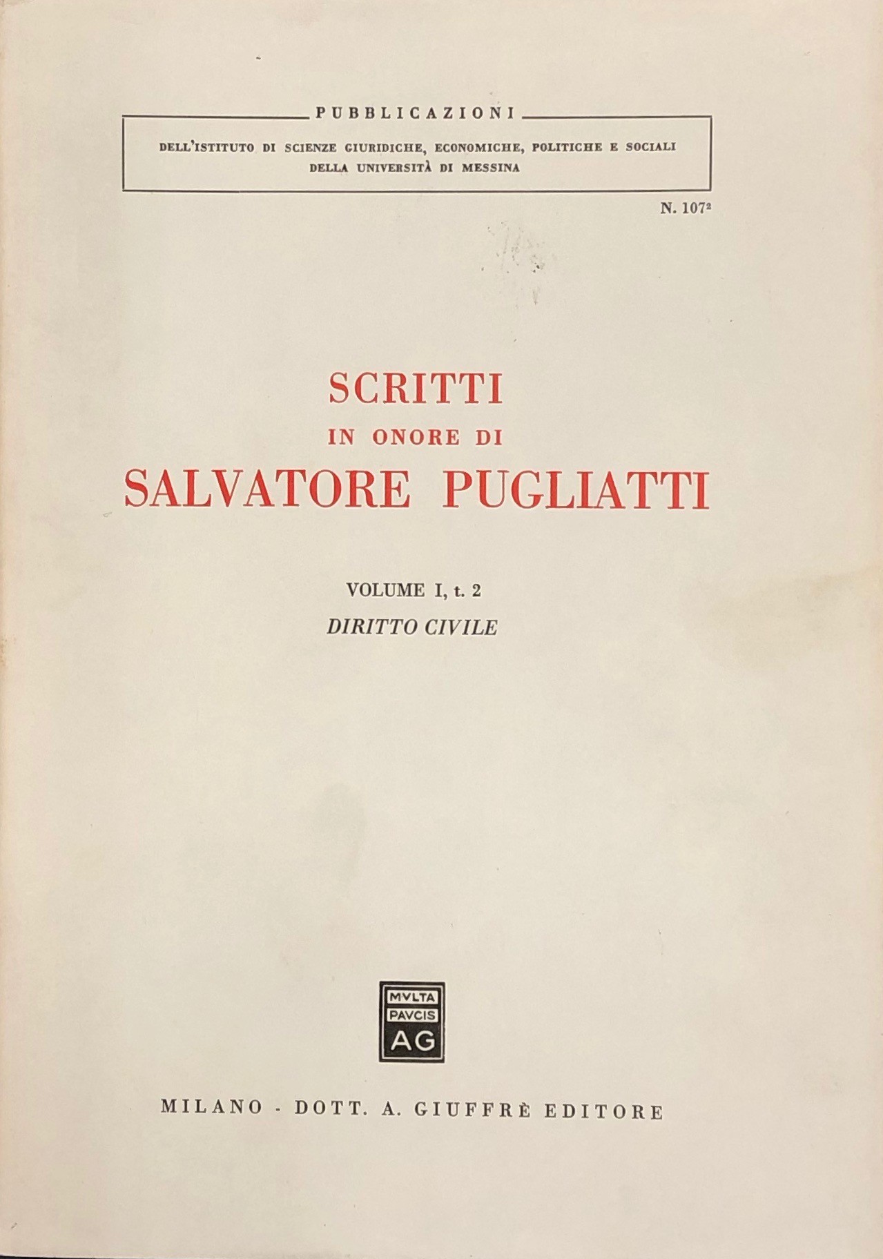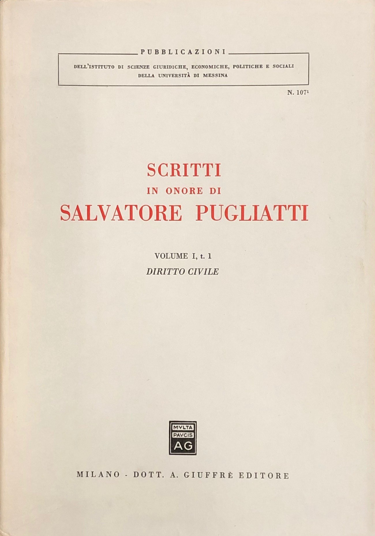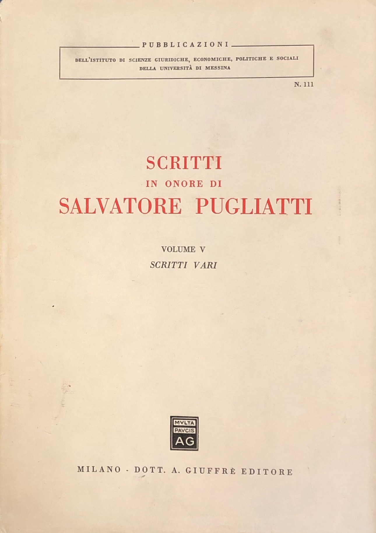 Scritti in onore di Salvatore Pugliatti. Vol. I,1 - Diritto civile; Vol. I,2 - Diritto civile; Vol. II - Diritto commerciale e del lavoro; Vol. III - Diritto pubblico; Vol. IV - Scritti storico-filosofici; Vol. V - Scritti vari