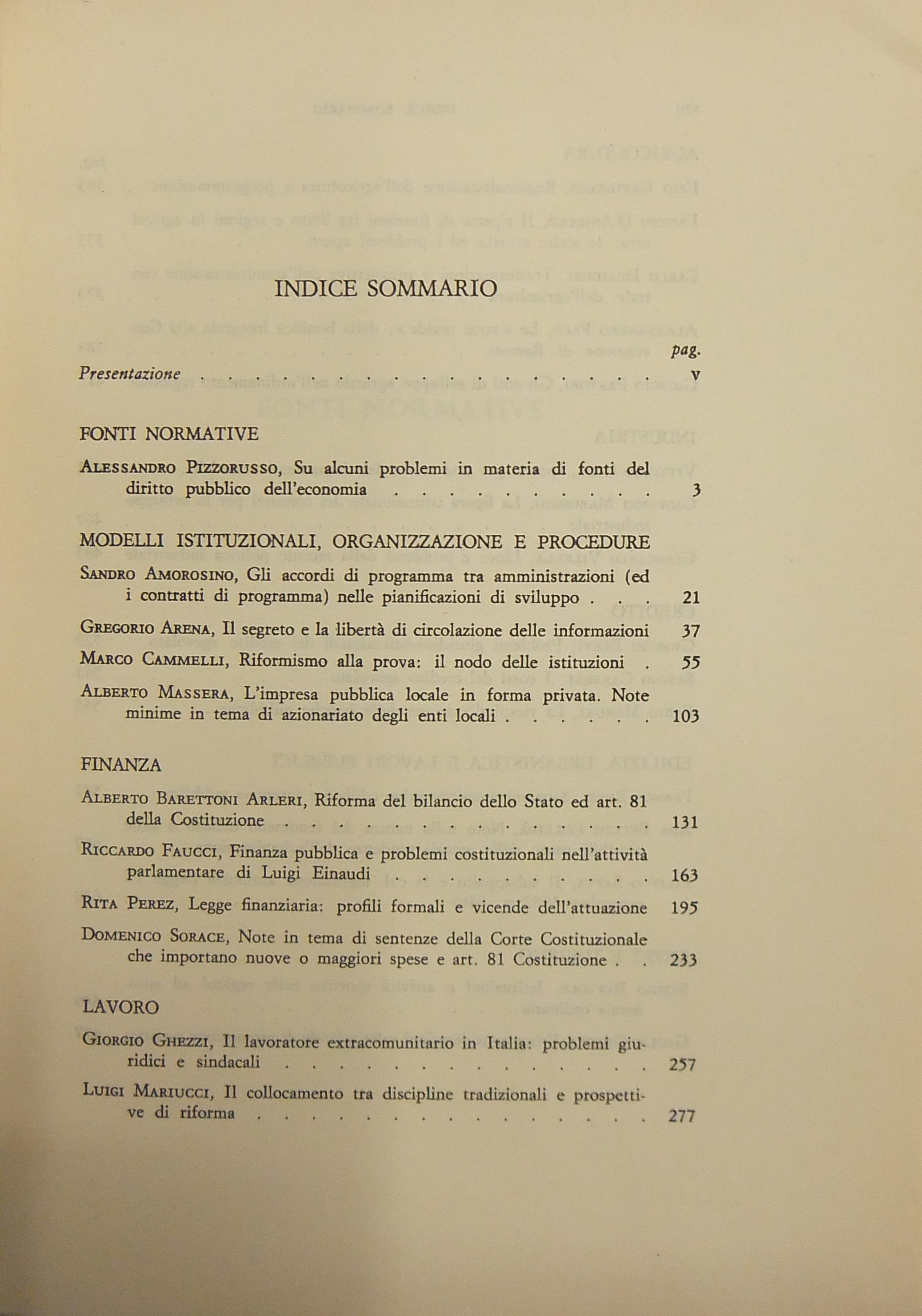 Scritti di: Arena, Amorosino, Barettoni Arleri, Bartole, Bassi, Becchi Collidà, Berti, Cammelli, Capizzano, Cassese S., Coda, D'Aniello, Desideri, Faucci, Ghetti, Ghezzi, Mariucci, Marongiu, Massera, Merusi, Pace, Pastori, Perez, Pizzorusso, Satta F., Sorace, Vilella