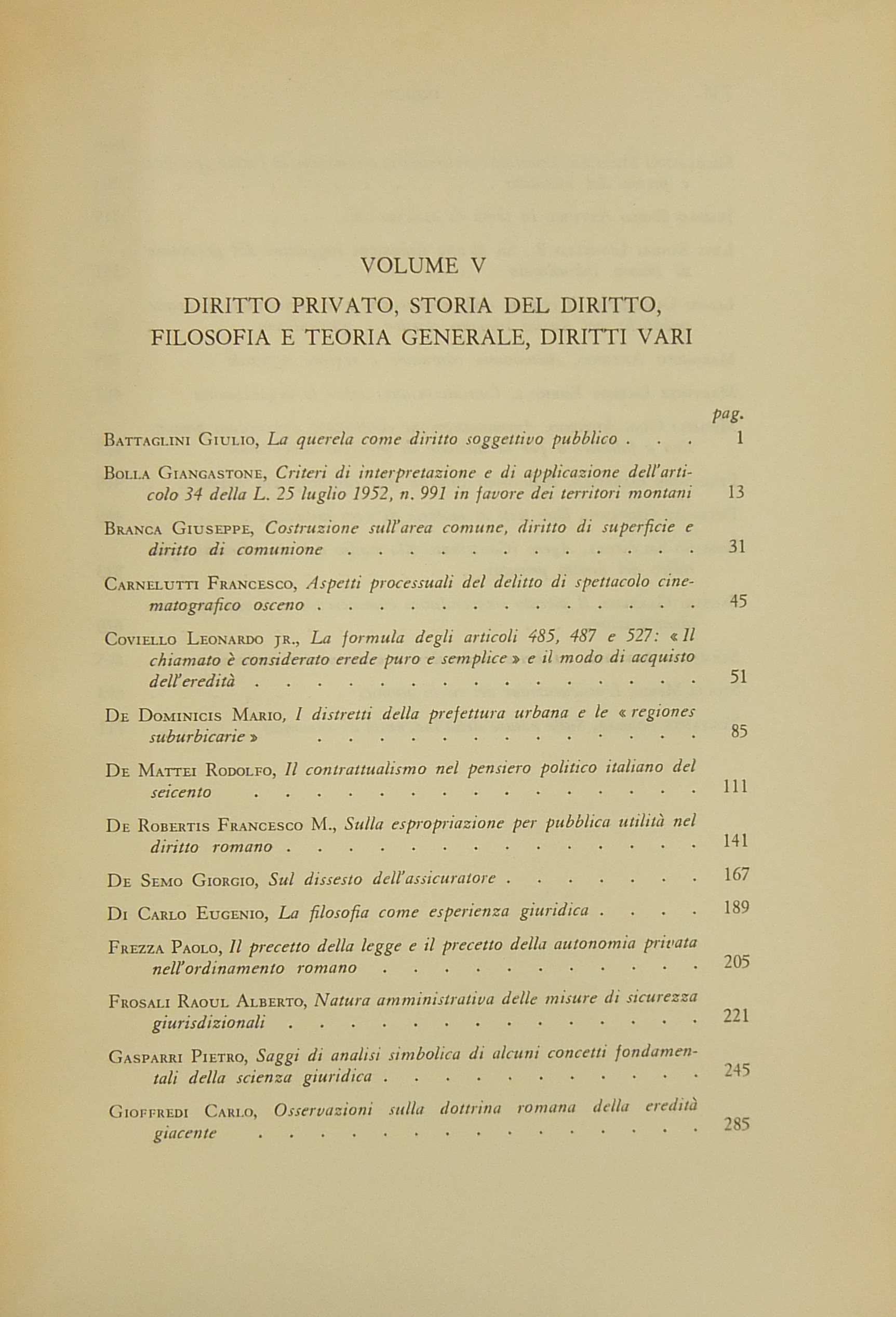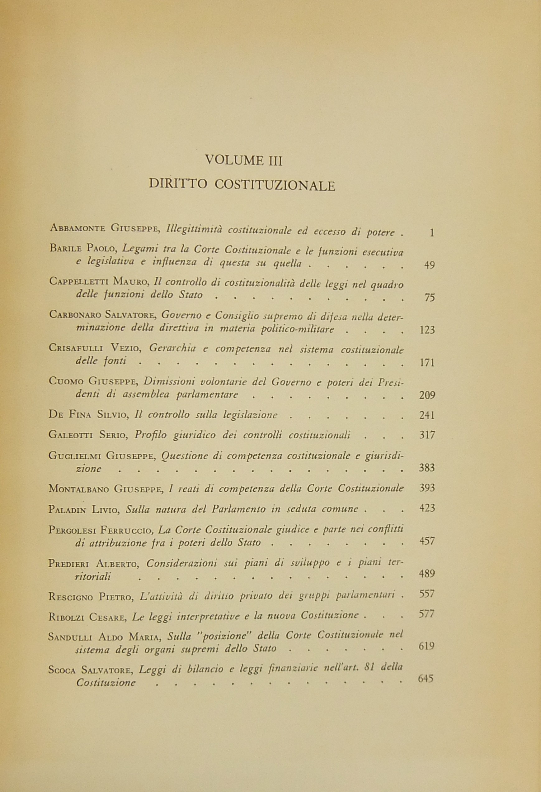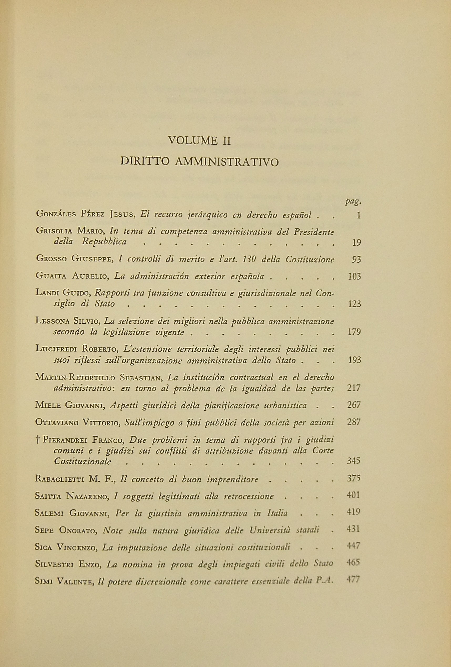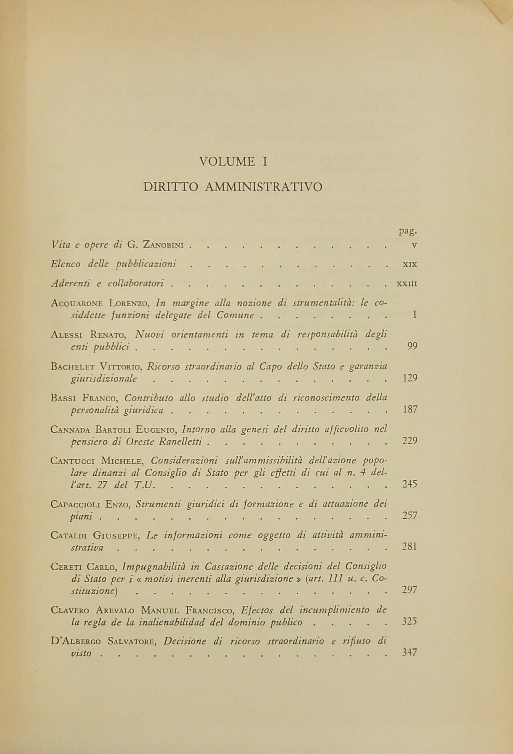 Ritratto fotografico di Guido Zanobini ad inizio del primo volume. Scritti di: Abbamonte, Acquarone, Alessi, G. Ambrosini, Bachelet, P. Barile, Bassi, Battaglini, Biscaretti di Ruffia, Biscottini, Bolla, Bosco, Branca, Cannada Bartoli, Cantucci, Capaccioli, Cappelletti, Capotorti, Carbonaro, Carnelutti, Casetta, Cataldi, Cereti, Cervati, Clavero Arevalo, Cocivera, Coviello jr., V. Crisafulli, Cuomo, S. D’Albergo, D’Avack, De Dominicis, De Fina, De Mattei, De Robertis, De Semo, De Valles, V. Del Giudice, Di Carlo, Entrena Cuesta, Fedele, Franchini, Frezza, Frosali, Galateria, Galeotti, Garcia de Enterria, Garcia Trevijano y Fos, Garrido Falla, Gasparri, Giacchi, Giacobelli, A. Giannini, M.S. Giannini, Gioffredi, M. Giorgianni, Gismondi, Gonzales Peres, Grisolia,G. Grosso, Guaita, Guglielmi, Jemolo, Landi, Lavagna, Lessona, Levi Sandri, Longo, Lucifredi, Marongiu, Martin Retortillo, Martinez Useros, Micheli, G. Miele, M. Miele, R. Monaco, Montalbano, Ottaviano, Paladin, Pergolesi, G. Pescatore, Pierandrei, Predieri, Provinciali, G. Pugliese, Rabaglietti, P. Rescigno, Ribolzi, Salvatore Romano, Saitta, Salemi, A.M. Sandulli, Santini, Scoca, Sepe, Sermonti, Sica, Silvestri, Simi, Spadari, Spinelli, G. Stolfi, M. Stolfi, Tesauro, Torrente, G. Treves, Udina, Vignocchi,Vitta