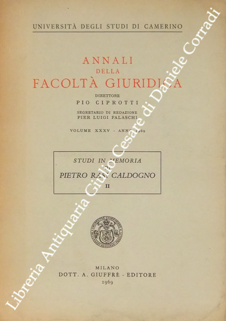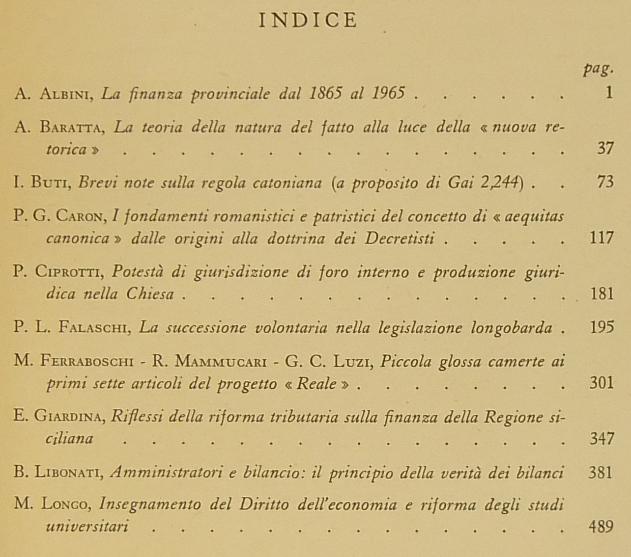 Scritti di: Albini, Baratta, Buti, Caron, Ciprotti, Crosara, Falaschi, Ferraboschi, Giardina, Libonati, Longo, Lucarelli, Marchello, Palazzolo, Pannain, Perlingieri, Pettoello Mantovani, Provera, Quadri, Querci, Romagnoli, Ruini.