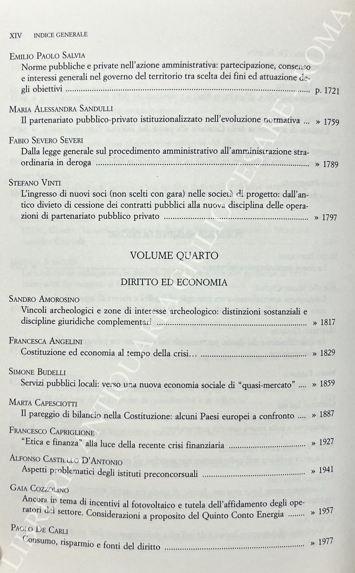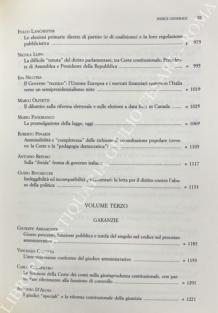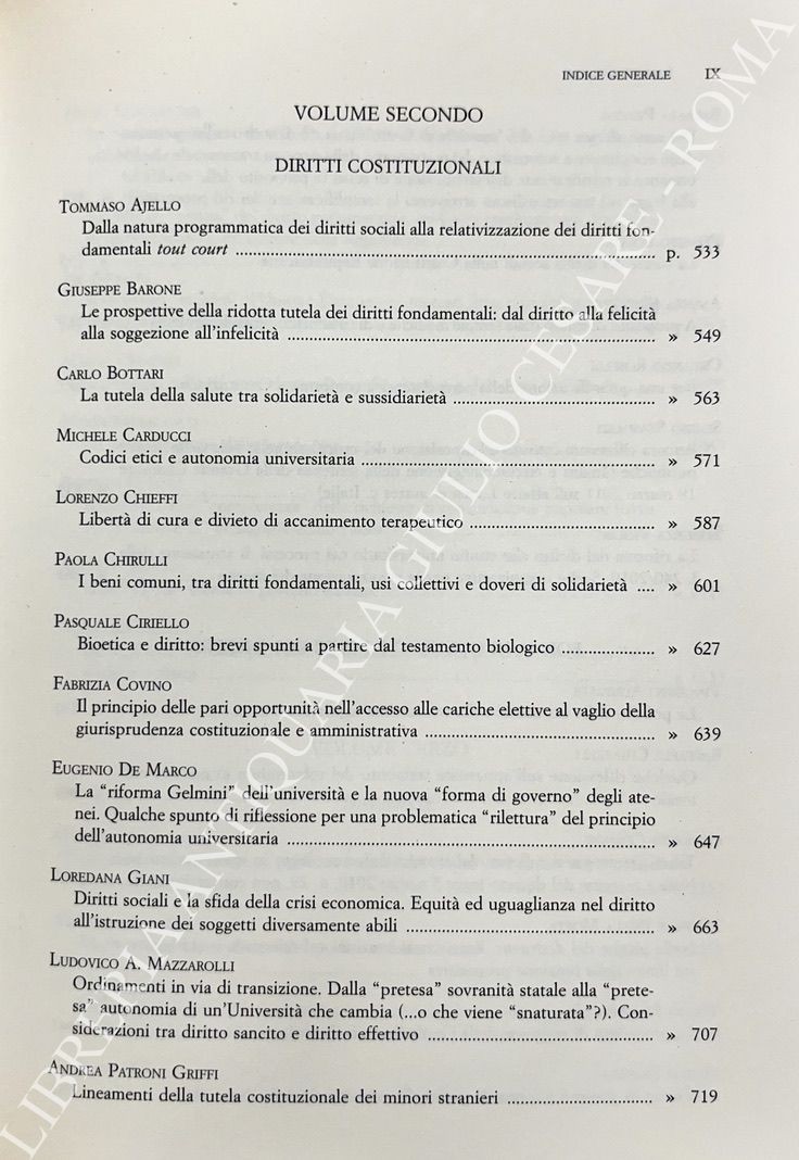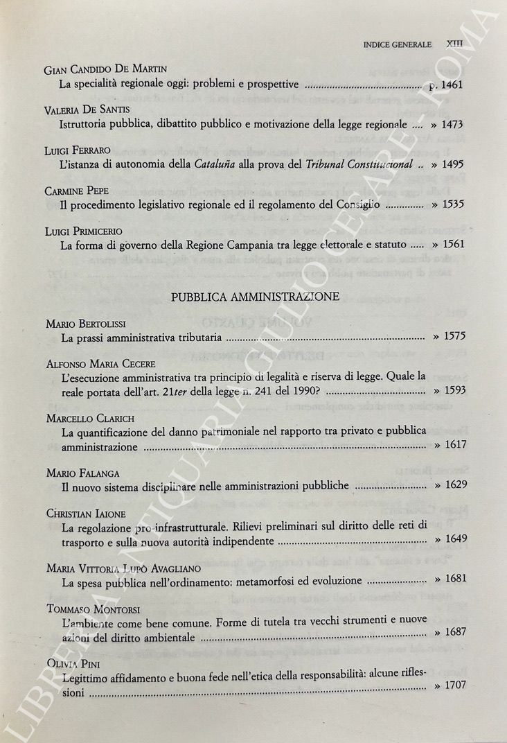 Scritti di: Abbamonte, Ajello, Amorosino, Angelini, Apostoli, Atripaldi, Baroncelli, Barone, Bellomia, Benvenuti, Bertolissi, Bifulco, Bilancia, Bottari, Budelli, Capesciotti, Capriglione, Caranta, Carducci, Castiello D’Antonio, Catelani, Cecere, Cervati, Chiarelli, Chieffi, Chirulli, Ciriello, Clarich, Cocco, Cocozza, Coduti, Colapietro, Cordini, Covino, Cozzolino, D’Aloja, D’Andrea, De Carli, De Marco, De Martin, De Nardi, De Santis, Degrassi, Della Morte, Falanga, Federici, Fenucci, Ferrara, Ferraro, Fiorenzano, Fontanarosa, Fracanzani, Franchini, Furno, Giachetti Franchini, Giani, Grasso, Grossi, Guarino, Iaione, Illari, Lamberti, Lanchester, Loiodice, Lotito, Lucarelli, Lupo, Lupò Avagliano, Manfrellotti, Marotta, Mattioni, Mauriello, Mazzarolli, MiccĂą, Montorsi, Morbidelli, Niccolai, Nicotra, Olivetti, Panebianco, Paparella, Patroni Griffi, Pegoraro, Pepe, Pezzini, Pinardi, Pini, Politi, Porena, Primicerio, Prisco, Reposo, Revedin, Ridolfi, Rivosecchi, Roselli, Rozo Acuna, Salvia, Sandulli, Saporito, Scudiero, Severi, Siclari, Stammati, Stipo, Tesauro, Tizzano, Tondi Della Mura, Vari, Vinti, Violini, Zatti