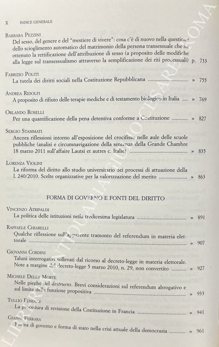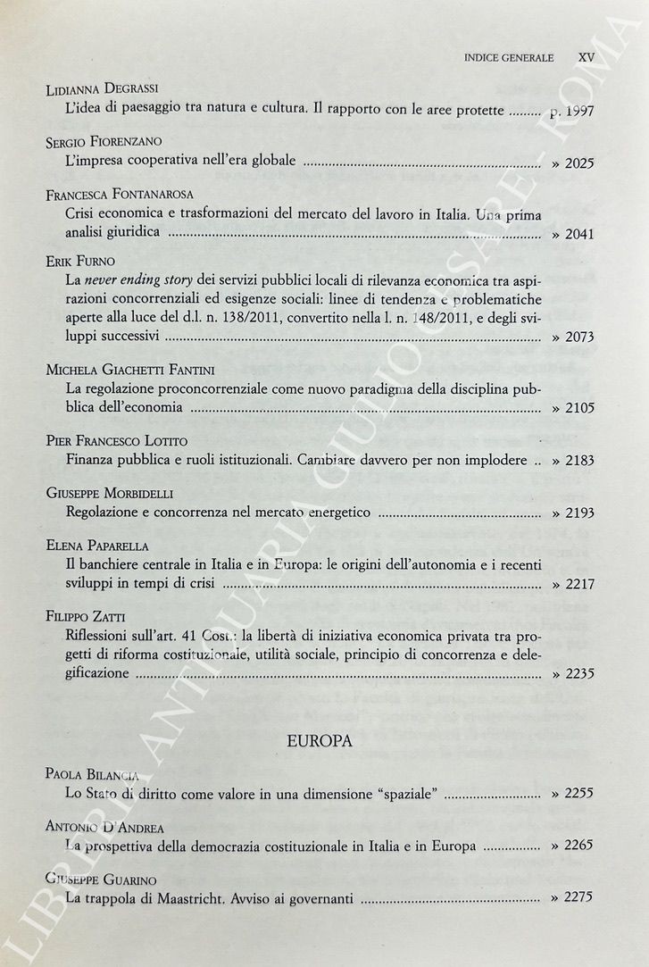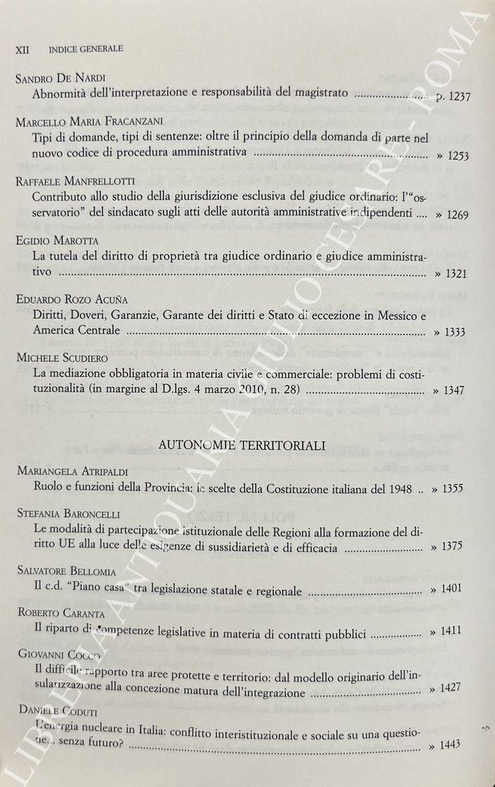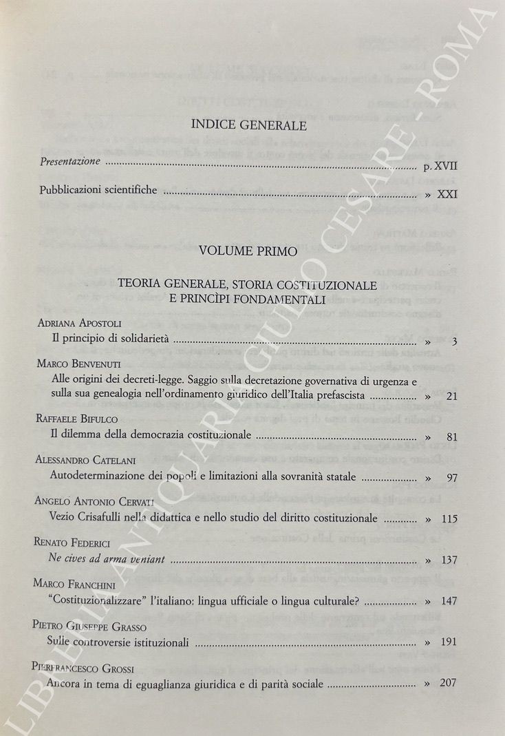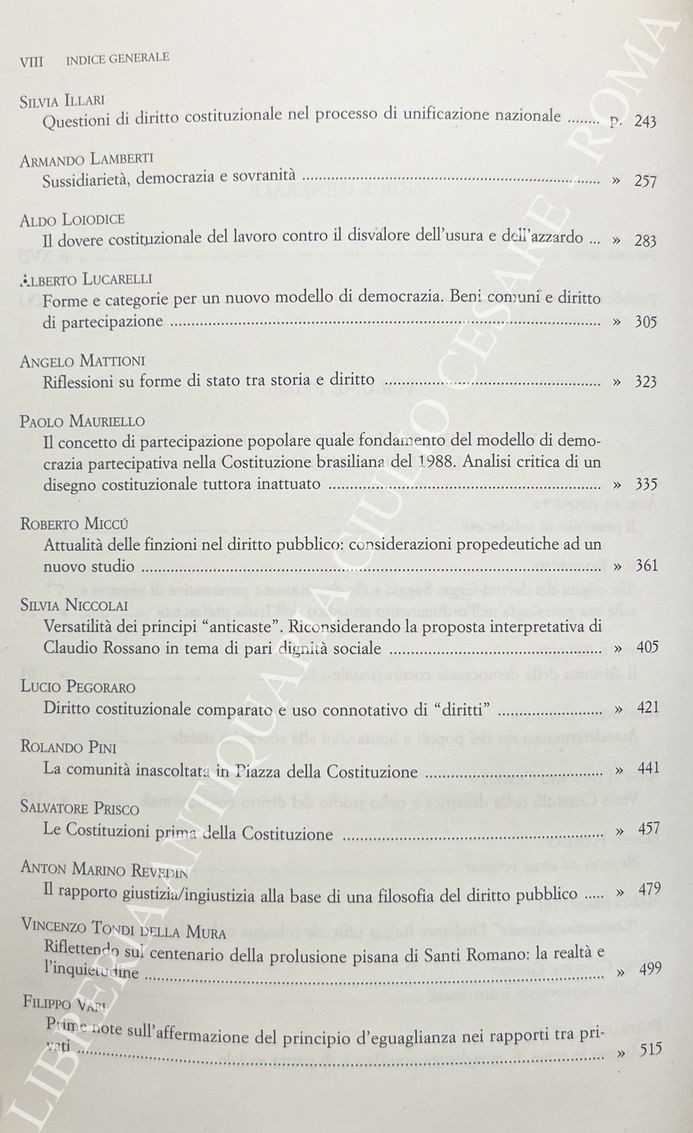 Scritti di: Abbamonte, Ajello, Amorosino, Angelini, Apostoli, Atripaldi, Baroncelli, Barone, Bellomia, Benvenuti, Bertolissi, Bifulco, Bilancia, Bottari, Budelli, Capesciotti, Capriglione, Caranta, Carducci, Castiello D’Antonio, Catelani, Cecere, Cervati, Chiarelli, Chieffi, Chirulli, Ciriello, Clarich, Cocco, Cocozza, Coduti, Colapietro, Cordini, Covino, Cozzolino, D’Aloja, D’Andrea, De Carli, De Marco, De Martin, De Nardi, De Santis, Degrassi, Della Morte, Falanga, Federici, Fenucci, Ferrara, Ferraro, Fiorenzano, Fontanarosa, Fracanzani, Franchini, Furno, Giachetti Franchini, Giani, Grasso, Grossi, Guarino, Iaione, Illari, Lamberti, Lanchester, Loiodice, Lotito, Lucarelli, Lupo, Lupò Avagliano, Manfrellotti, Marotta, Mattioni, Mauriello, Mazzarolli, MiccĂą, Montorsi, Morbidelli, Niccolai, Nicotra, Olivetti, Panebianco, Paparella, Patroni Griffi, Pegoraro, Pepe, Pezzini, Pinardi, Pini, Politi, Porena, Primicerio, Prisco, Reposo, Revedin, Ridolfi, Rivosecchi, Roselli, Rozo Acuna, Salvia, Sandulli, Saporito, Scudiero, Severi, Siclari, Stammati, Stipo, Tesauro, Tizzano, Tondi Della Mura, Vari, Vinti, Violini, Zatti