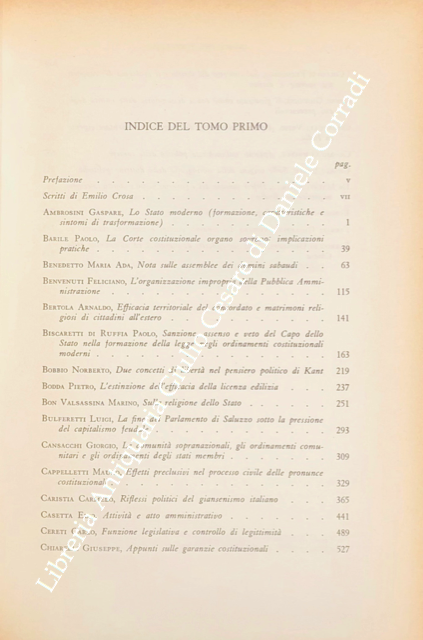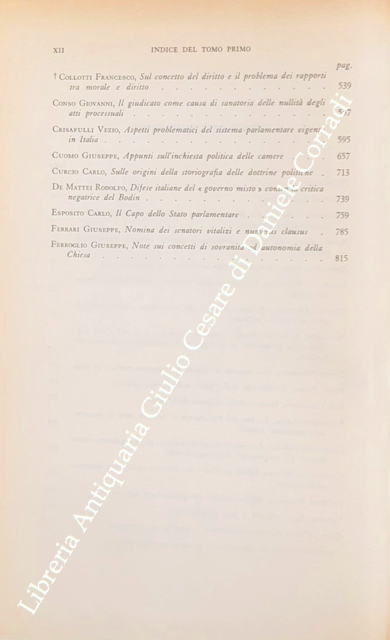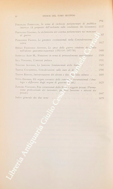 Scritti di: Allara, Ambrosini, Barile, Benedetto, Benvenuti, Bertola, Biscaretti di Ruffia, Bobbio, Bodda, Bon Valsassina, Bulferetti, Cansacchi, Cappelletti, Caristia, Casetta, Cereti, Chiarelli, Collotti, Conso, Crisafulli, Cuomo, Curcio, De Mattei, Esposito, Ferrari, Ferroglio, Firpo, Galeotti, Gallo, Gasparri, Giannini M.S., Gorino Causa, Grosso, Guarino G., Langrod, Lavagna, Marchello, Marongiu, Meynaud, Micheli, Miele G., Monaco R., Mortati, Passerin d'Entreves, Pelloux, Pergolesi, Perticone, Pierandrei, Repaci, Sandulli A.M., Sica, Tesauro, Treves G., Treves R., Vitta, Zangara.